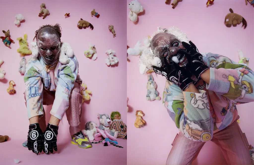 Fleece Martine Rose, trousers Craig Green at matchesfashion.com, shoes and socks Gucci. Teddybear, Thumper bunny, Piglet, Baby Lamb, Old Mouse from Ami Evelyn Huges (GUT magazine) toy collection and Slit, Immortal Joe, Glory and Horse Claire Barrow and Sweetpea Ashley Williams.