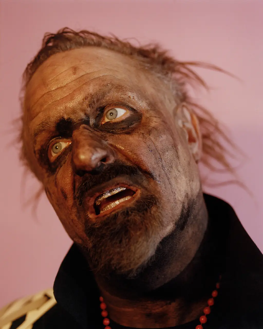 Clown wears suit and shirt Bottega Veneta, masks tied to shirt and blazer Andrew Clwyd at Fantastic Toiles, gloves and masks worn throughout Clown’s own.