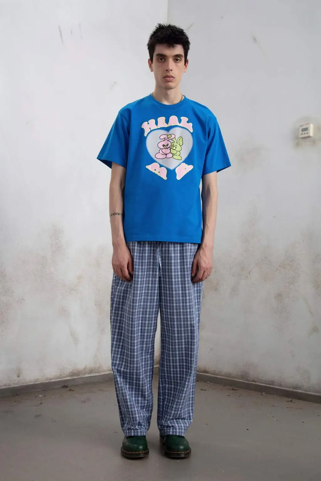 Once staple of the Y2K lot, the slogan tee was a serious staple for speaking with your mouth closed. Before that, even, at the mid-’70s height of punk, the big bad ethos of anti-authority, anti-conformity, anti-anything was given full reign on T‑shirts, with slogans ranging from the political to the seedy and salacious. Internet archives are chock full of grainy shots of punks proclaiming “FUCK YOU HIPPY” and “Beat me, bite me, whip me, fuck me like the dirty pig I am”, shouting with their chests. Oooof.