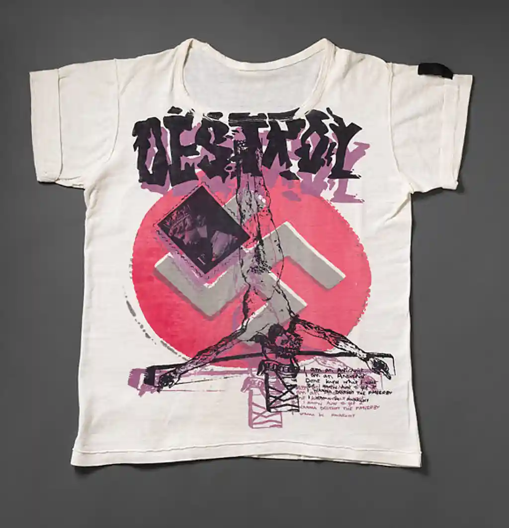 The designer’s most revered (and sought-after eBay archive item), though, is the infamous “Destroy” cotton T‑shirt, which has the image of a swastika as its centrepiece. Designed with her then-partner Malcolm McLaren in 1977, it became an emblem of punk outrage and political socialism, symbolising the fight against the rise of Neo-Nazism in the UK.