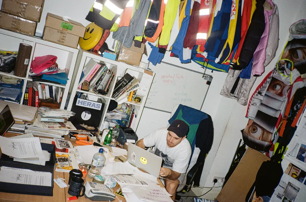 Banger is not your typical fashion designer. He works with a small team, bouncing ideas between himself, art director Dom Ridler and a few others. He sits amongst framed paraphernalia including an old Larry Levan T‑shirt, a certificate naming him a Haringey Hero and a Communication Workers Union T‑shirt. He chain-smokes and talks enthusiastically about pigeons (he recently discovered his granddad, Billy Wright, was a highly rated pigeon fancier). He grew up in Colchester and learned a DIY ethos when he worked in a record shop as a teenager, going on to study music production but not finishing the course. Growing up in Essex, rather than London, gave him a wider point of view, he says. Is that perspective British? Pause, puff on a cigarette. “British it’s a loaded word, isn’t it?” he says. “[But] if you show a lot of this work to anyone that’s not British, people wouldn’t get it… I like this Britain in here. I wouldn’t say I like Britain out there.”