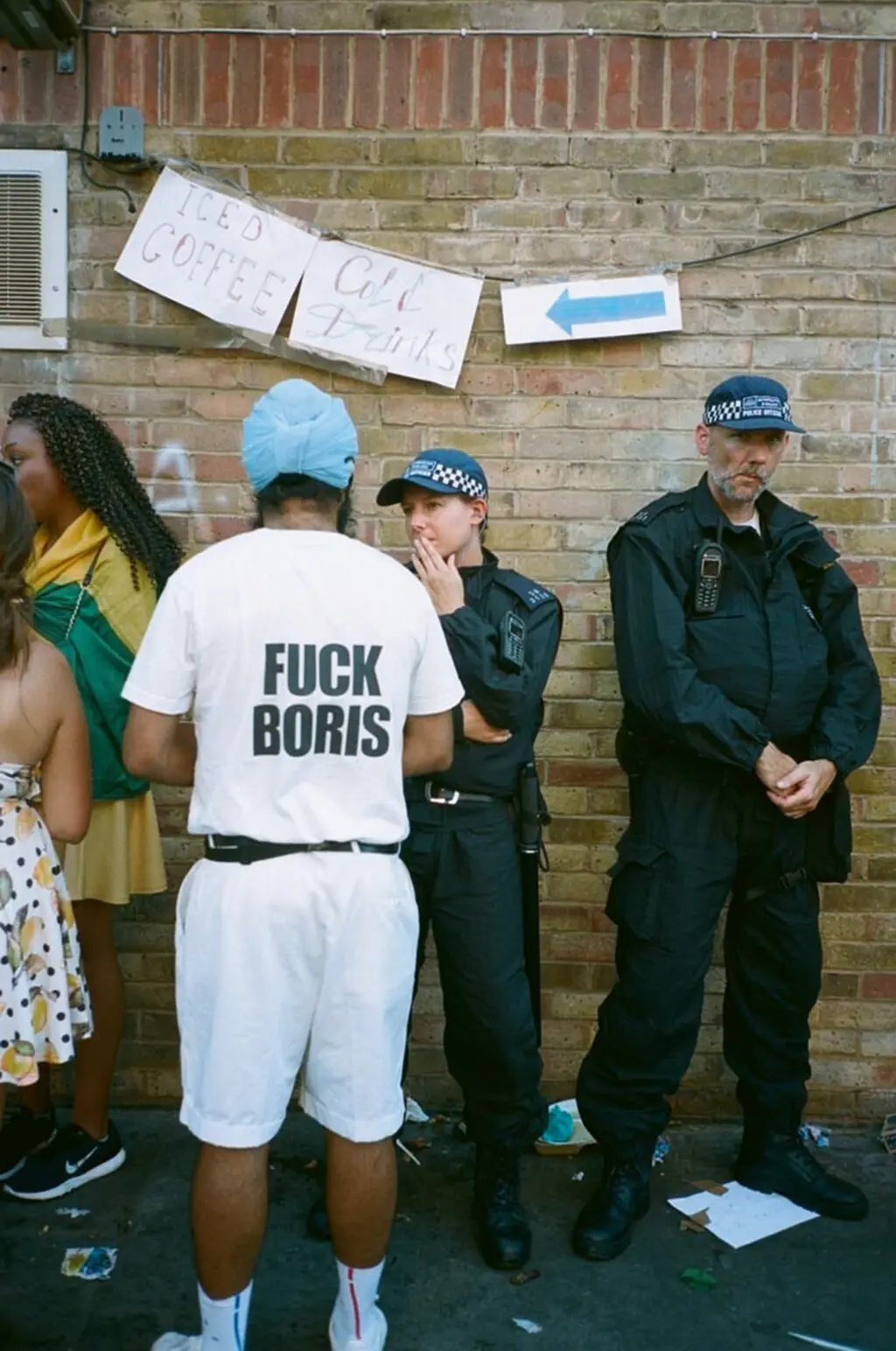 Naturally, Banger’s tees run throughout the book, with a section in the middle cherry-picking the best, each one merging youth culture, class politics, bootleg humour and hedonism. There’s the Tommy Hilfiger logo repurposed to say “London, England”. Or a bandaged-up hand holding a cigarette, dedicated to Josh, a raver who cut his little finger off during a big night but wanted to party on regardless. Another splices Margaret Thatcher with a mounted policeman during the Battle of Orgreave in 1984’s miners’ strike, an upside-down Ralph Lauren Polo horse on the back. Elsewhere, there’s a sideways Reebok logo next to an image of Victoria Beckham circa 1996. Then of course, “FUCK BORIS”, along with the story of how a woman wearing one was told her T‑shirt was “illegal” on a BLM march in 2020.