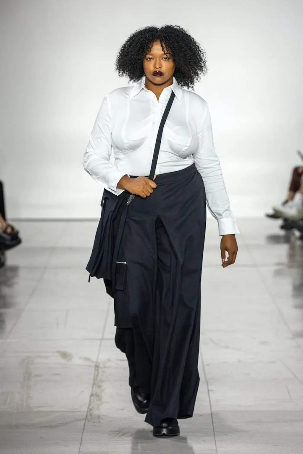 Traditional suiting was given a subversive spin this season, with sharp shoulders, angular lapels and tailored trousers remixed by Newgen designer Sinead O’Dwyer. Looking at stage outfits from classic concerts for reference, she made blazers with visible boob cups, smart black trousers with added zippers and fitted white shirts that felt wickedly punk. Amongst the intricacy of Nensi Dojaka’s delicate dresses, razor-sharp power blazers were thrown on top, while Stella McCartney’s ode to her ’90s party girl past saw waistcoats and low-slung trousers retain modernity.