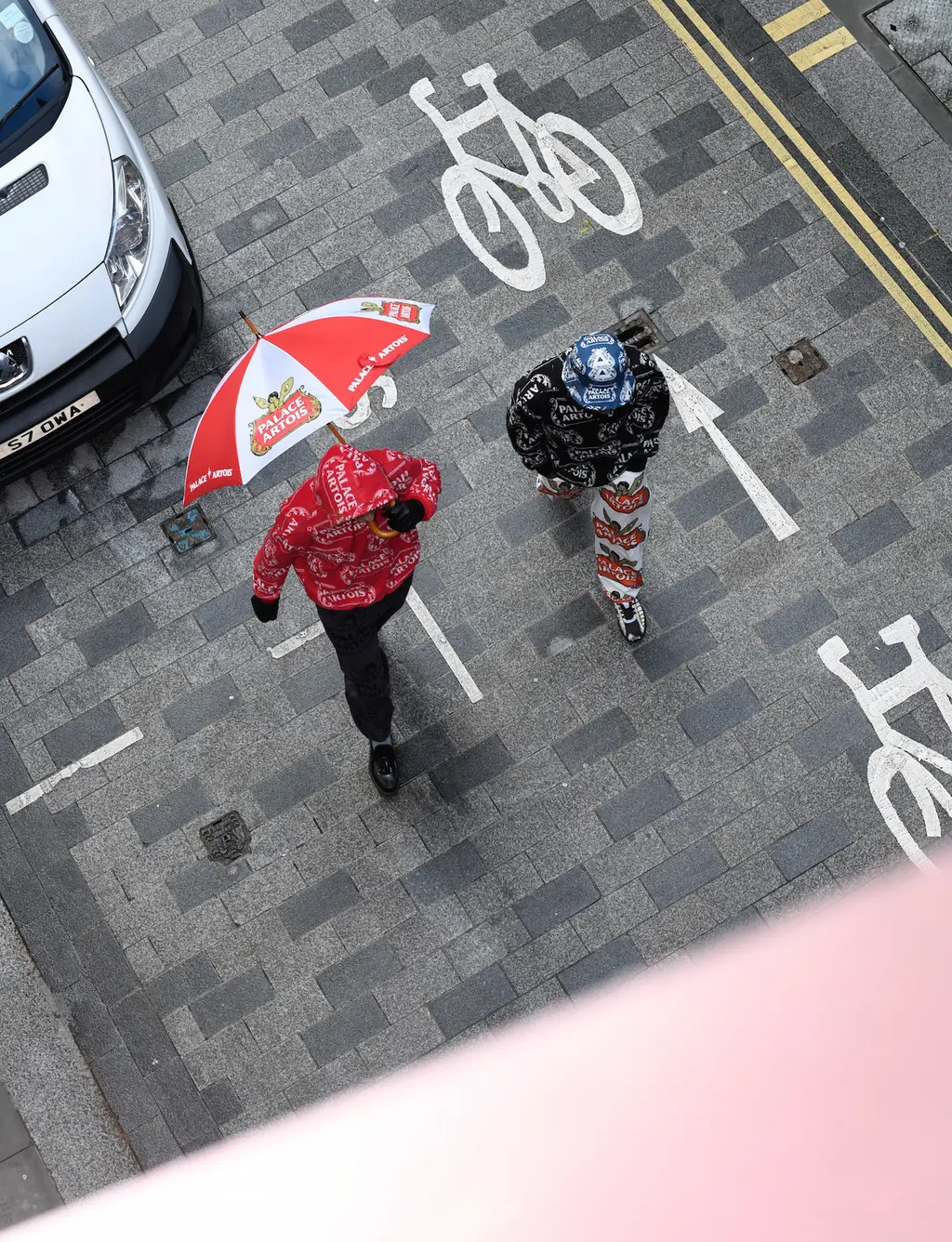 Austin and Kyle wear trousers, hoodie, hat and umbrella PALACE ARTOIS.