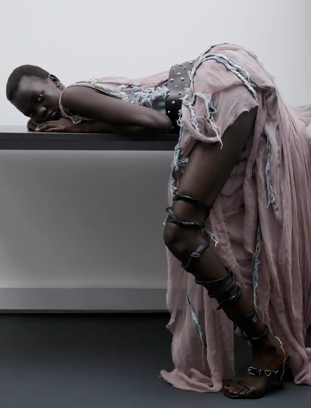 Achol wears dress STELLA MCCARTNEY, hoodie CARHARTT WIP, leotard VERSACE, skirt THE ARC LONDON and belt stylist’s own