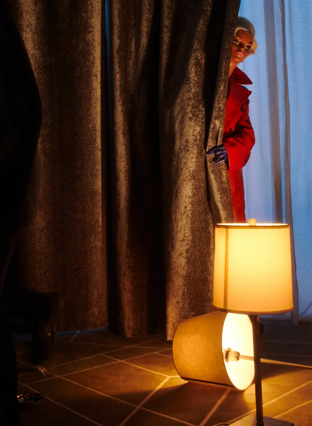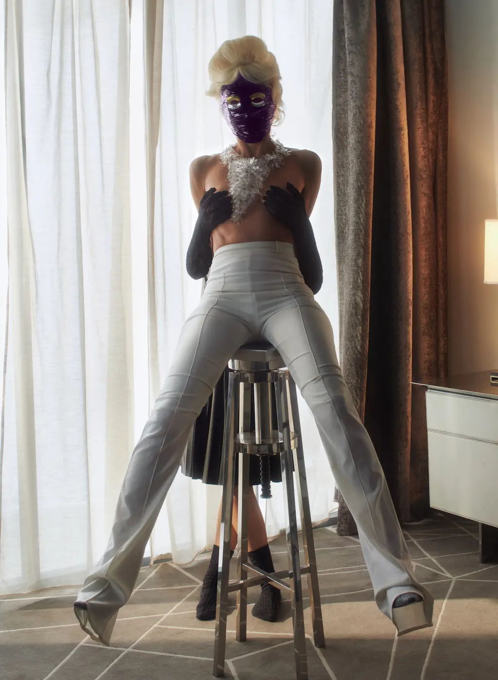 NARCISSISTER wears jacket and trousers BOTTEGA VENETA and gloves ATSUKO KUDO