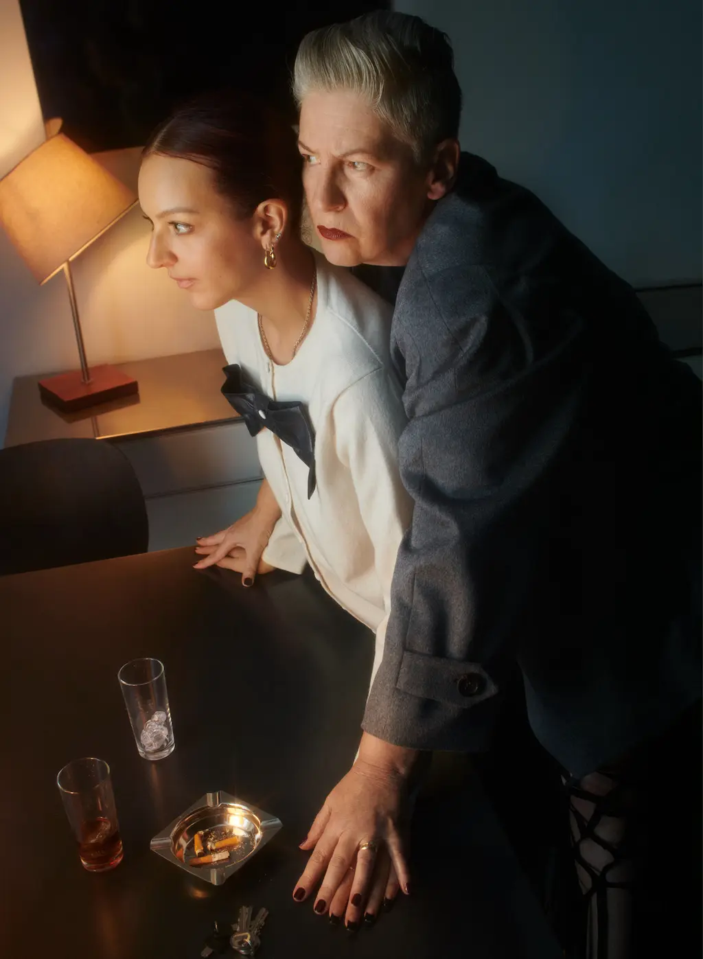 Abbie wears cardigan SUPERYAYA and jewellery talent’s own. Jan wears jacket MIU MIU AT MATCHESFASHION.COM and skirt SACAI