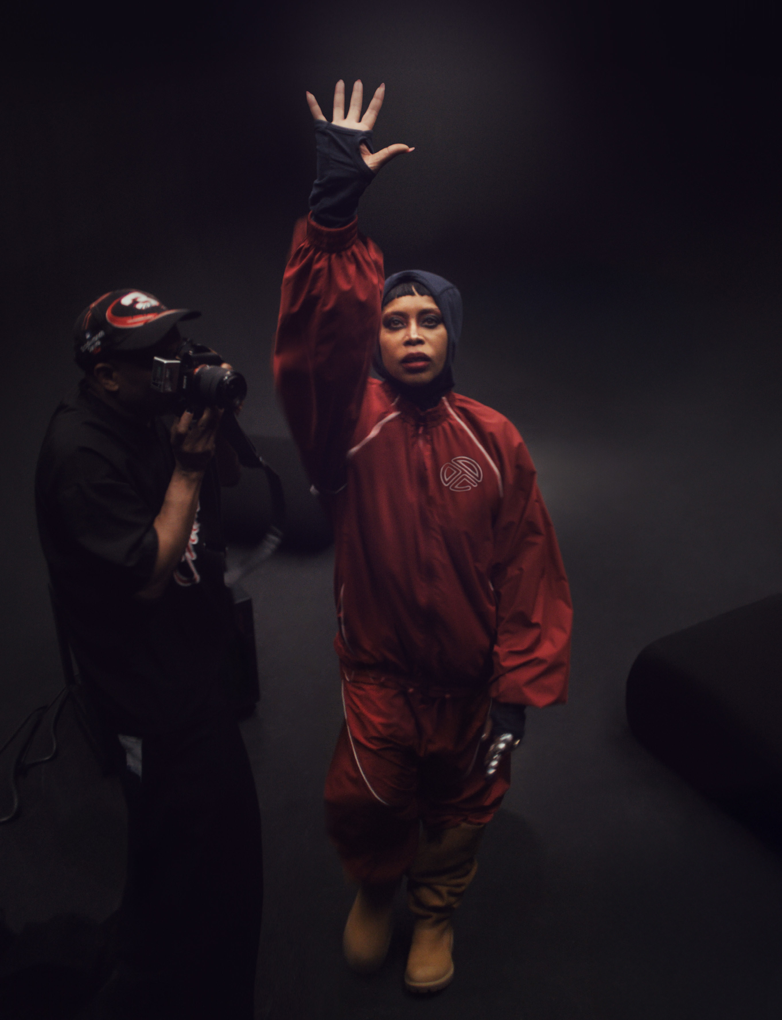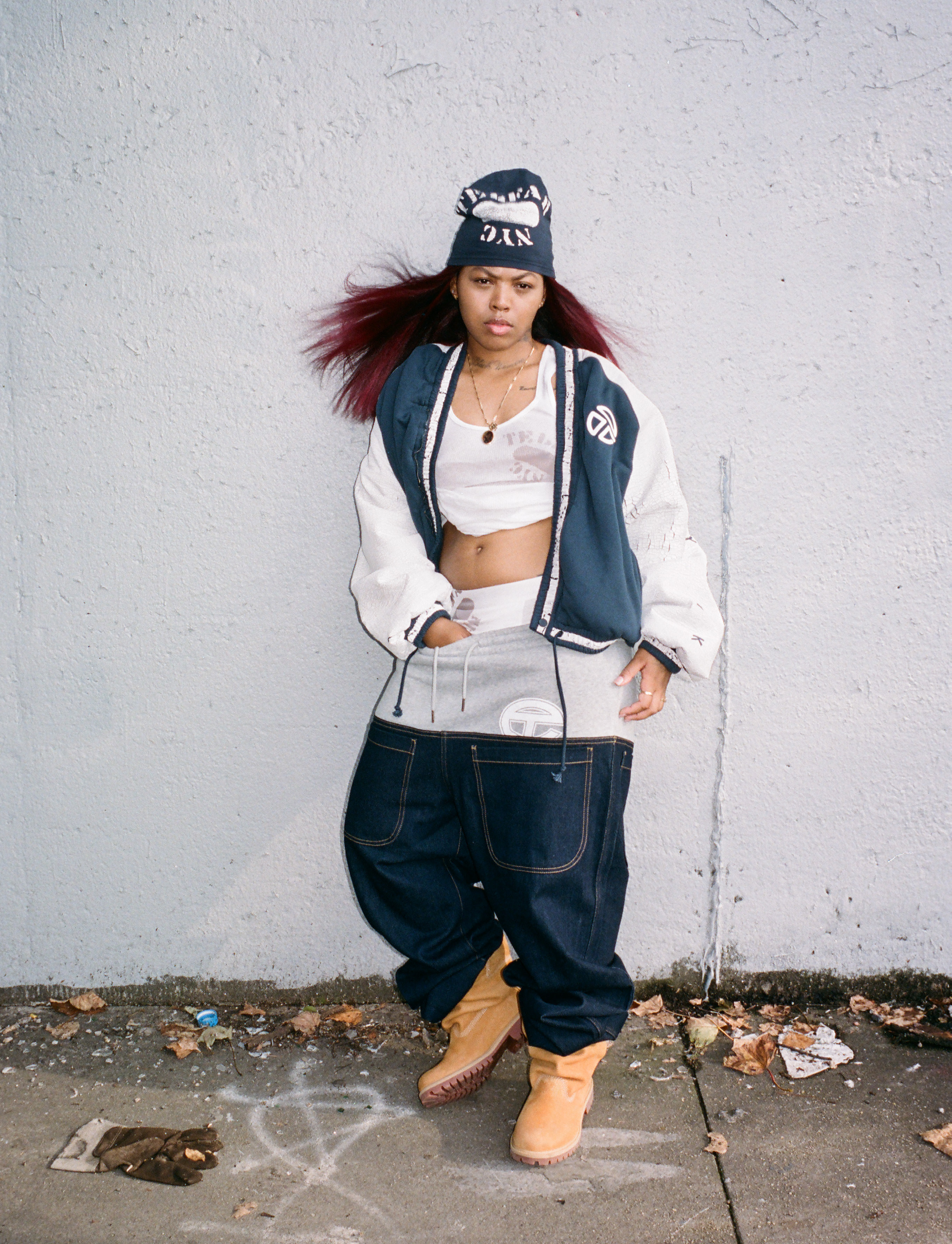 Erykah wears jacket, trousers, hat and snood TELFAR and shoes TIMBERLAND X TELFAR
