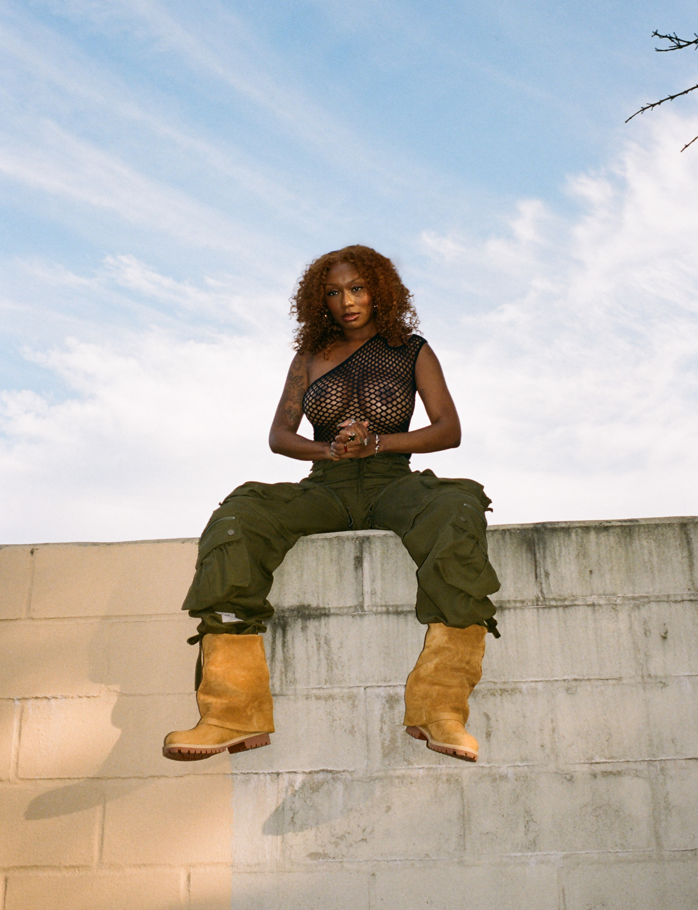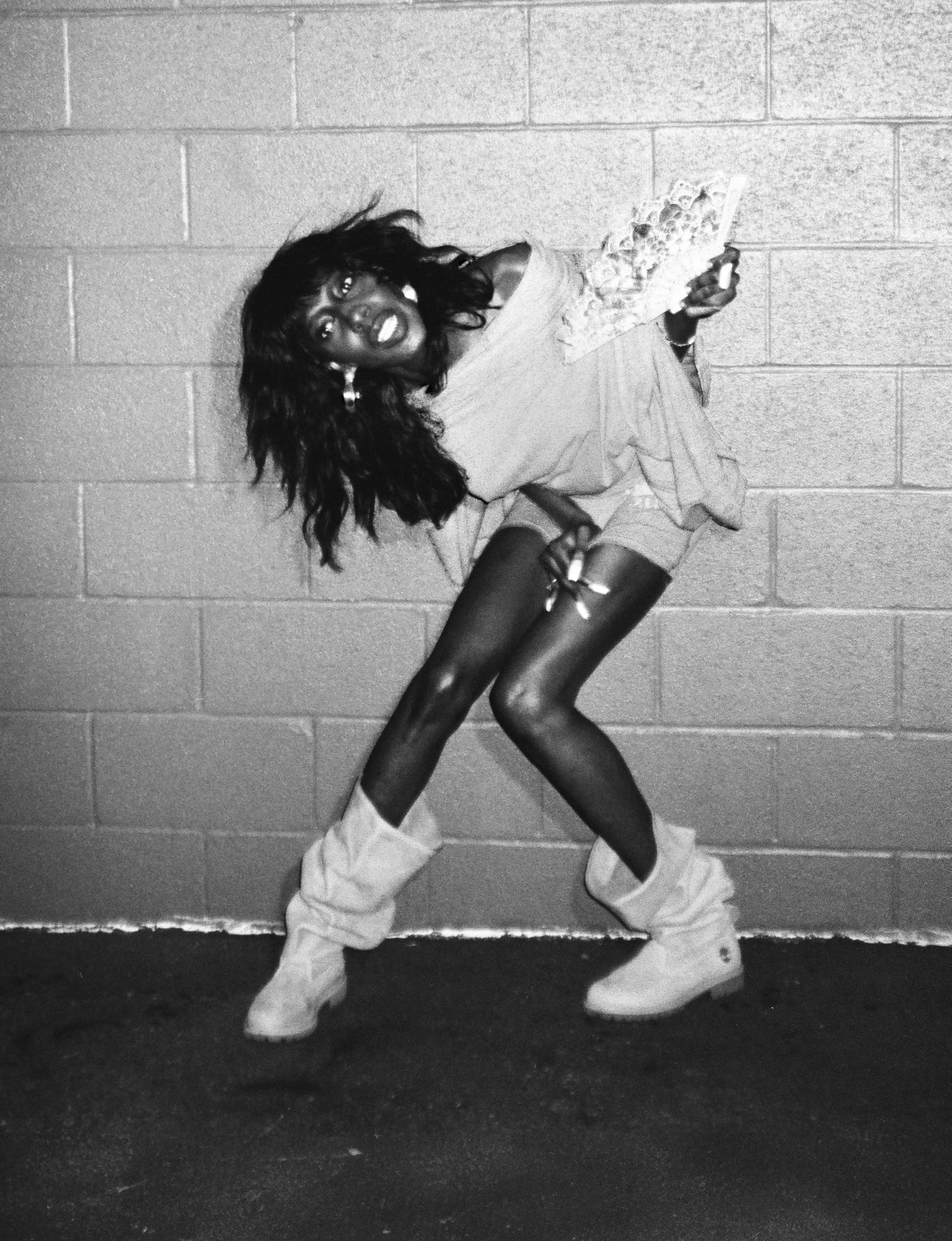 Junglepussy wears top and trousers TELFAR and shoes TIMBERLAND x TELFAR