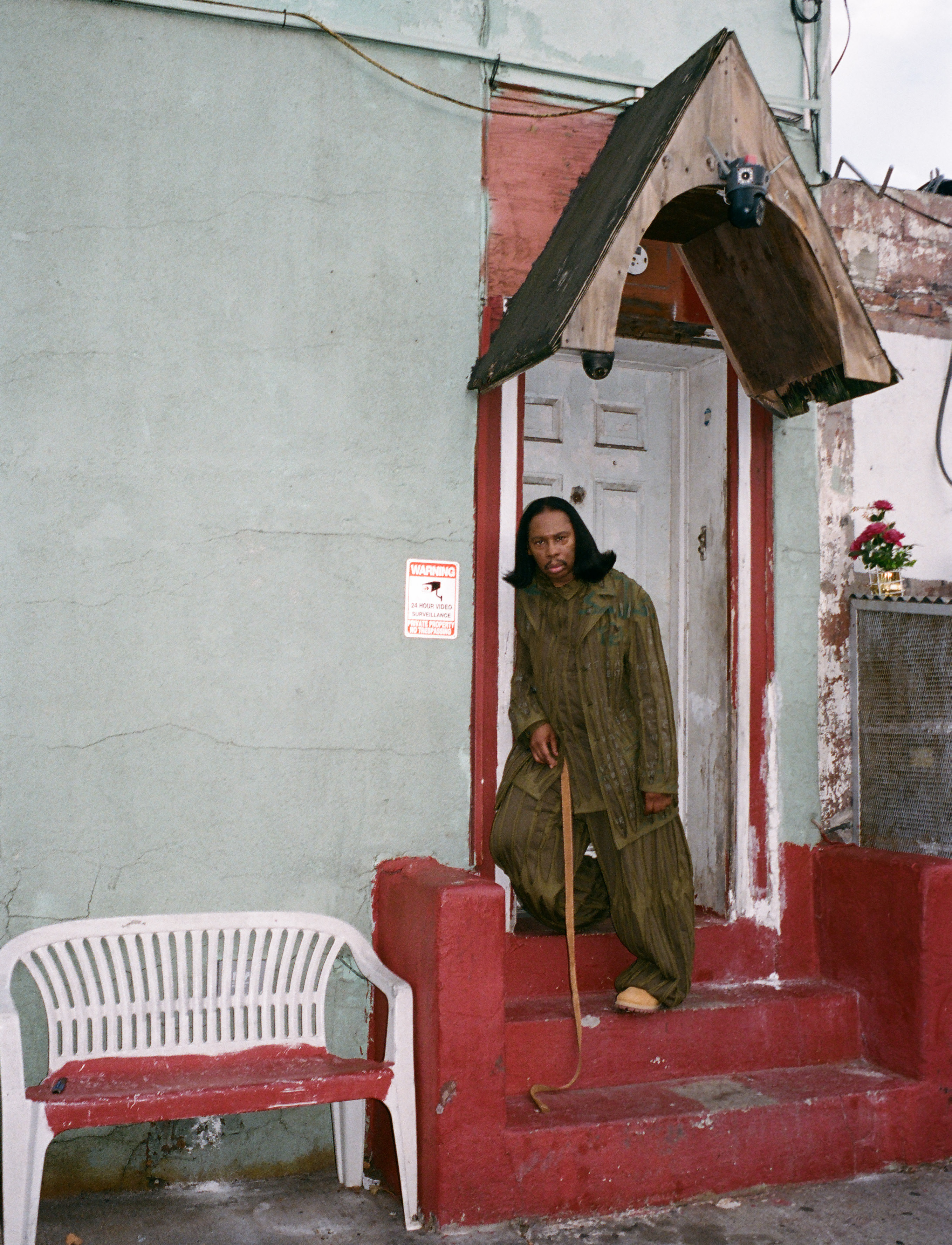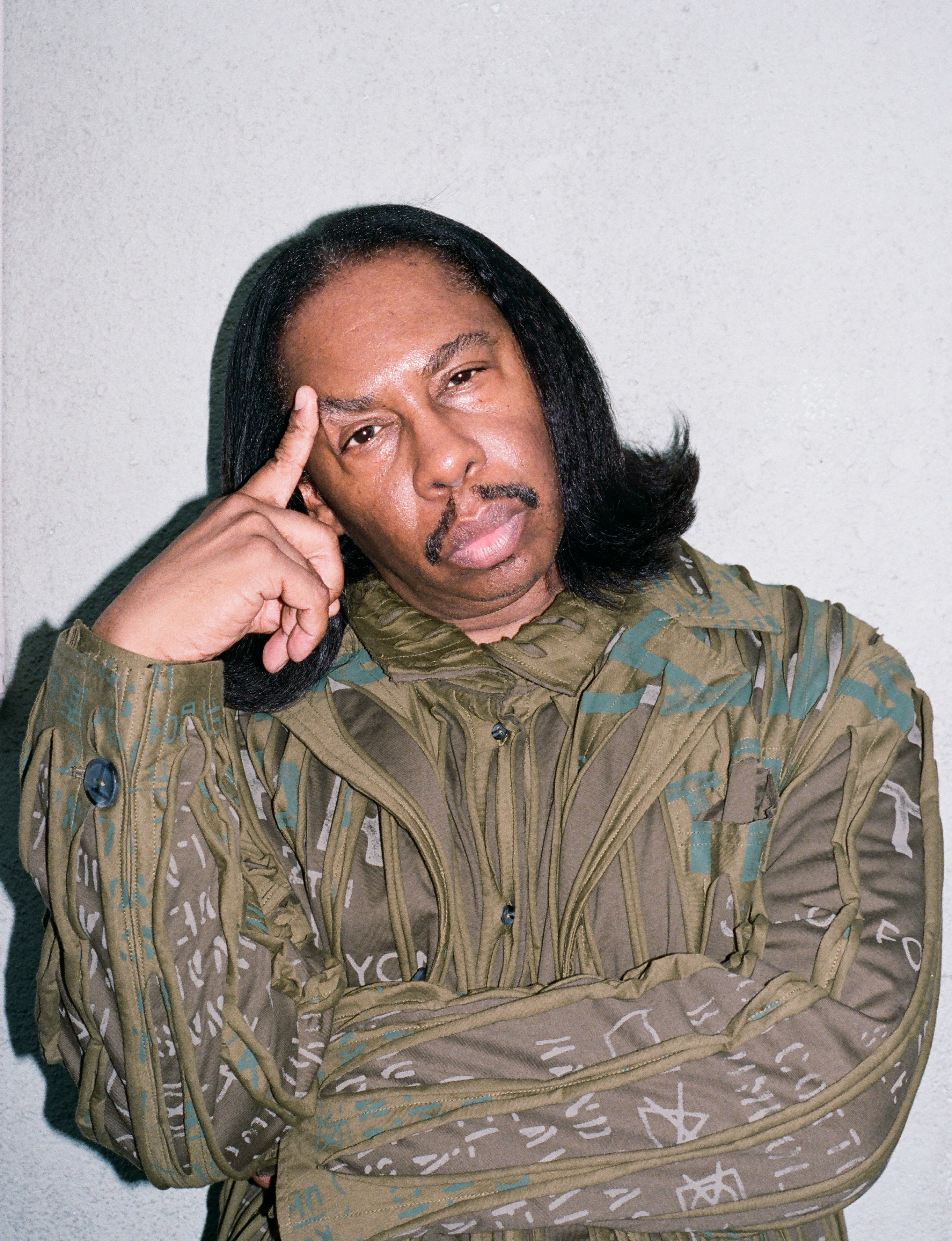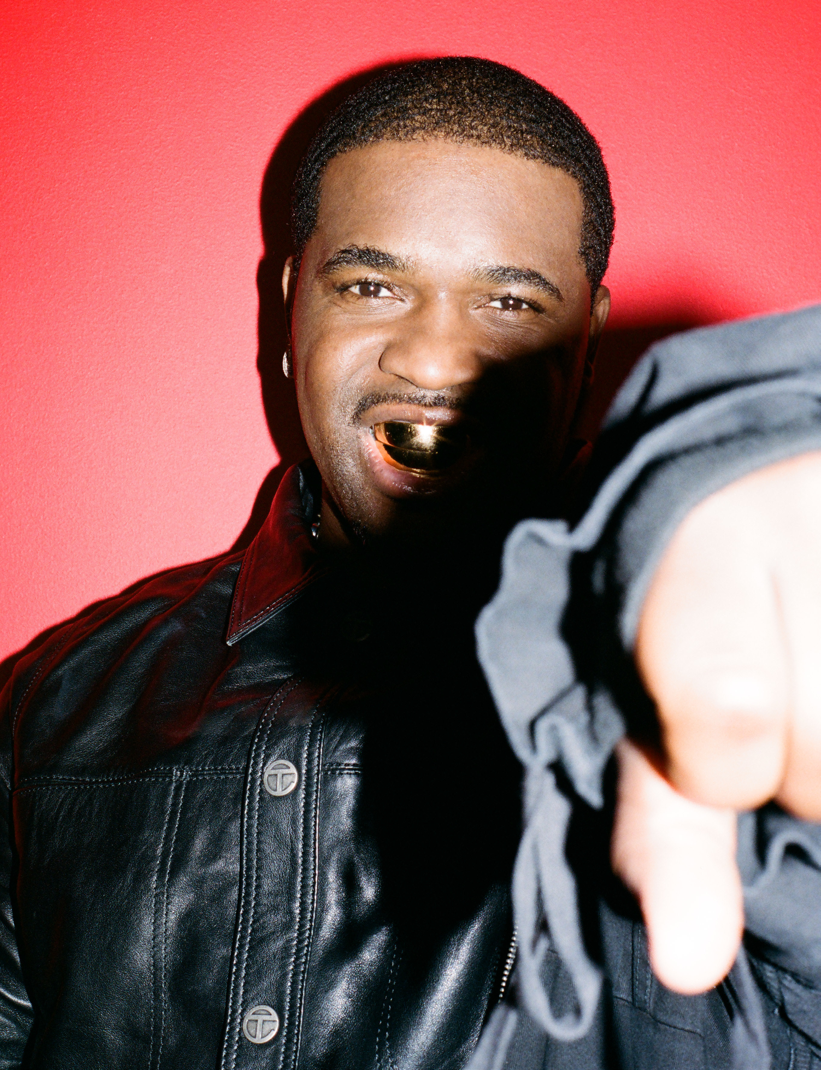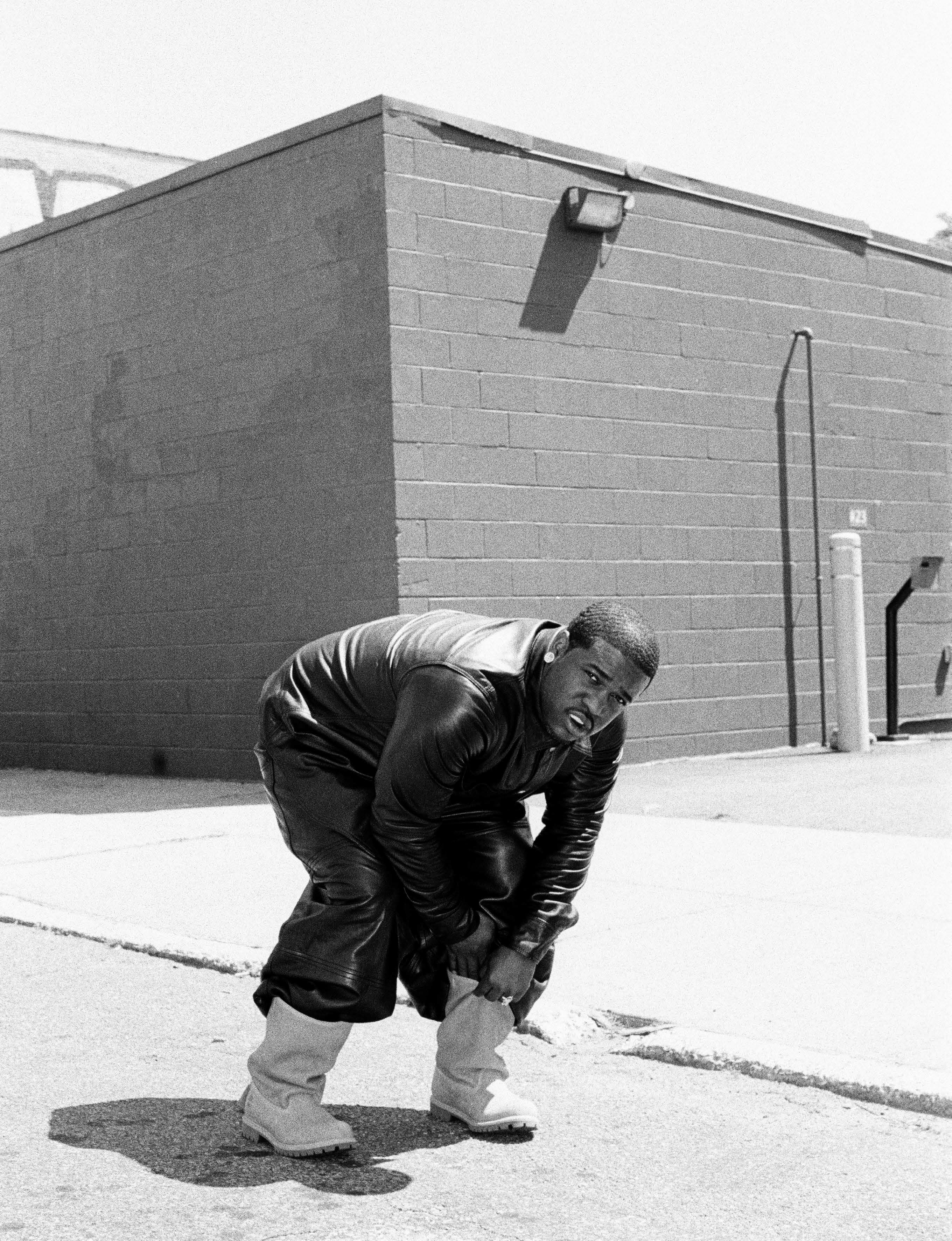 Ferg wears jacket, shirt, trousers and hat TELFAR, shoes TIMBERLAND X TELFAR and earrings and grillz talent’s own