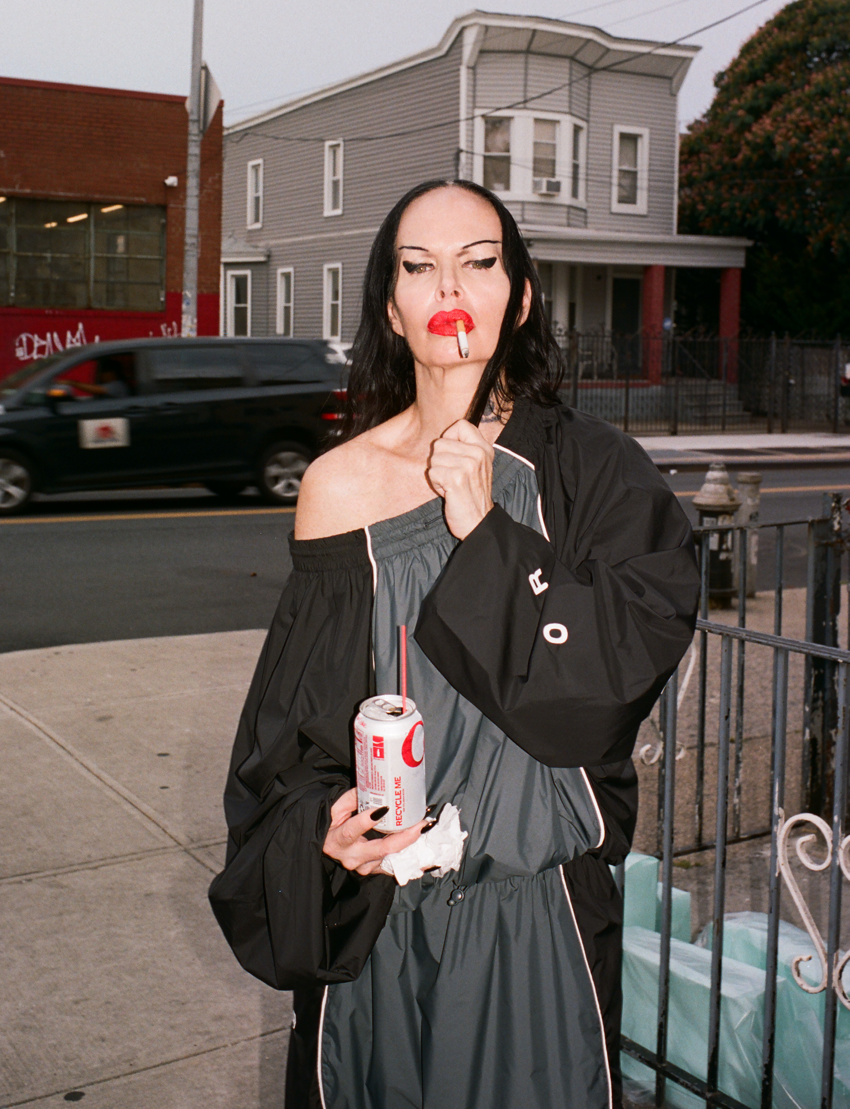 Kembra wears jacket and trousers TELFAR