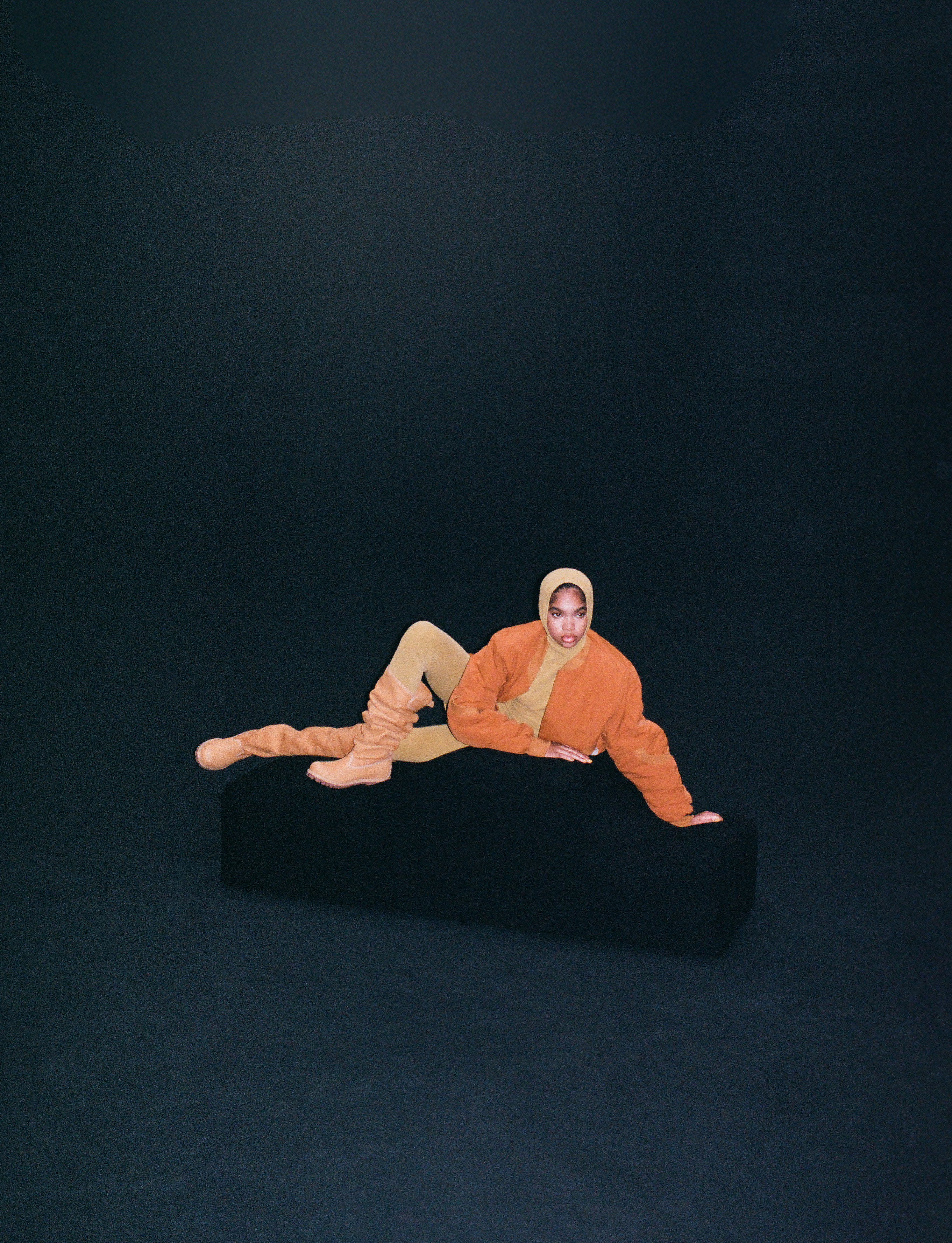 Serenity wears jacket, tunic and leggings TELFAR and shoes TIMBERLAND x TELFAR