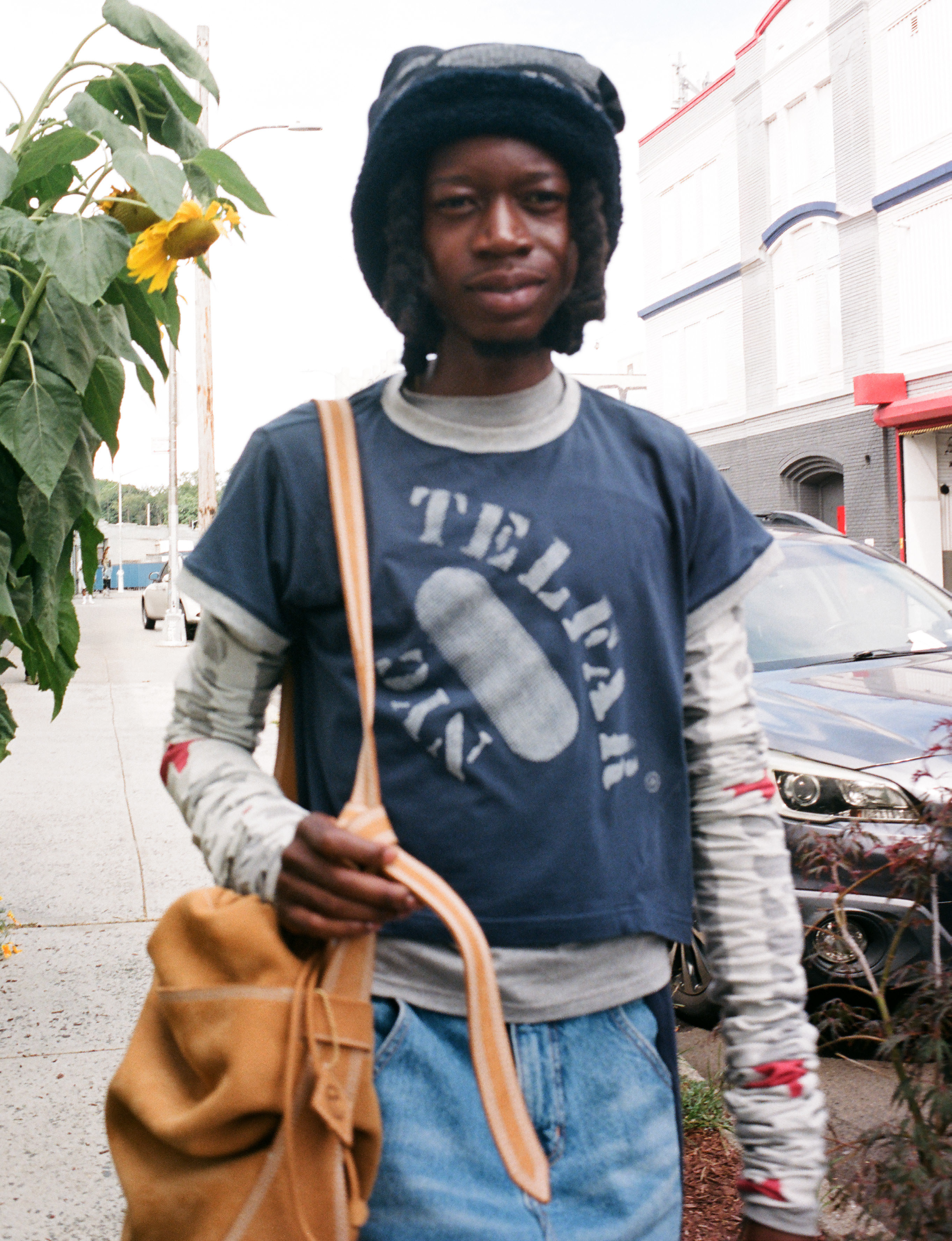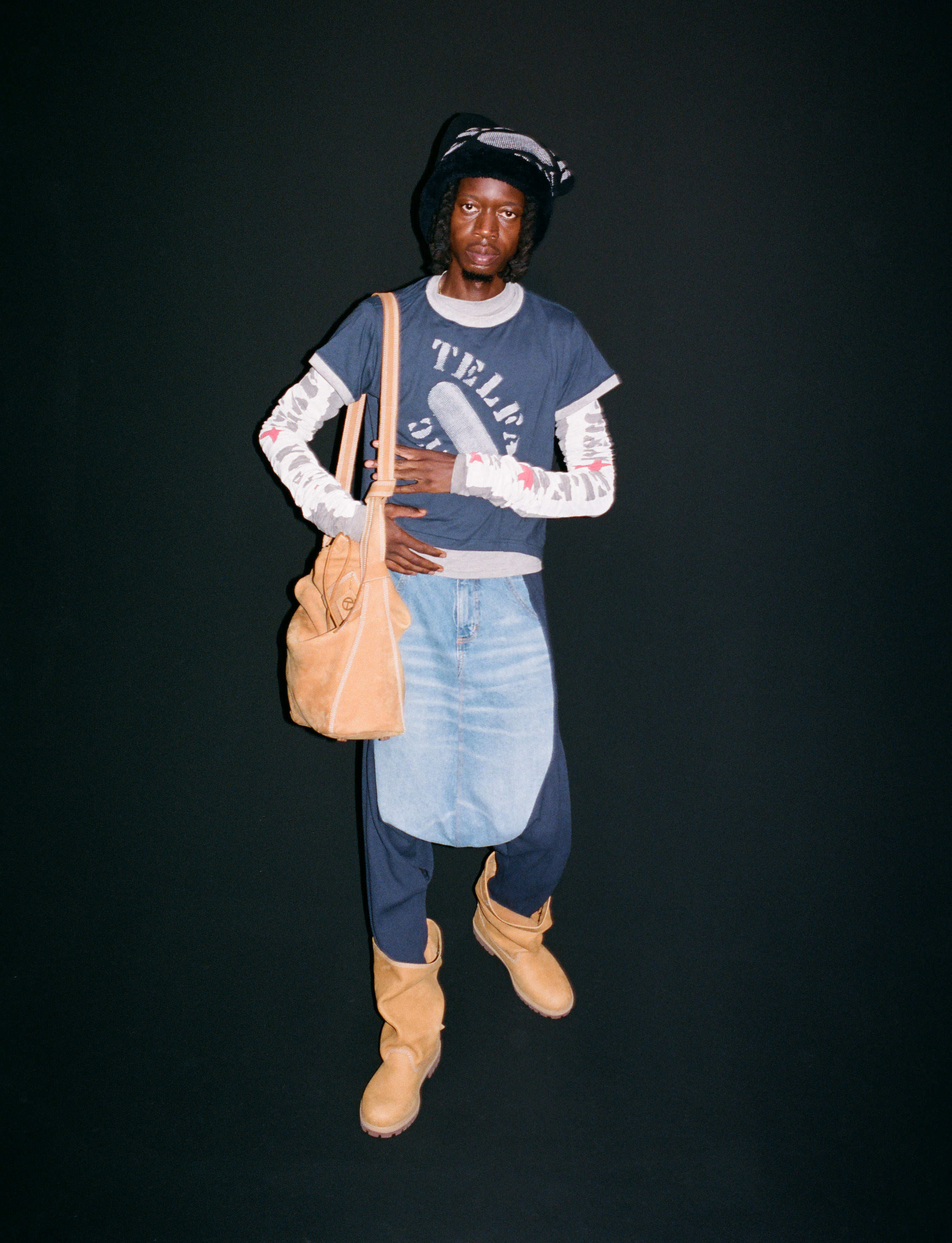 Deem wears tops, trousers and hat TELFAR and shoes and bag TIMBERLAND X TELFAR