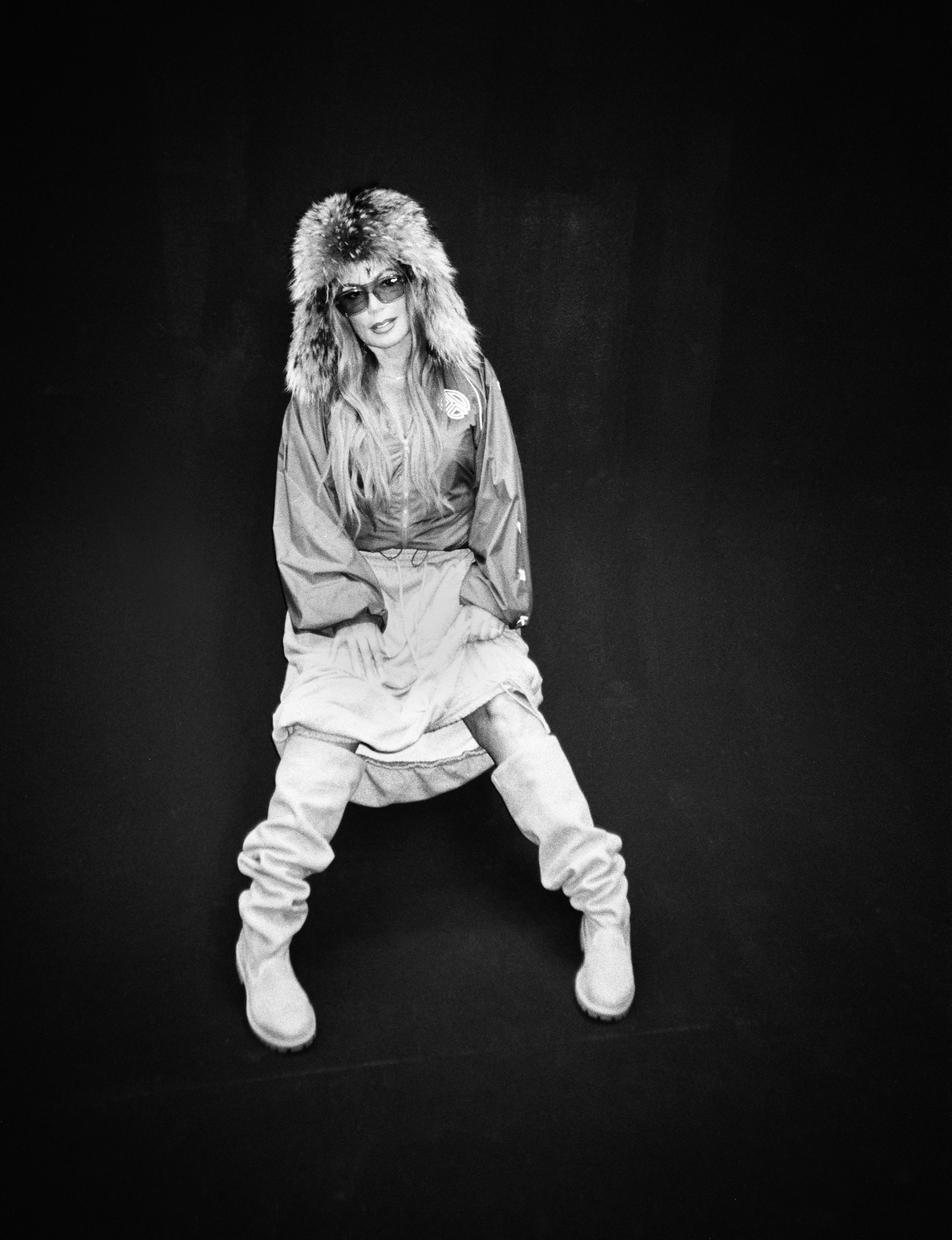 Angie wears jacket and skirt TELFAR, shoes TIMBERLAND X TELFAR and hat and sunglasses talent’s own