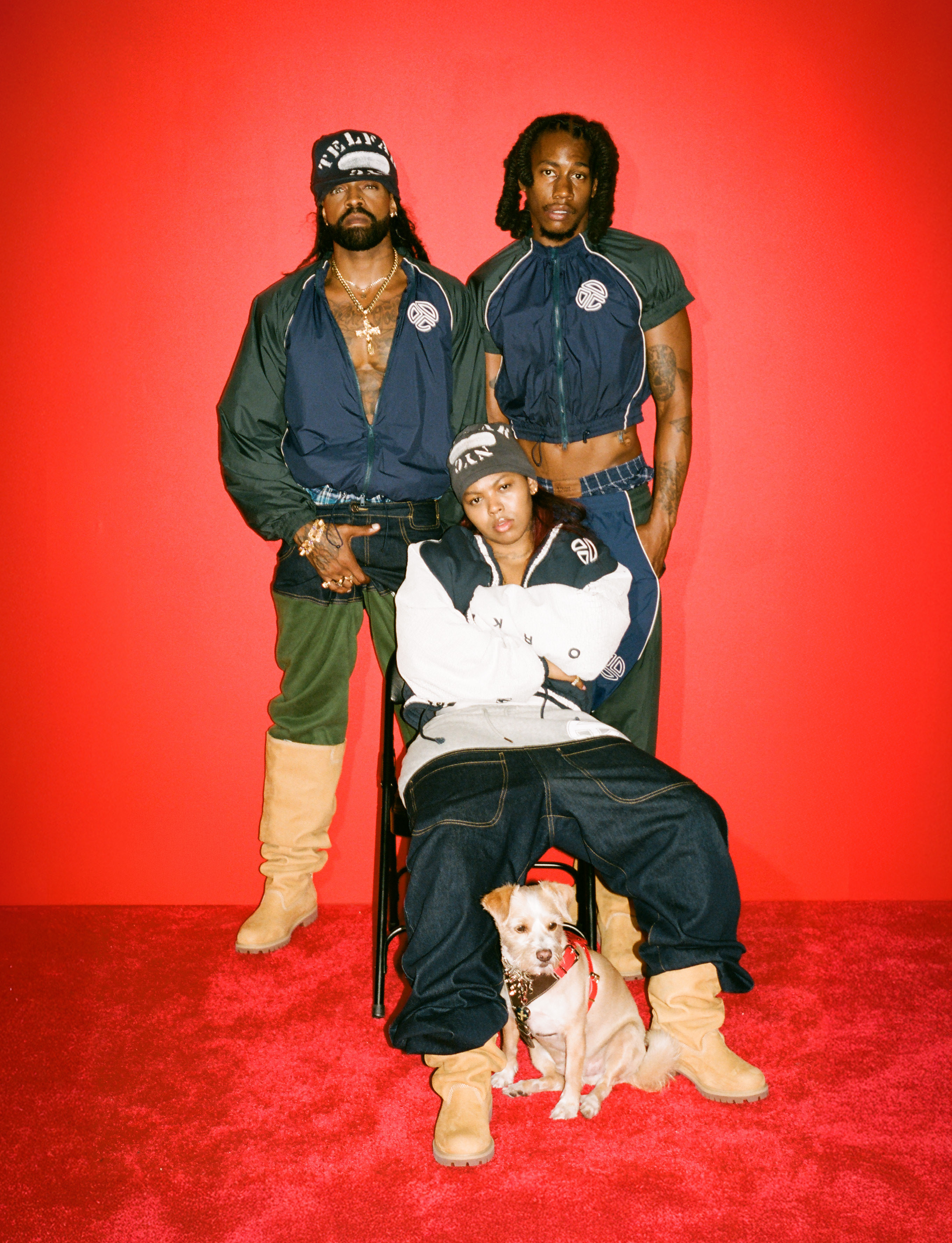 Aya (centre) wears jacket, top, trousers, underwear and hat TELFAR, shoes TIMBERLAND X TELFAR and necklace talent’s own