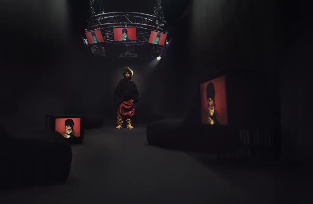 Erykah wears jacket, trousers and snood TELFAR, shoes TIMBERLAND X TELFAR and rings talent’s own