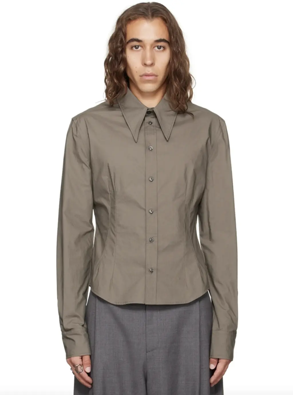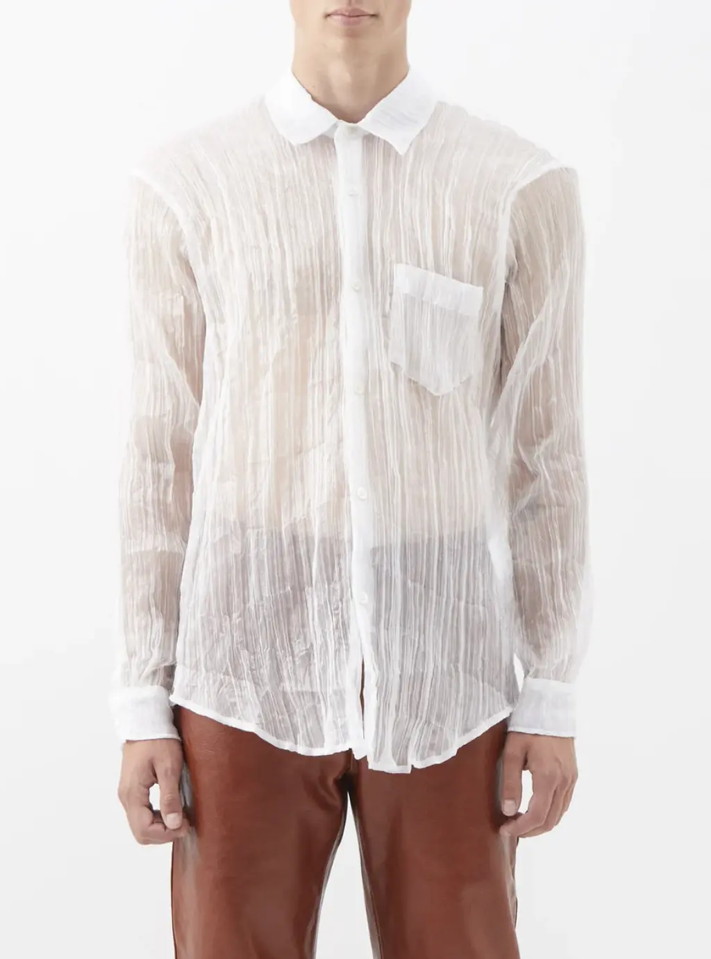 Never mind the knits, opt for a decent shirt instead. Aaron Esh cuts through often boring menswear staples with a highly romantic, subversive edge – as shown in his double dart shirt that cheekily cinches at the waist. If you’re feeling saucy, Our Legacy has a crinkled sheer-tulle shirt on offer, to be worn with or without anything underneath. Or, you could always get into the office spirit, literally, with Diesel’s 9 – 5‑inspired blue pinstripe shirt, superimposed with a huge D on the chest. Tuck into a pair of trousers, belt it up and throw on a leather jacket. Now, about what I said last night, boss…