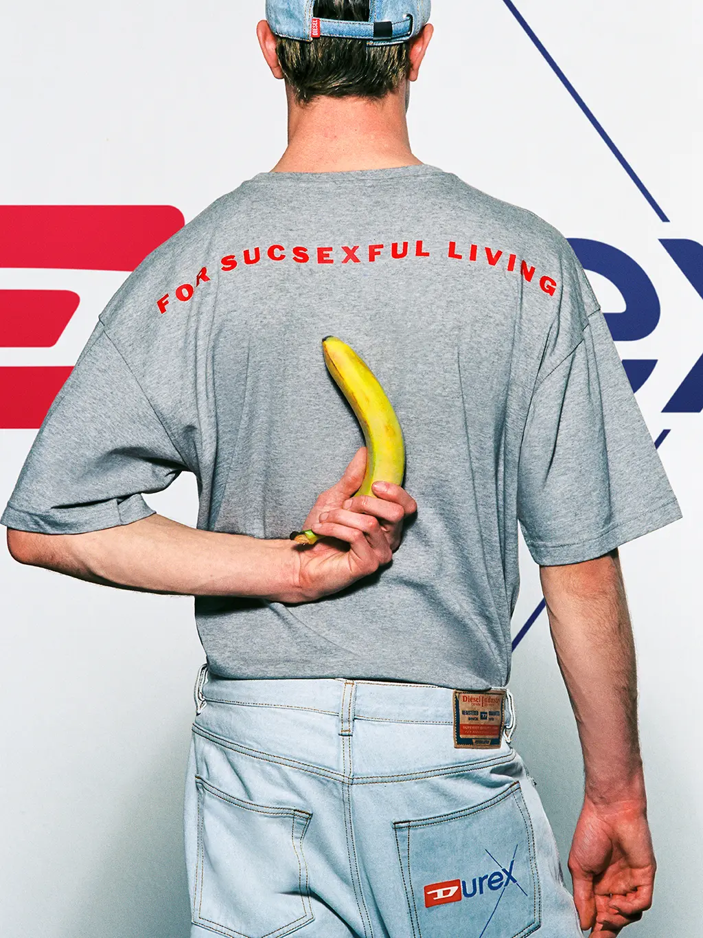 In February, Diesel won Milan Fashion Week after making 200,000 condoms the centrepiece of its sexy, turbo-charged AW23 show. It was all part of a collaboration with Durex, which was officially unveiled today, complete with capsule collection that includes a T‑shirt, a hoodie and a baseball cap, all splashed with the brand’s new wink-nudge slogan “For Sucsexful Living”. While Diesel’s certainly got the horn, the collab is about way more than shagging: it’s a celebration of freedom, choice, sex positivity and human rights. Get into it.