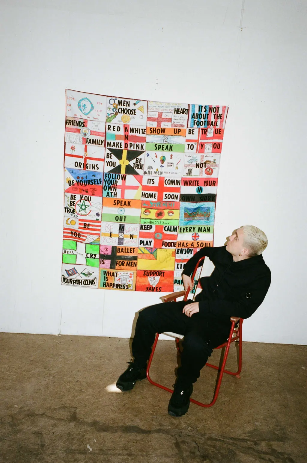 As part of Flannels’ mega Youth-Phoria takeover, which includes events, collaborations and the unveiling of its creative council, the brand is about to launch its first-ever exhibition. Hosted in the basement of the brand’s flagship store on Oxford Street, the whole thing comes courtesy of artist Corbin Shaw and Elgar Johnson’s sports-style magazine CircleZeroEight. Titled For The Love Of The Lads, the work will explore perceptions of masculinity in the UK today – something Sheffield-born Shaw has often tackled head-on in his pieces. Alongside new imagery and a film, Shaw’s also made his signature flags that have phrases such as “Every man has a soul”, in collaboration with the school children of Aylesbury Grammar, who were asked to portray their idea of masculinity.