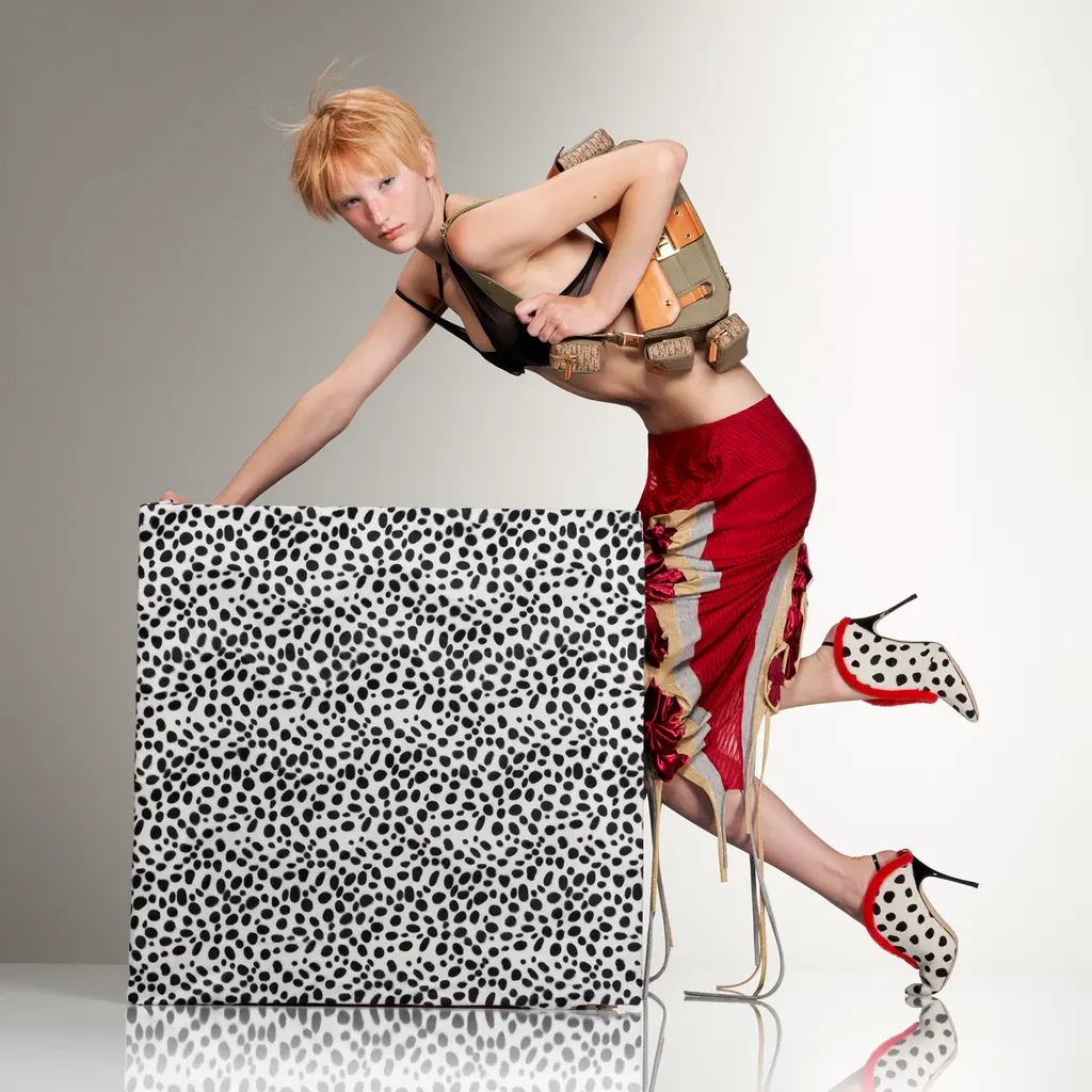 bra COURRÈGES, skirt JOHN GALLIANO SS 2005 READY-TO-WEAR, shoes MANOLO BLAHNIK and bag archive CHRISTIAN DIOR