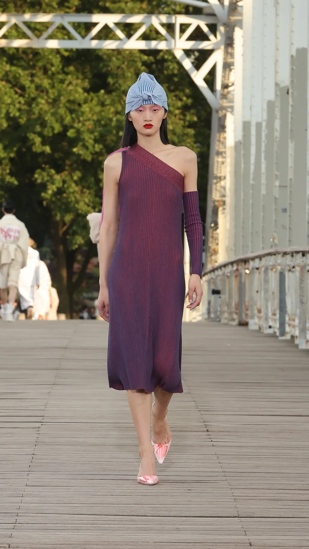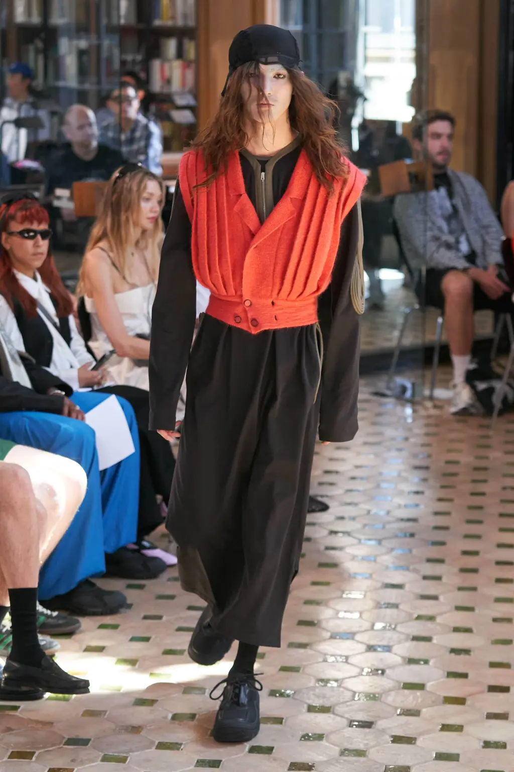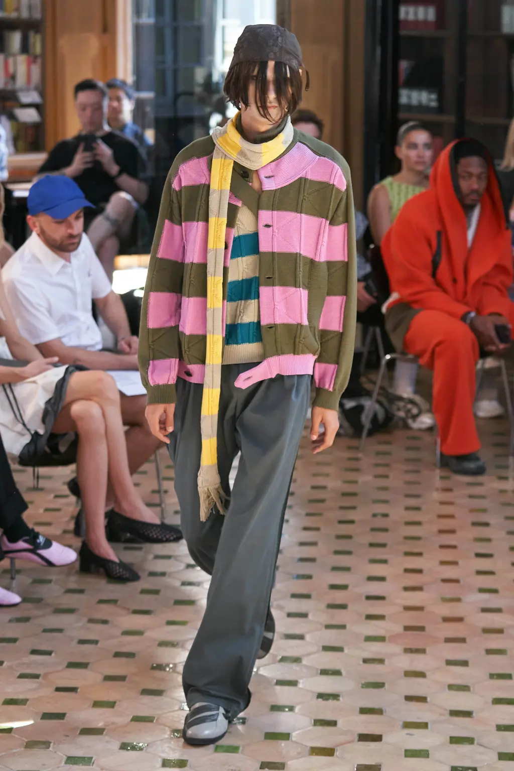 Other sartorial quips included the contrast piping prepster blazers that were fastened using obi belts and constructed with double-weave cotton typical to karate uniforms (gis). Two-tone ribbed turbans also felt like nods to Takada’s cultural expositions. Meanwhile, the translucent knitted cardi dresses and chintzy rose-print blouses offered a concise example of what happens when Japan does Western and vice versa.
