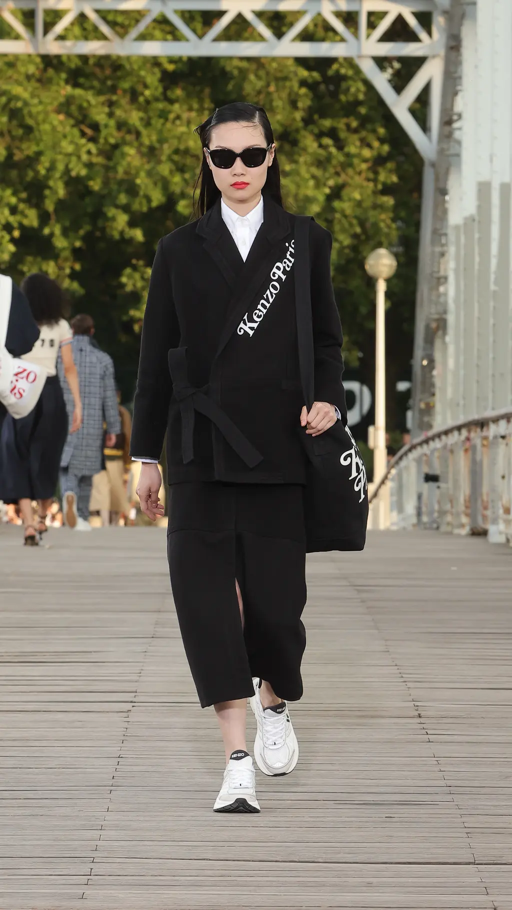 Pharrell, Nigo’s old pal, came through wearing one of the collection’s pieces – a navy kimono-blazer – while Korean rapper Vernon followed suit in a buttery baseball jacket, seeing in his new role as Kenzo’s global ambassador.