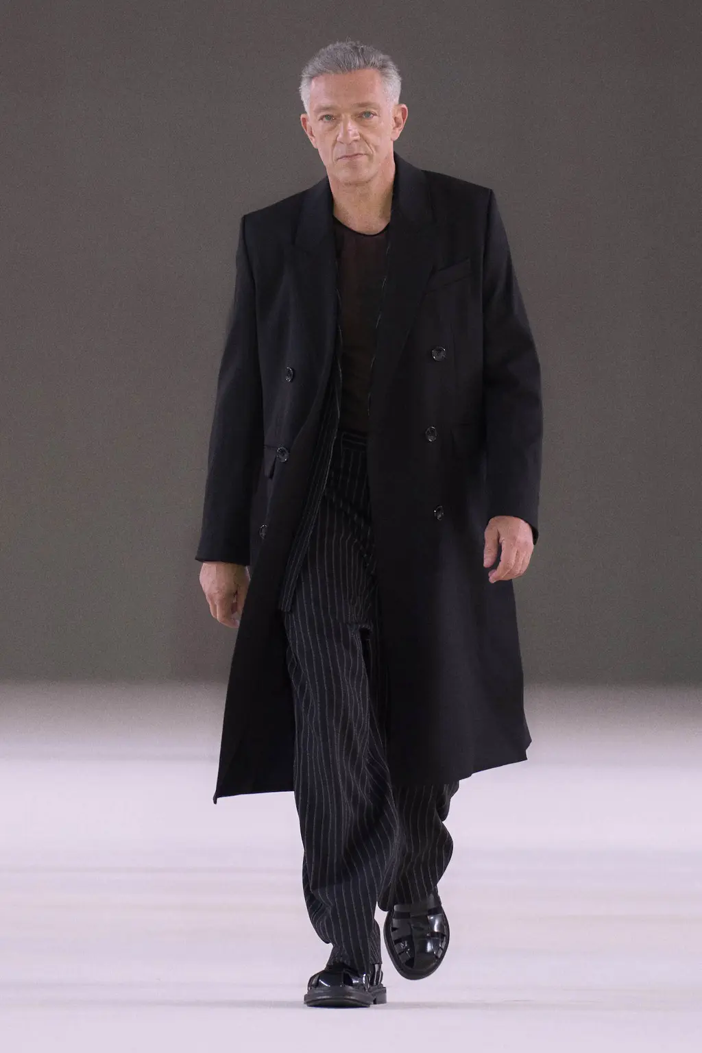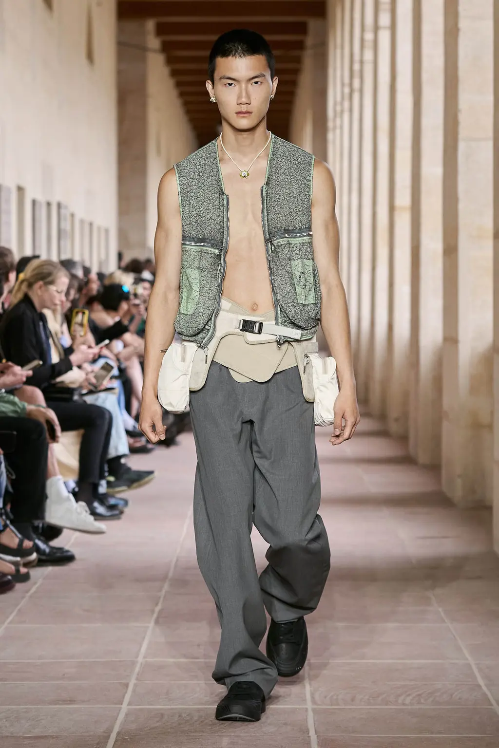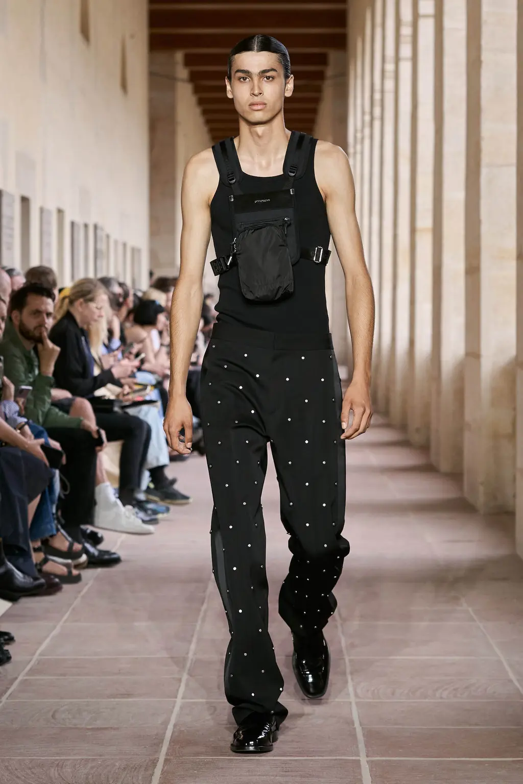 Here, the austere settings and easy patter of producer Rone’s soundtrack forced viewers to pay attention, indulging in the garments’ exquisite simplicity. Opened by silver fox Vincent Cassel – who played Vinz in the 1995 cult classic, La Haine – the show pulled together a modular wardrobe of polished separates. Pinstripe blazers came with macho shoulders and a roomy chest, contrasted against brown leather mini-shorts or supple riveted chinos. The styling harked back to mid-nineties Prada, at once basic and meticulous.