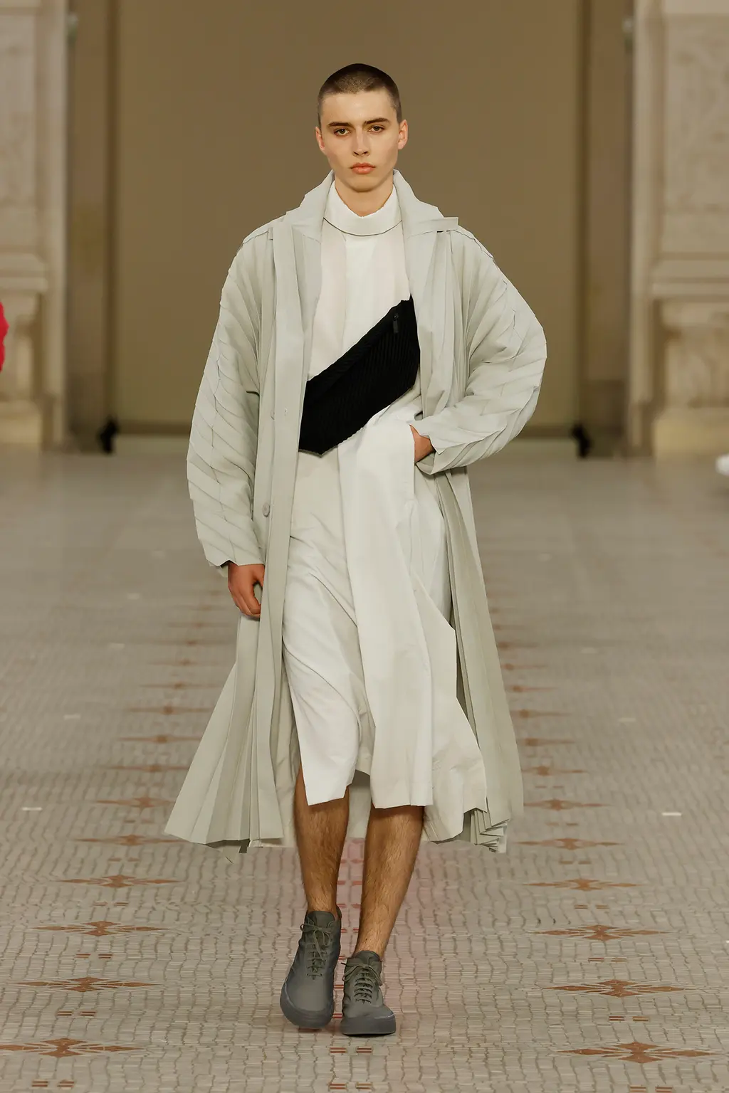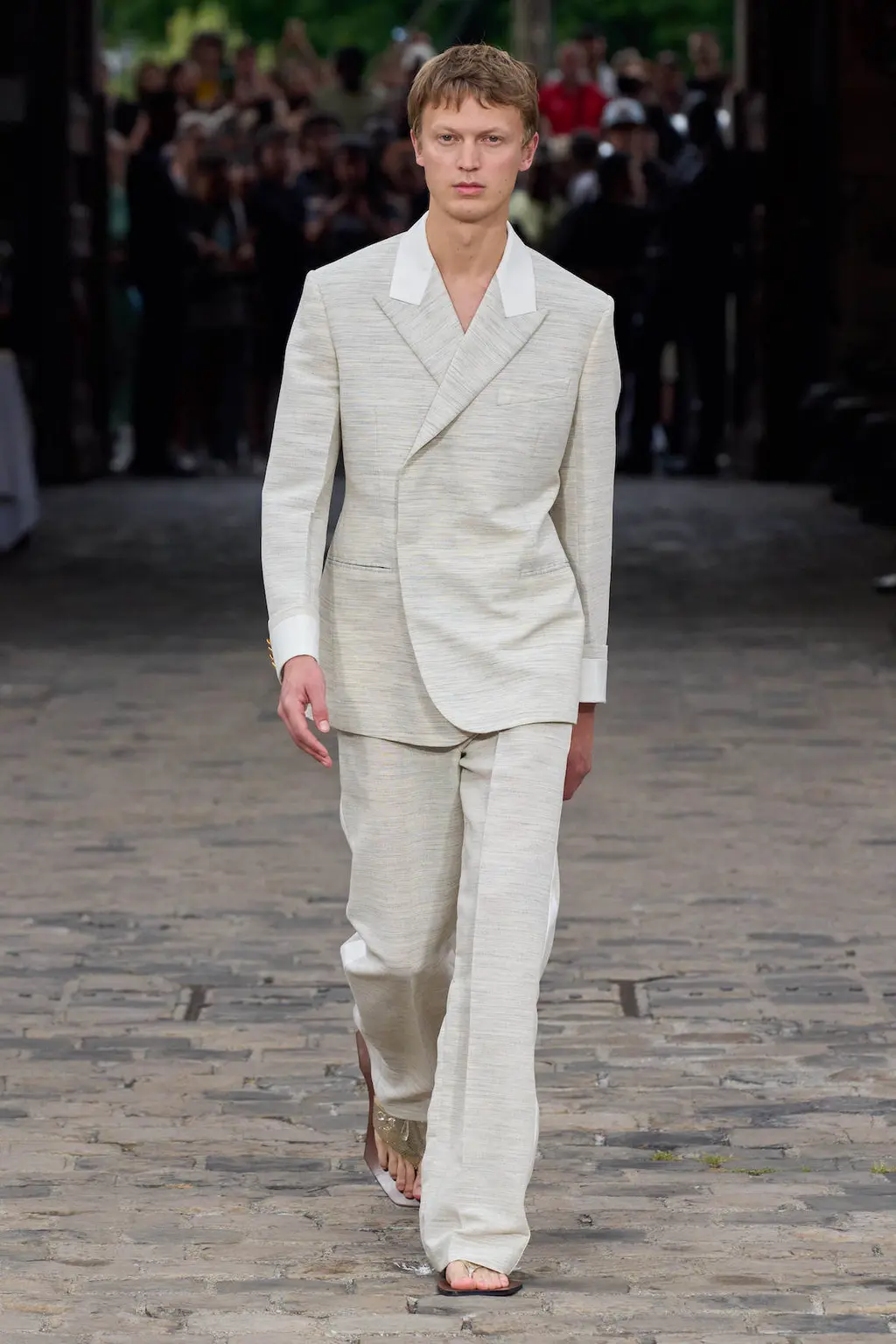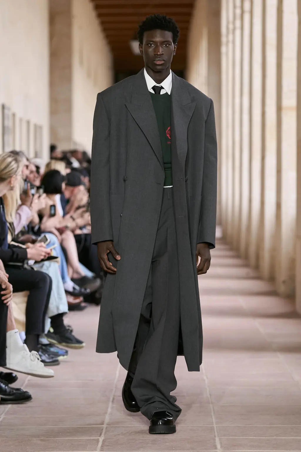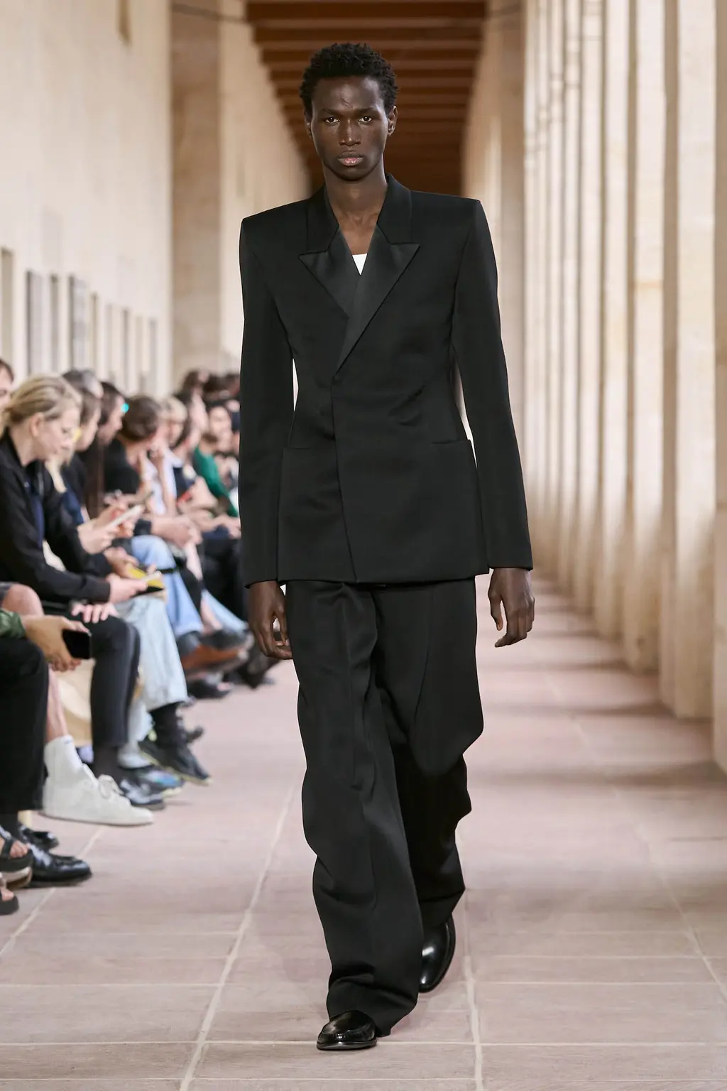Any show that’s staged under this carved stone roof had better be luxe. Luckily, Matthew delivered. Presenting roomy tailoring that swished as models walked, the collection reimagined traditional tropes of dresswear, easing them for a fuss-free and approachable vision of elegance. Double-breasted jackets in angelic white or black came with hefty, peaked lapels and trousers that bunched generously at the shoe. Thrown in with black ties, grey overcoats and notably baggy fits, it harked back to old prep-school uniforms, lightly subverted with non-regulation Harrington jackets or satin zip-ups atop shirts.