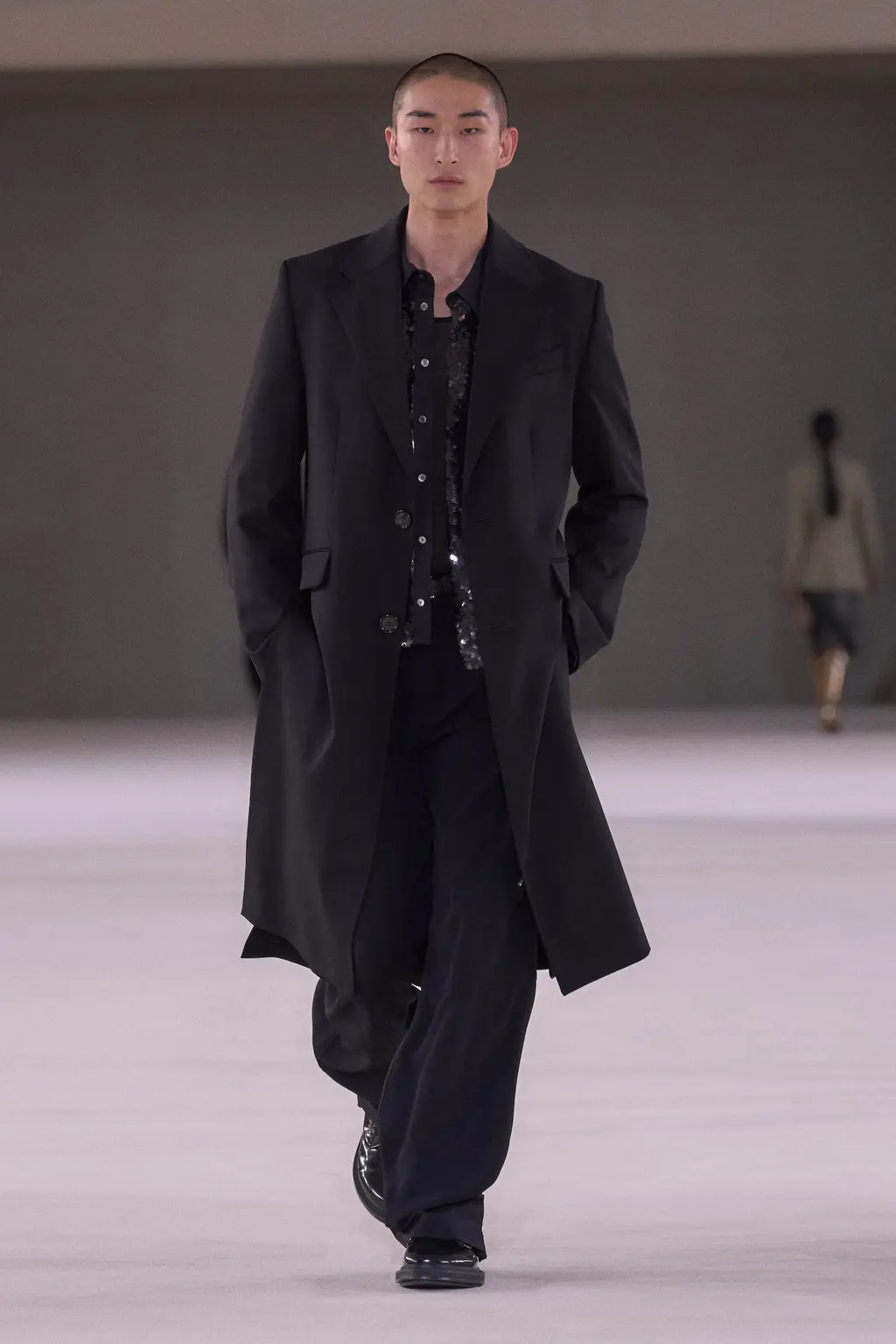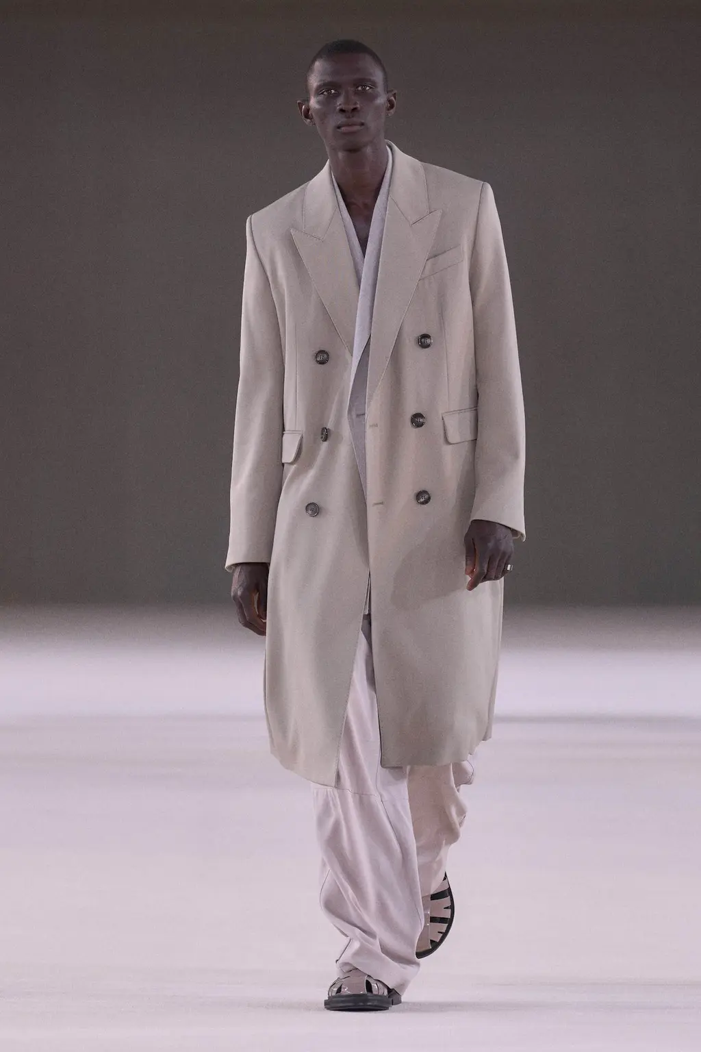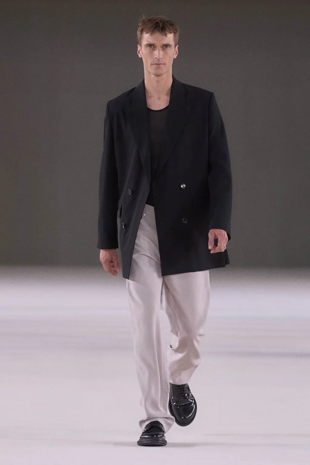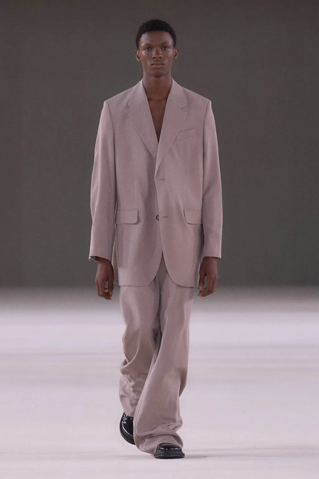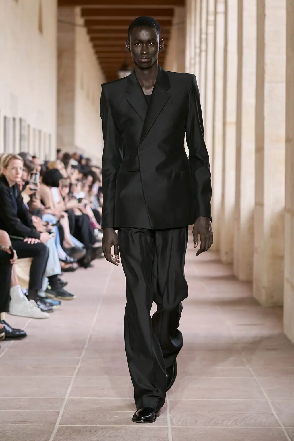 Any show that’s staged under this carved stone roof had better be luxe. Luckily, Matthew delivered. Presenting roomy tailoring that swished as models walked, the collection reimagined traditional tropes of dresswear, easing them for a fuss-free and approachable vision of elegance. Double-breasted jackets in angelic white or black came with hefty, peaked lapels and trousers that bunched generously at the shoe. Thrown in with black ties, grey overcoats and notably baggy fits, it harked back to old prep-school uniforms, lightly subverted with non-regulation Harrington jackets or satin zip-ups atop shirts.