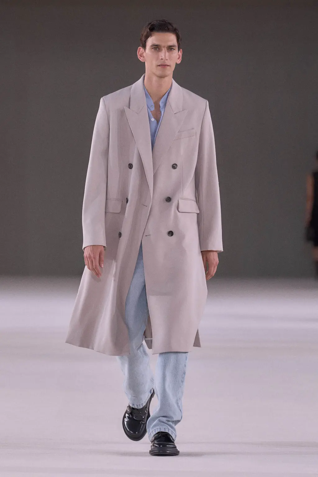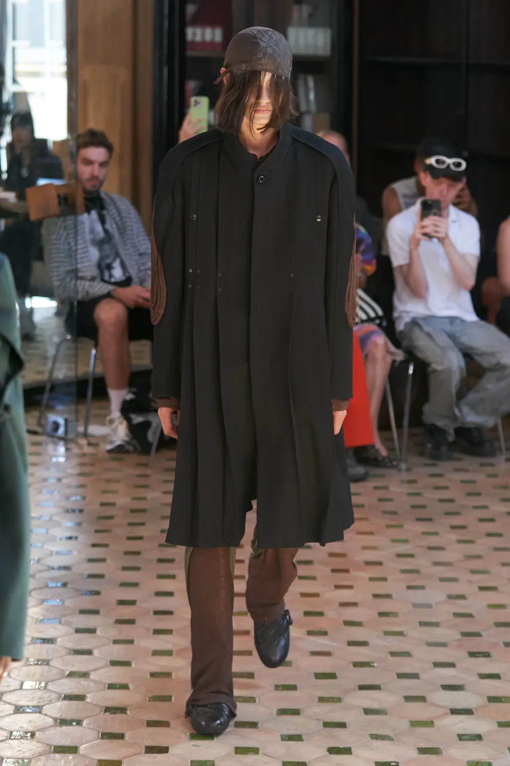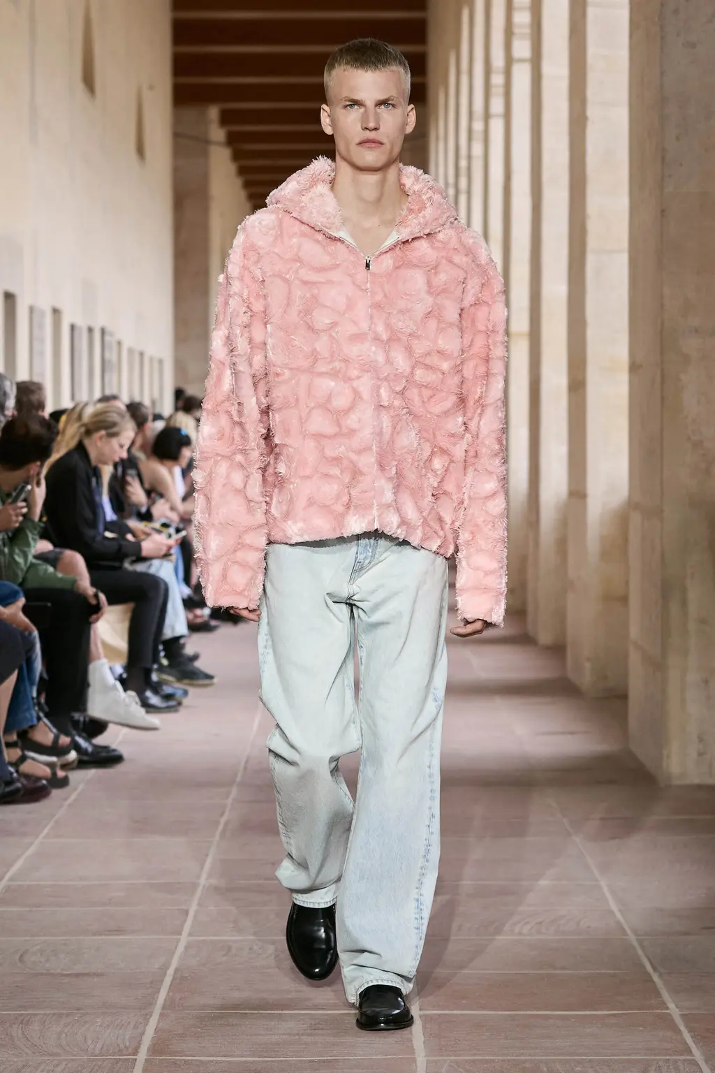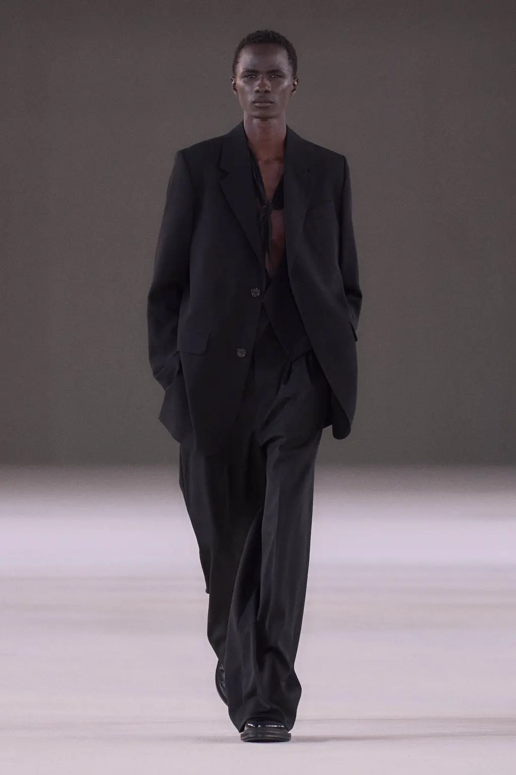 Any show that’s staged under this carved stone roof had better be luxe. Luckily, Matthew delivered. Presenting roomy tailoring that swished as models walked, the collection reimagined traditional tropes of dresswear, easing them for a fuss-free and approachable vision of elegance. Double-breasted jackets in angelic white or black came with hefty, peaked lapels and trousers that bunched generously at the shoe. Thrown in with black ties, grey overcoats and notably baggy fits, it harked back to old prep-school uniforms, lightly subverted with non-regulation Harrington jackets or satin zip-ups atop shirts.