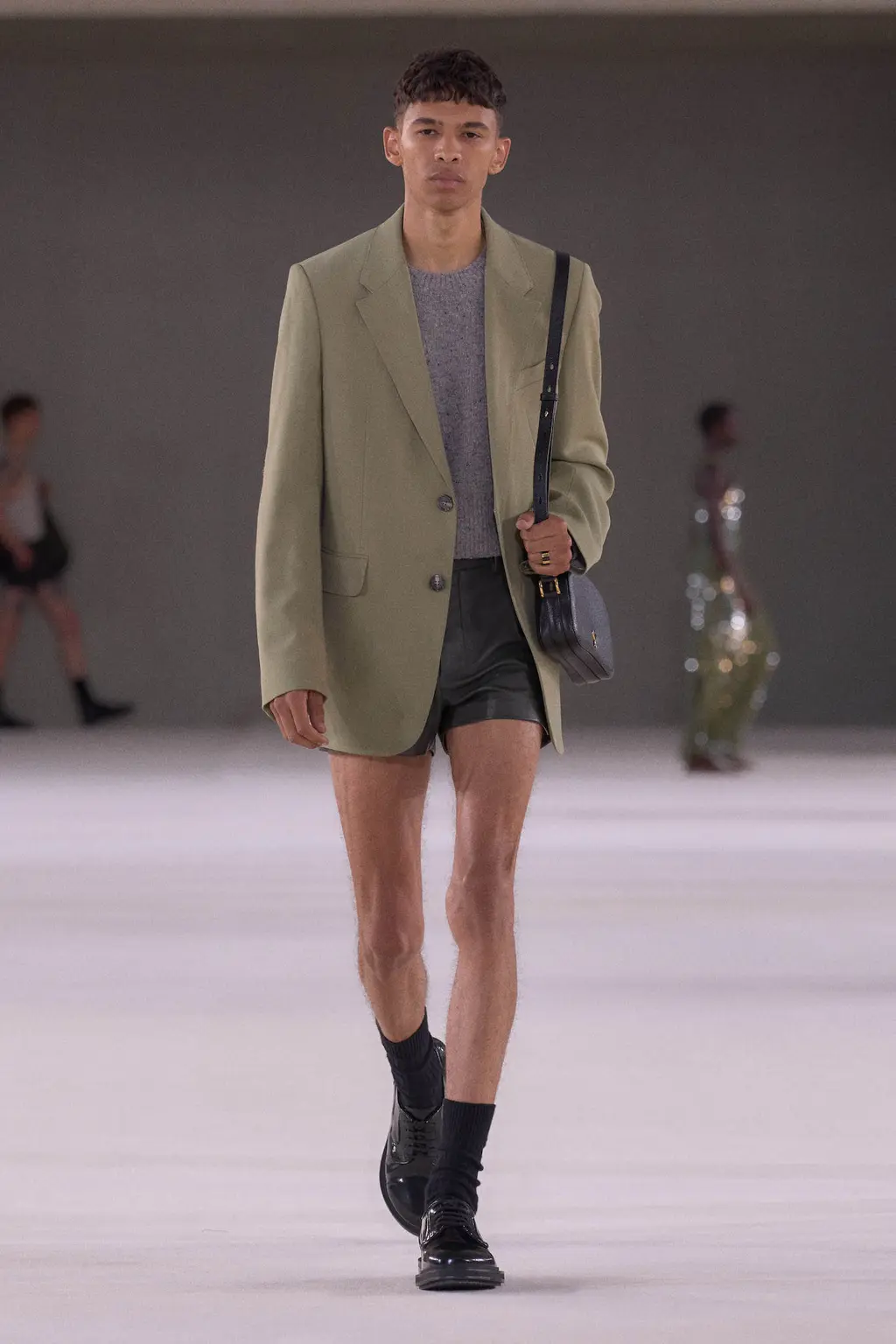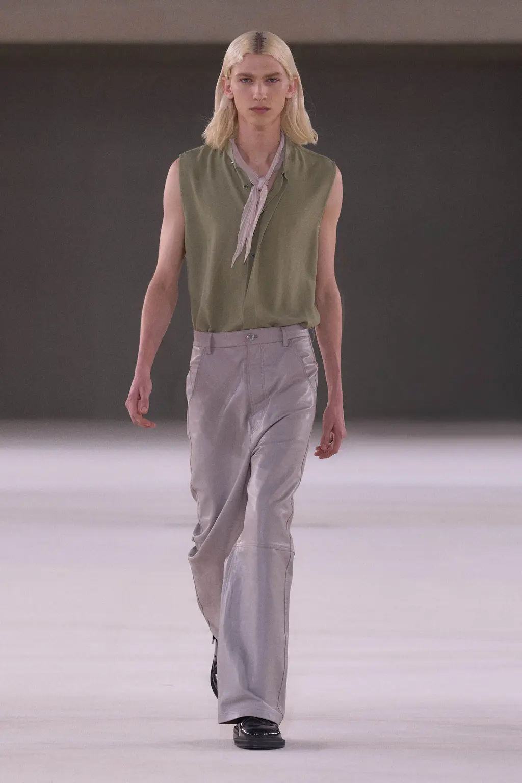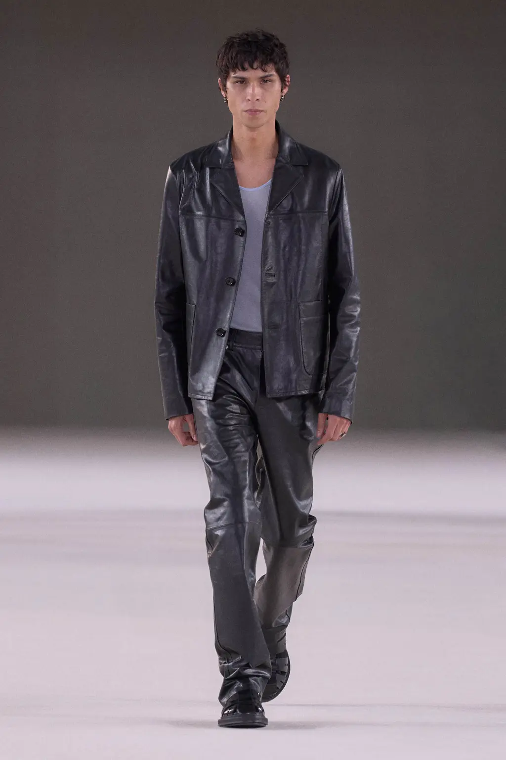 Between the menswear and womenswear, there were subtle distinctions. The latter exuded a daintiness that’s become increasingly scant on the runways, meanwhile the men’s ensembles felt cute – almost twee, at points – with neat sweater vests in melange wool and collared dress shirts peeking beneath. The addition of a breezy double-breasted blazer appeared throughout, finishing the light-touch look. Even when this proposed man was clad in full leather, he still felt gentle, softened by the blue or creamy hues.