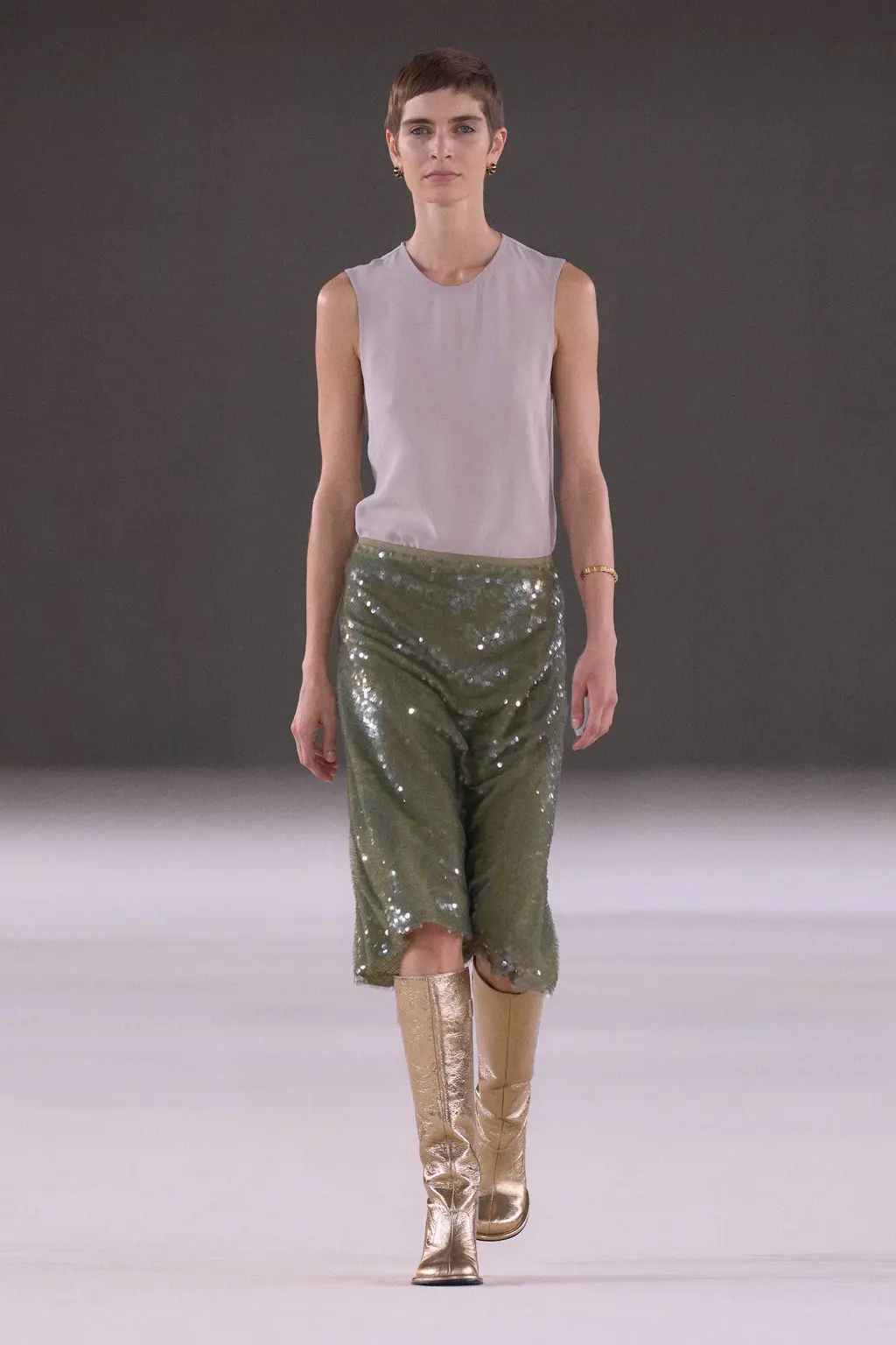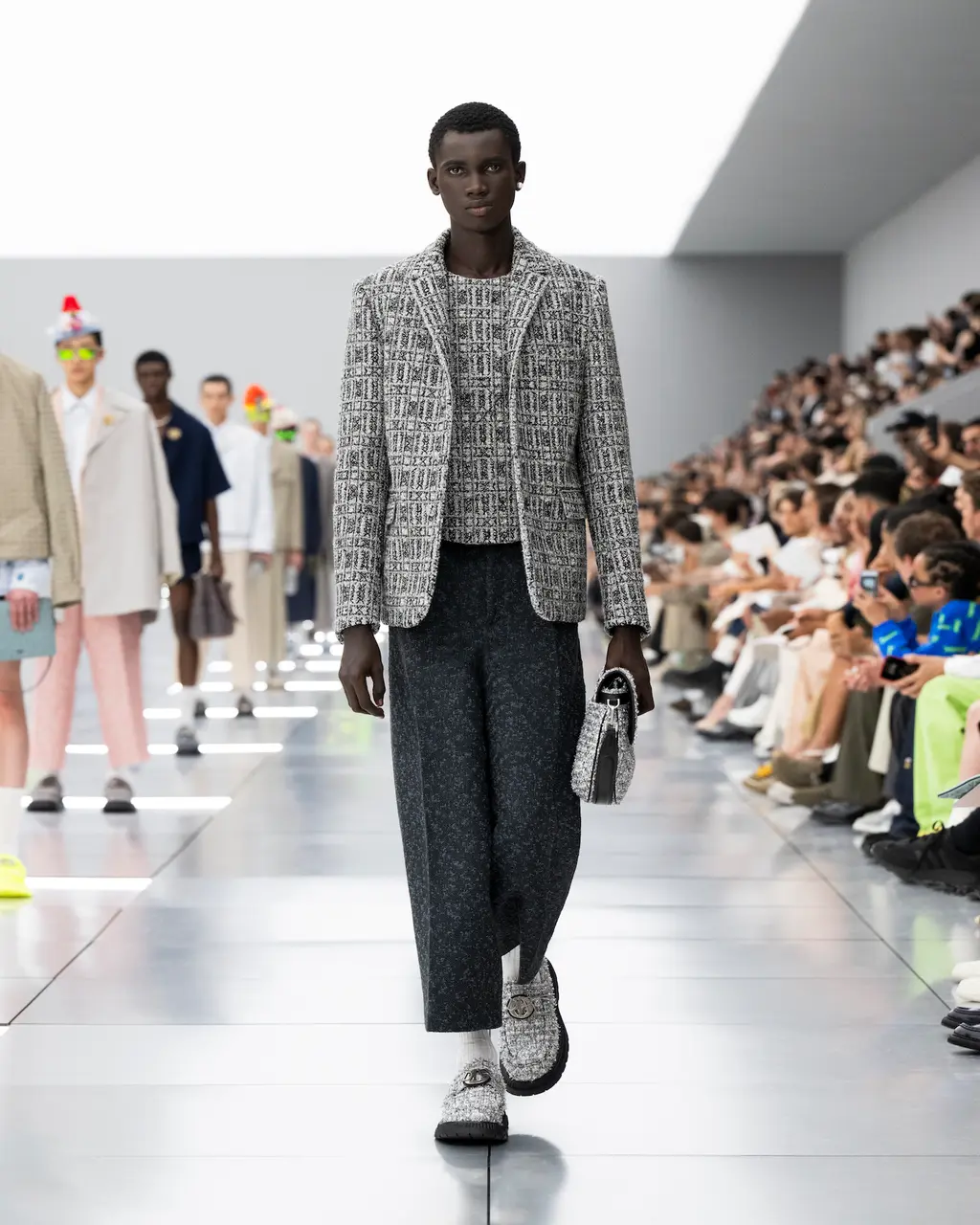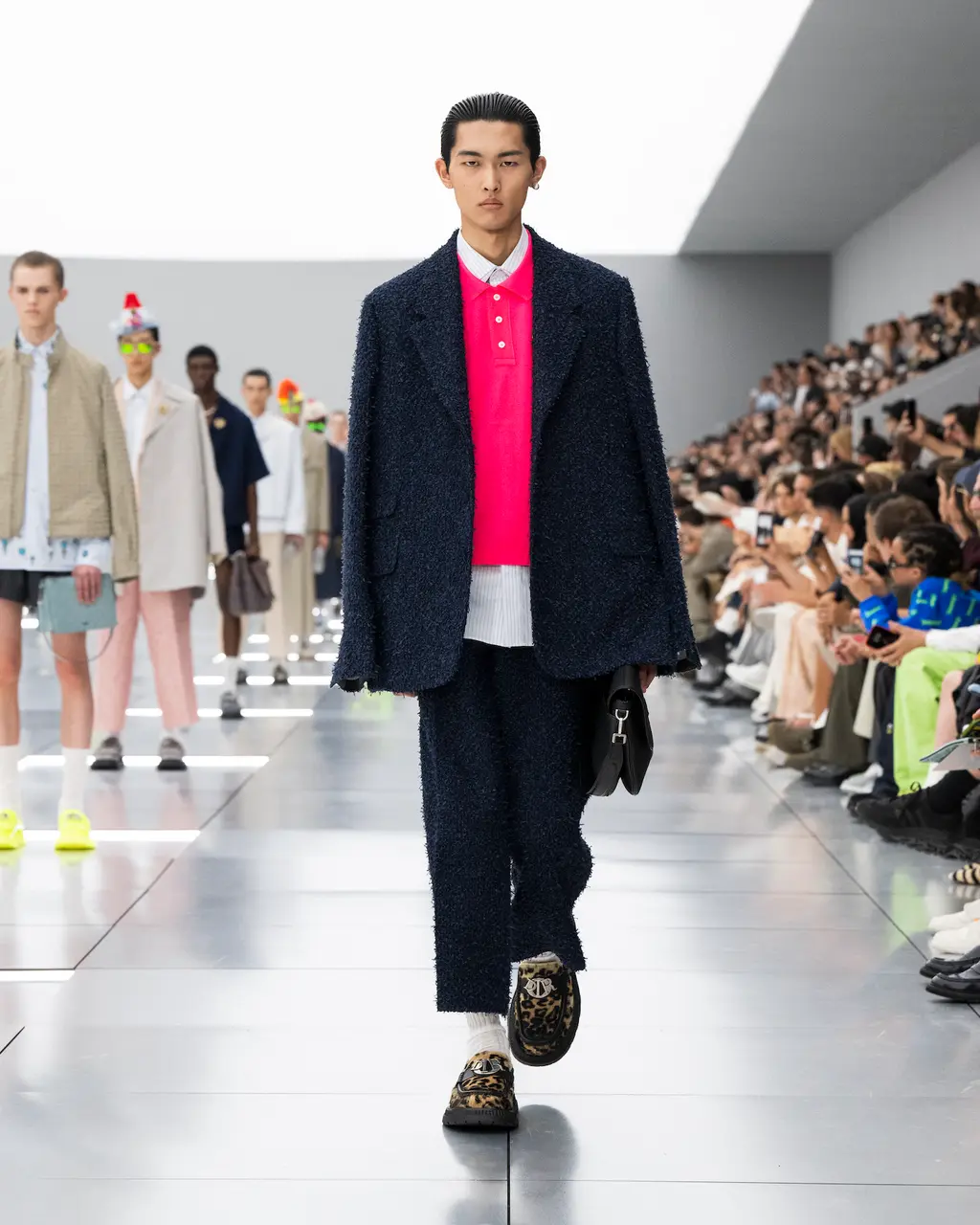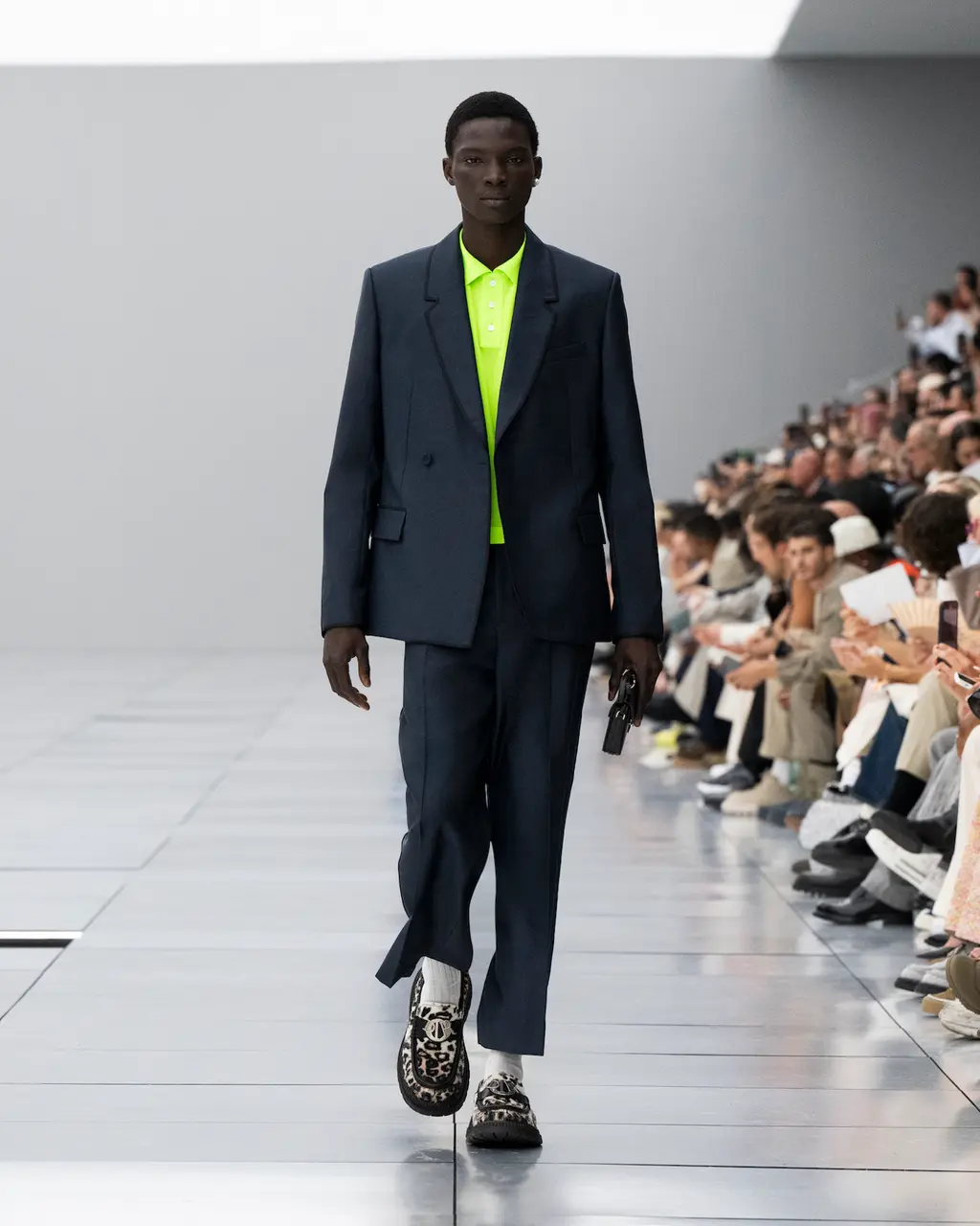 Across the collection, particular materials and patterns took centre stage, riffing on house histories. Bouclé appeared across technicoloured overcoats and rich tonal suiting. The palette was delicious, merging tonal meringue two-piece with fluoro green polos, and contrast tweed with leopard print updates on the iconic saddle bag – that’s your zeitgeist awareness.
