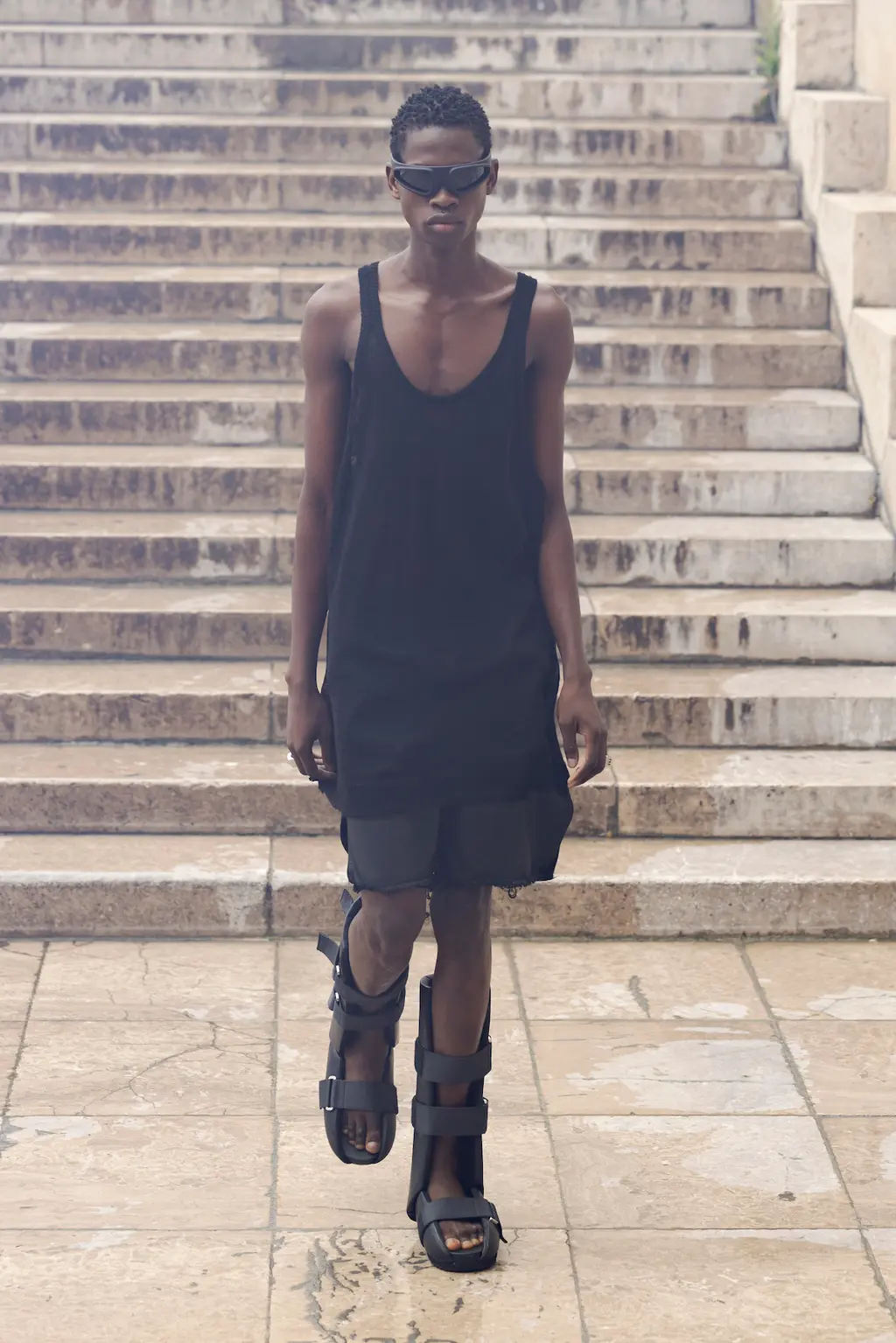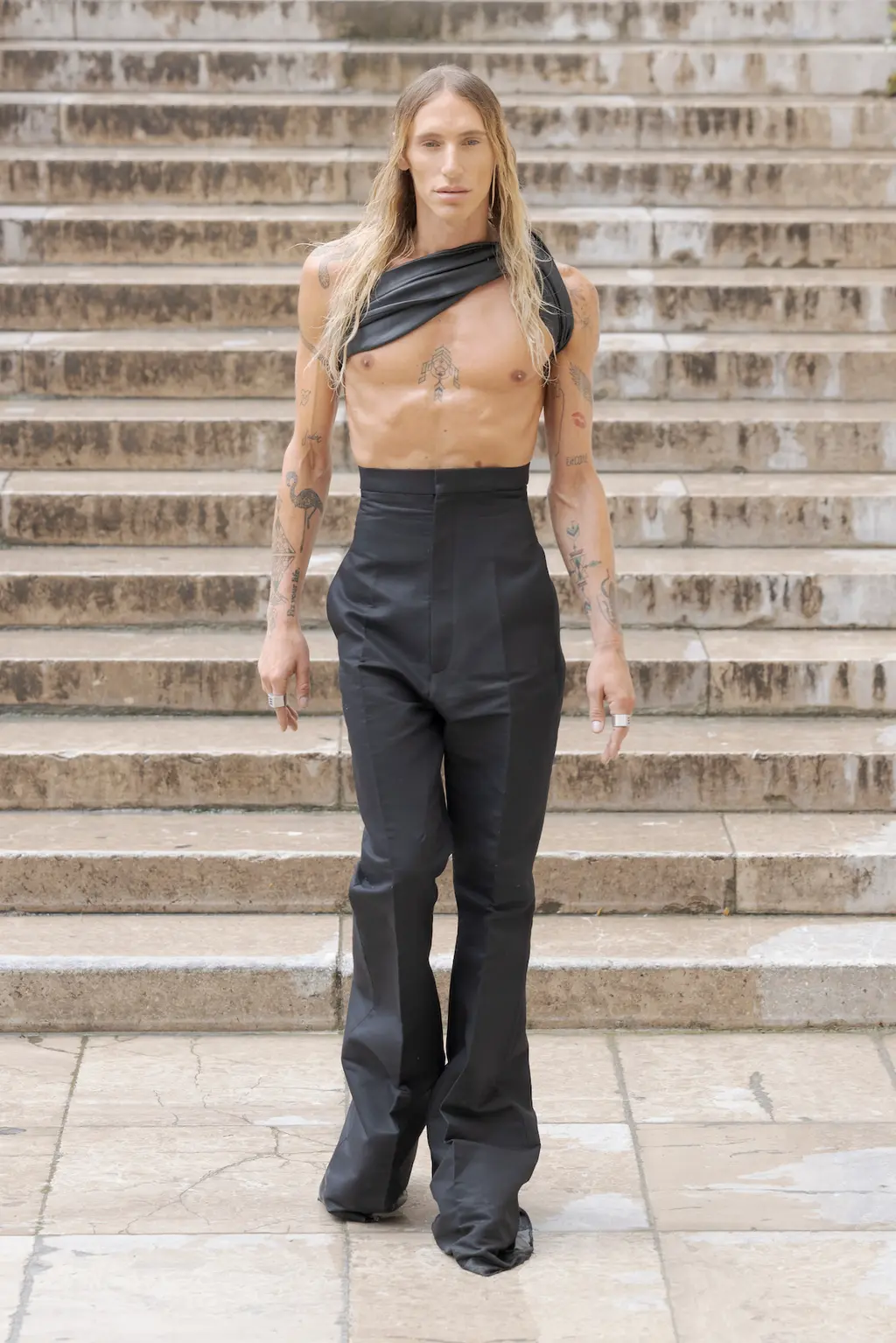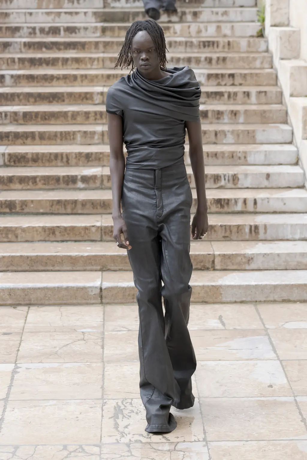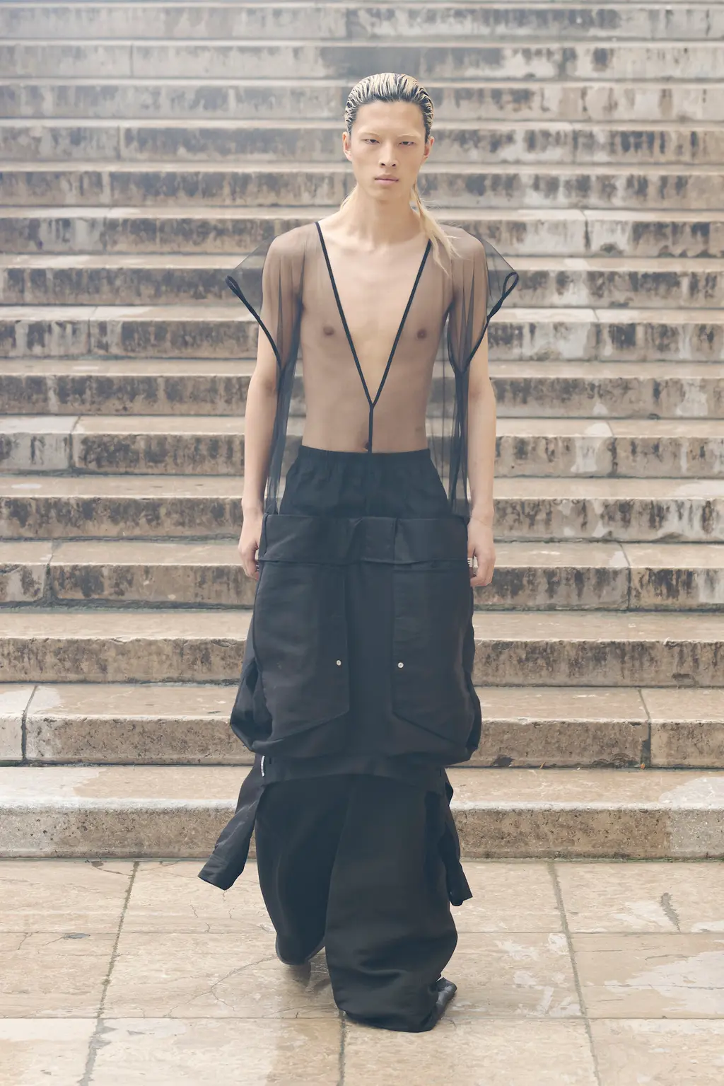 Later, the master of darkness gave us fragility, serving up ultra-sheer dresses with black piping that, from afar, appeared like the ghost of a scooping V‑neck. These morphed into heavy-combat skirting, with grunge trousers layered beneath. It was, in true Rick fashion, avant-garde, however, not without commercial appeal. On their own, these garments felt versatile, built for wearing wherever your day (or night) takes you. A sticky dancefloor, here; a red-carpet, there.