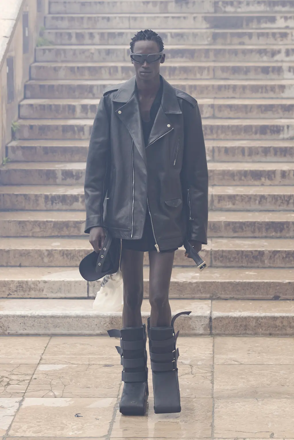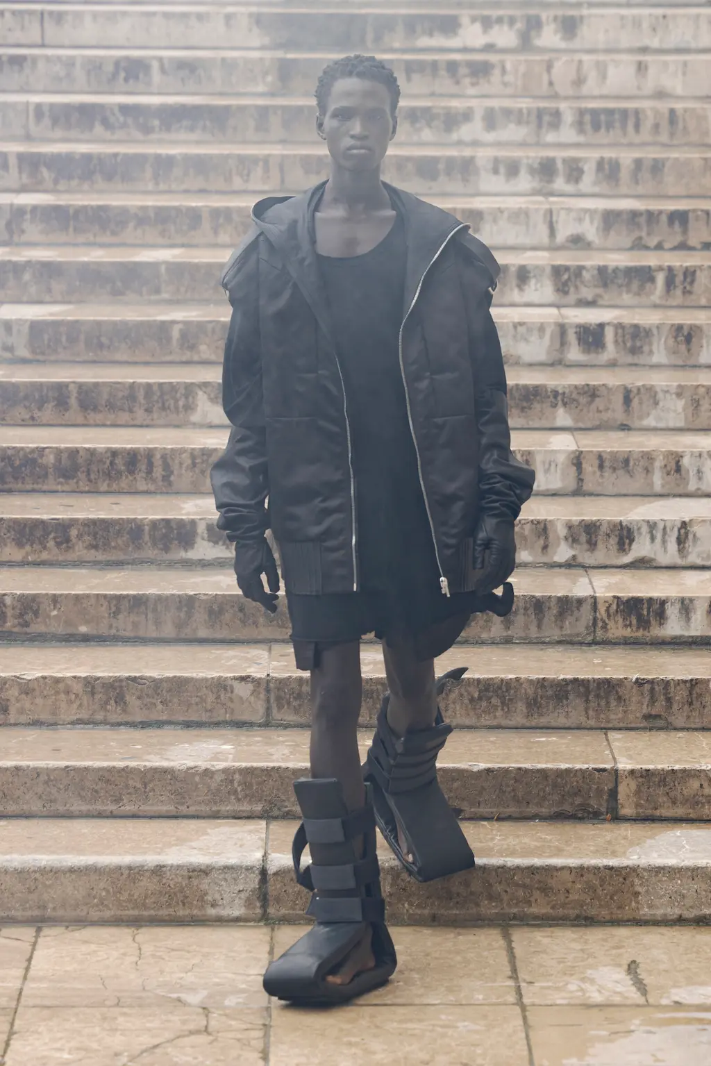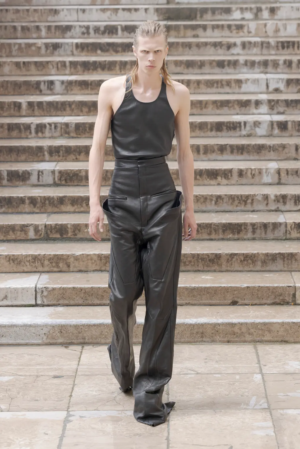 Later, the master of darkness gave us fragility, serving up ultra-sheer dresses with black piping that, from afar, appeared like the ghost of a scooping V‑neck. These morphed into heavy-combat skirting, with grunge trousers layered beneath. It was, in true Rick fashion, avant-garde, however, not without commercial appeal. On their own, these garments felt versatile, built for wearing wherever your day (or night) takes you. A sticky dancefloor, here; a red-carpet, there.