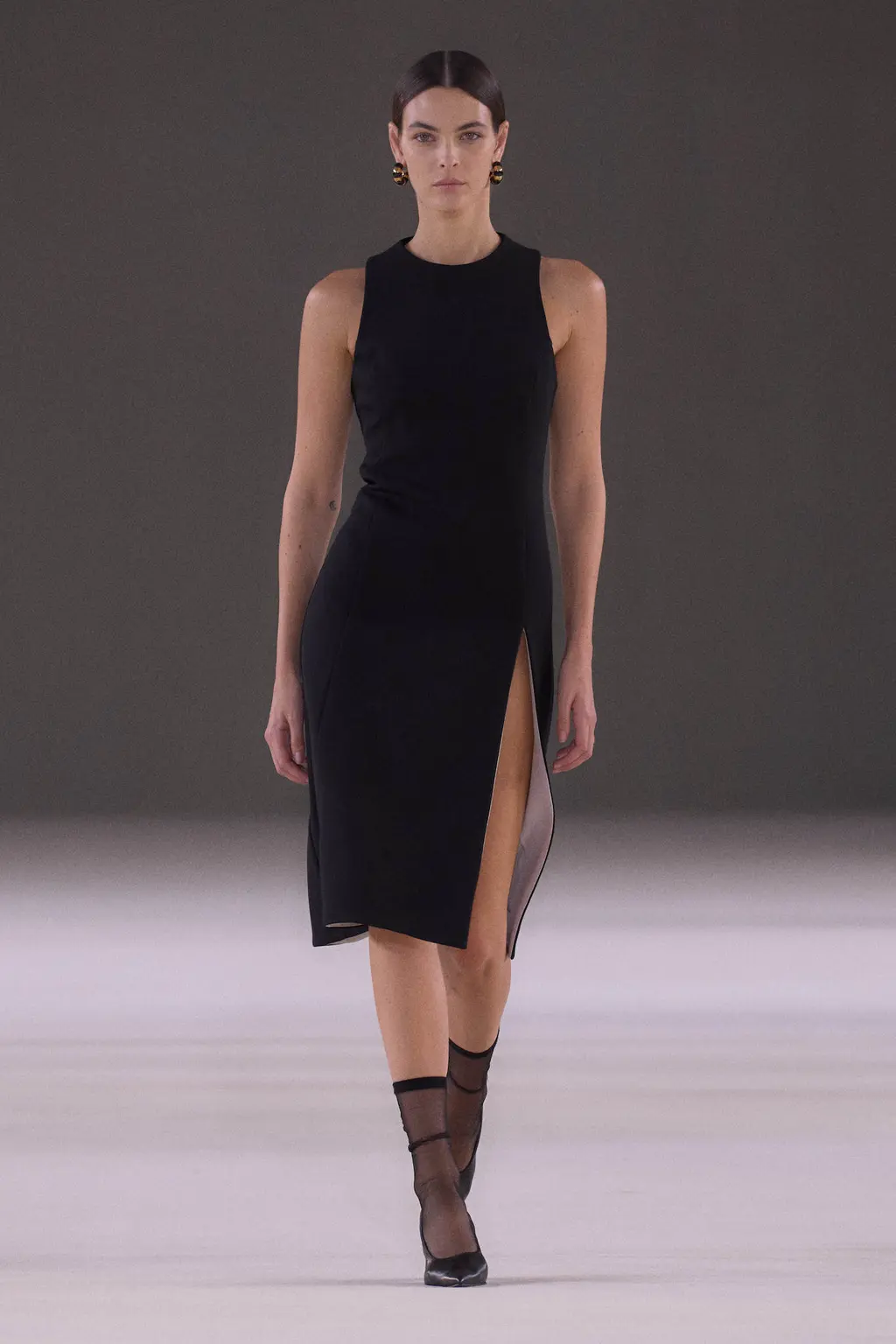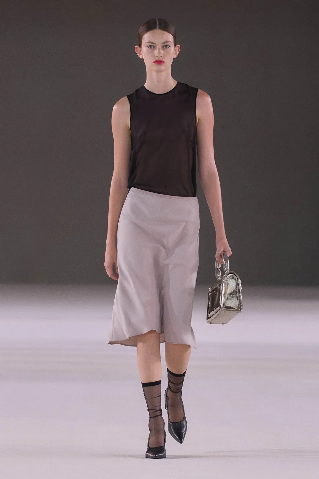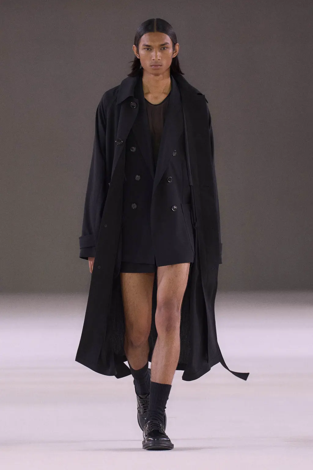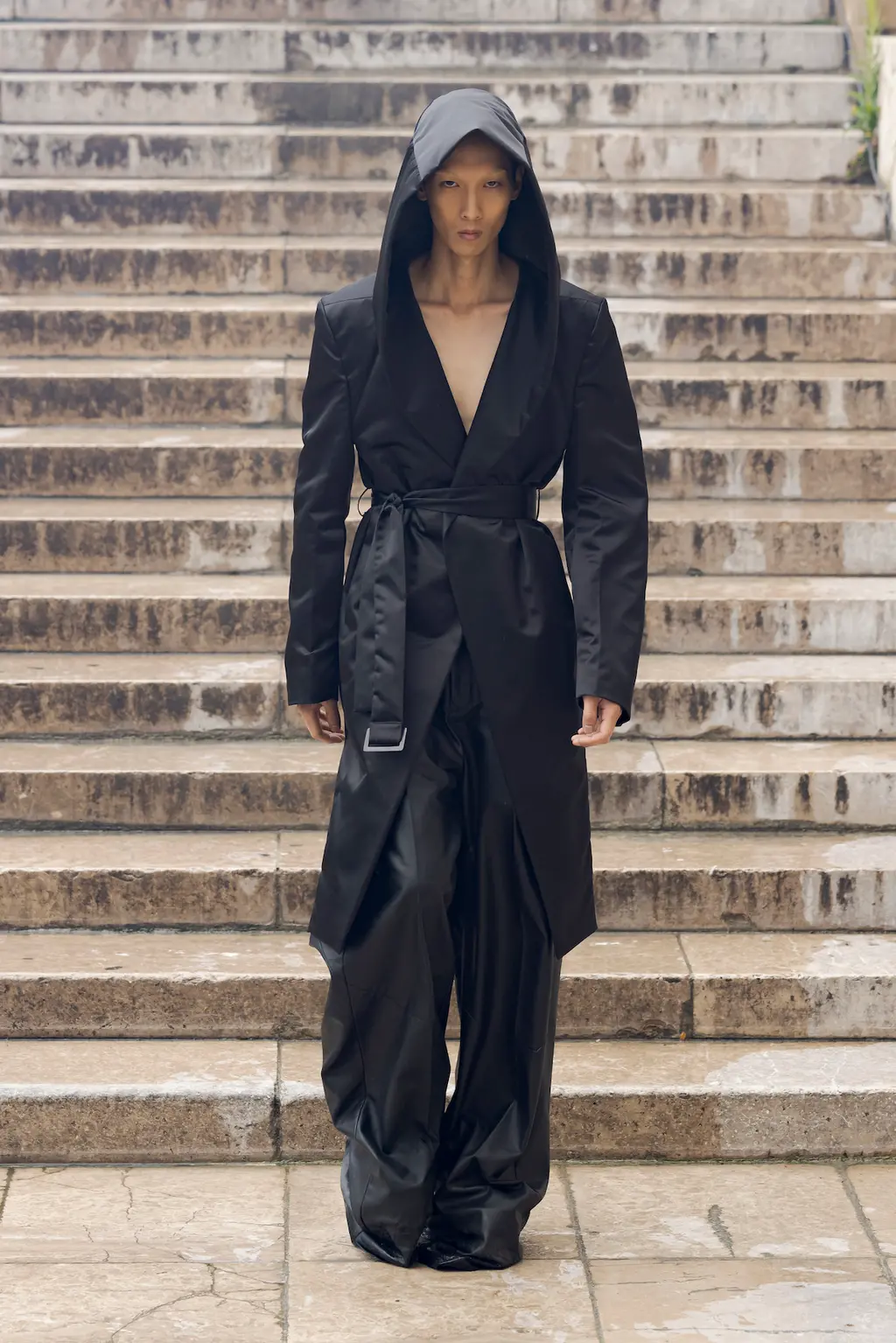 Later, the master of darkness gave us fragility, serving up ultra-sheer dresses with black piping that, from afar, appeared like the ghost of a scooping V‑neck. These morphed into heavy-combat skirting, with grunge trousers layered beneath. It was, in true Rick fashion, avant-garde, however, not without commercial appeal. On their own, these garments felt versatile, built for wearing wherever your day (or night) takes you. A sticky dancefloor, here; a red-carpet, there.