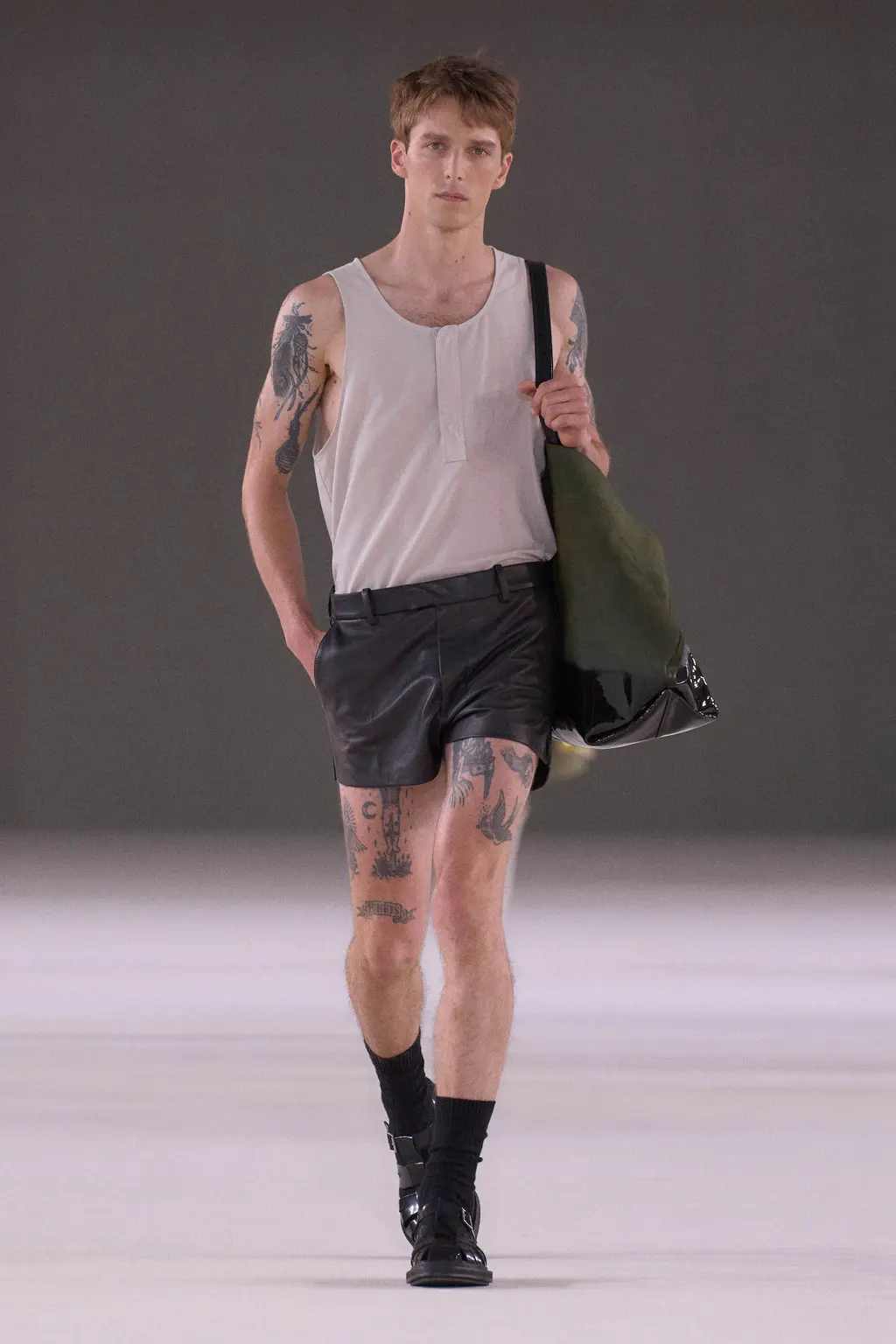 Later, archetypes of workwear were tweaked with cheeky details. The dickies-style shorts, for instance, were slashed across the knee and fastened too soon on the waistband, obscuring the flies beneath with loosely folded pleats. There were also the selvedge jeans and workboot combos accompanied with backward-facing bum bags and backpacks – yet another example of the tinkered uniform.