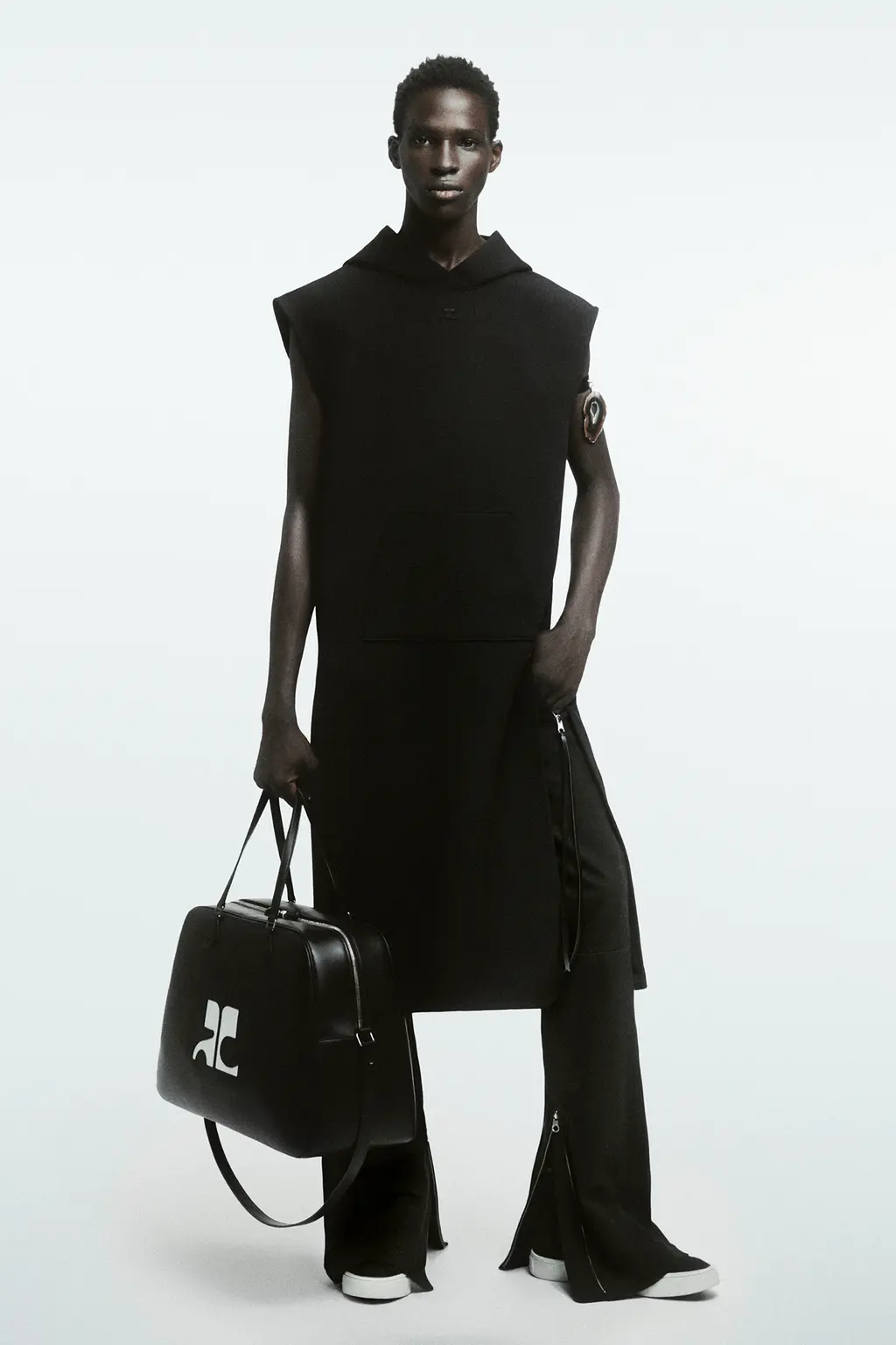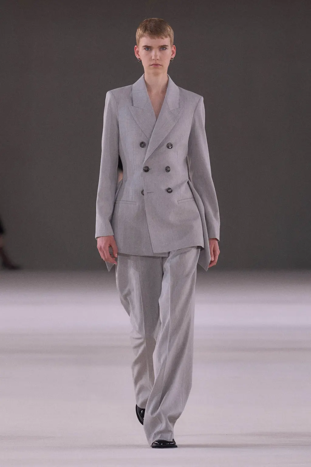 Courrèges’ last collection looked at the oddities of human behaviour, and adapted clothing to suit these. Coat torsos came cut with armholes to doomscroll at optimal speed, while jackets could be strapped to shoulders like a backpack, saving hours in the cloakroom queue. This offering, however, felt a touch more formal.