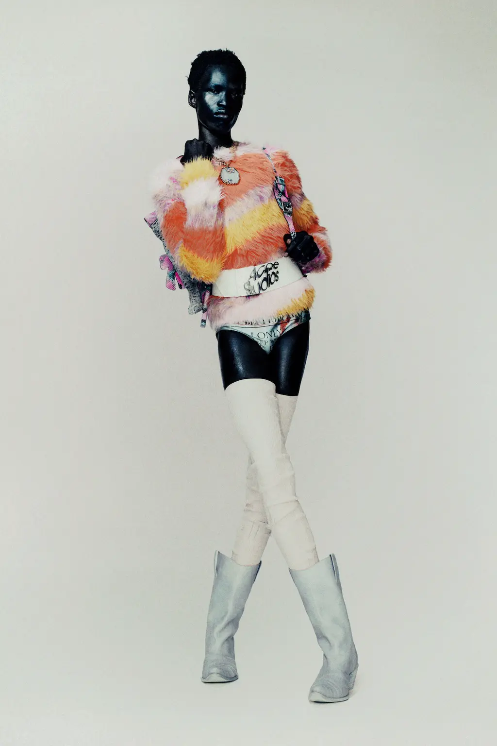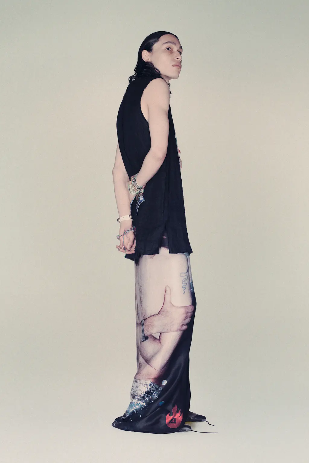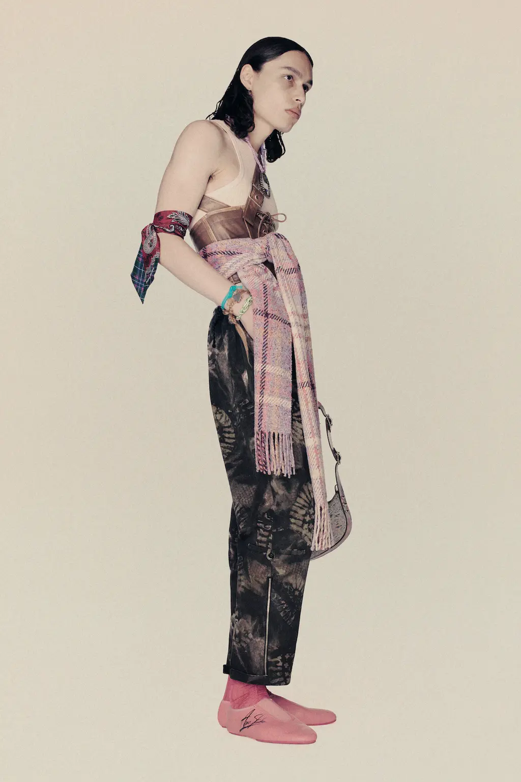 As such, his collection came together in a stylist’s dream of flea-market finds and the wardrobe wildcards we save for getaways. Talismans knotted with keys, miniature baseball shoes and ratty clumps of hair punctuated the looks, while harnesses made from swaddled scarves and hippy-dyed patchwork jeans – complete with lacing at the sides – added further chaos to the mix. It was unequivocally a lot, but the pieces encouraged a fuck-it attitude to dressing, where thrown-on and lived-in become tools for self-discovery.