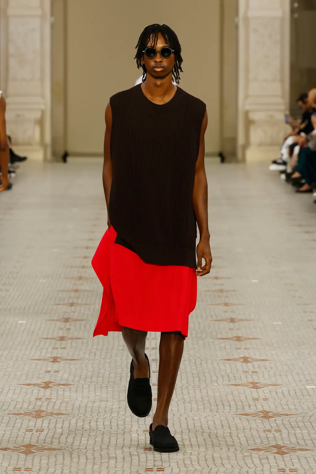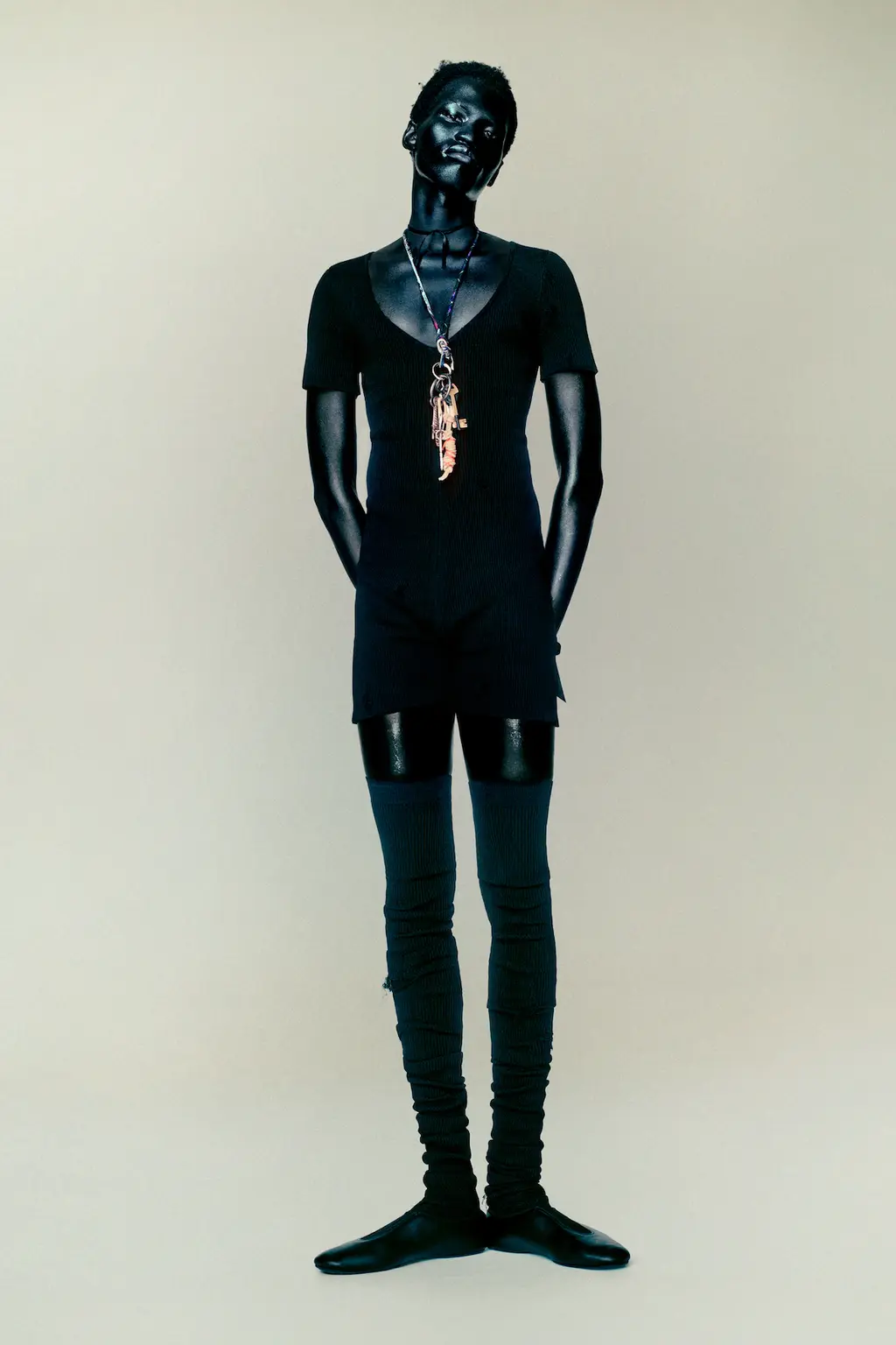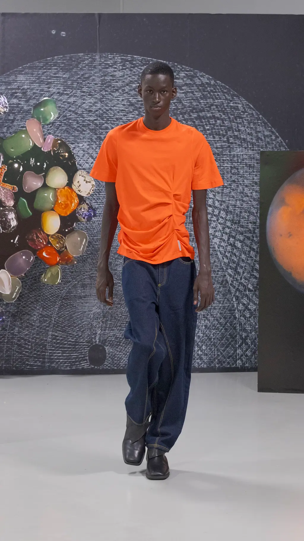 Your usual Saunders signatures came in droves, with T‑shirts pleated from the shoulders or gathered on the flank. As always, it goes back to one of her earliest goals, which is to present a softer side to Black masculinity, as well as manhood more broadly speaking. Here, haphazard scoop necks plunging towards the pec line and shirts pulled taut across the chest with tape did the heavy lifting. Subtler tweaks, such as lightly meandering hemlines on jeans, emphasised the form with sensual caress.