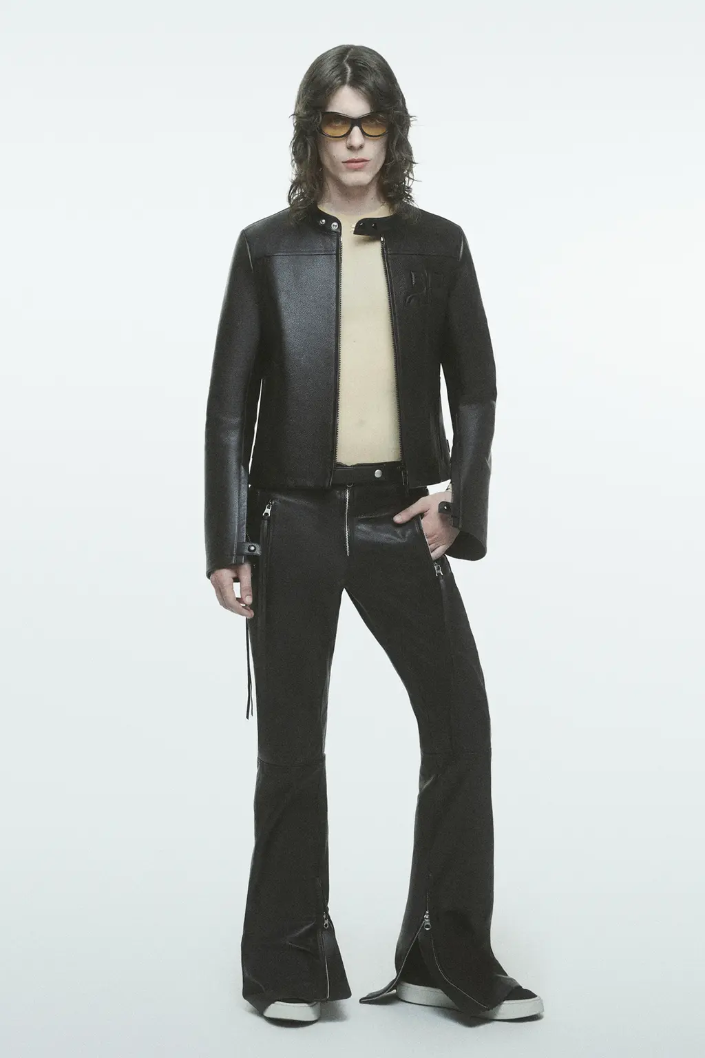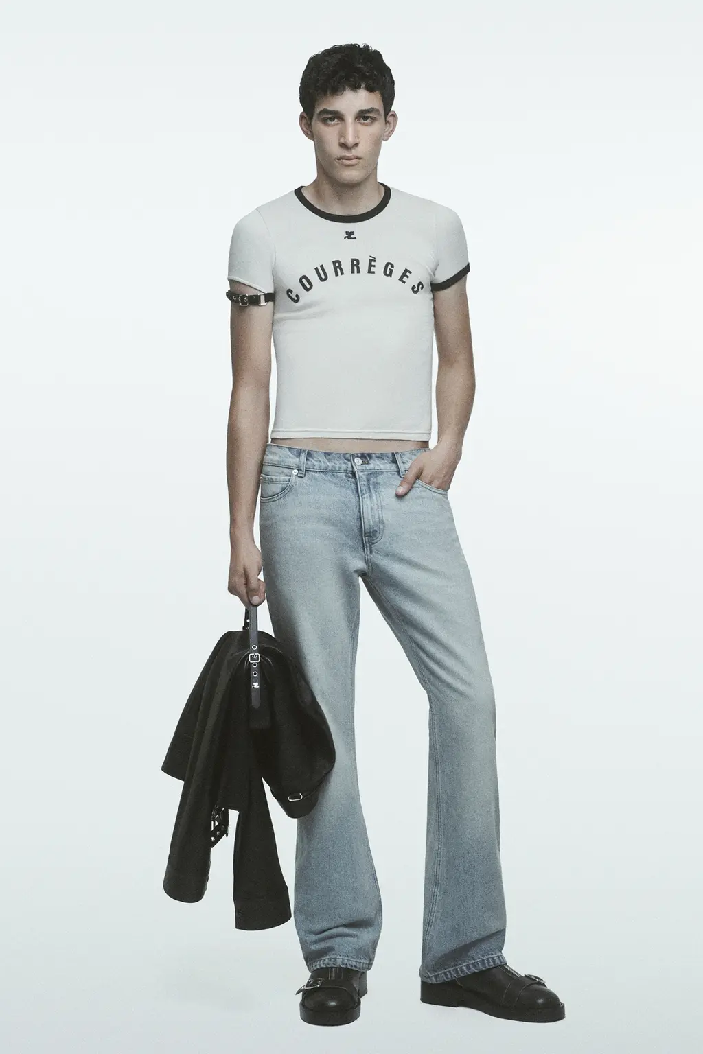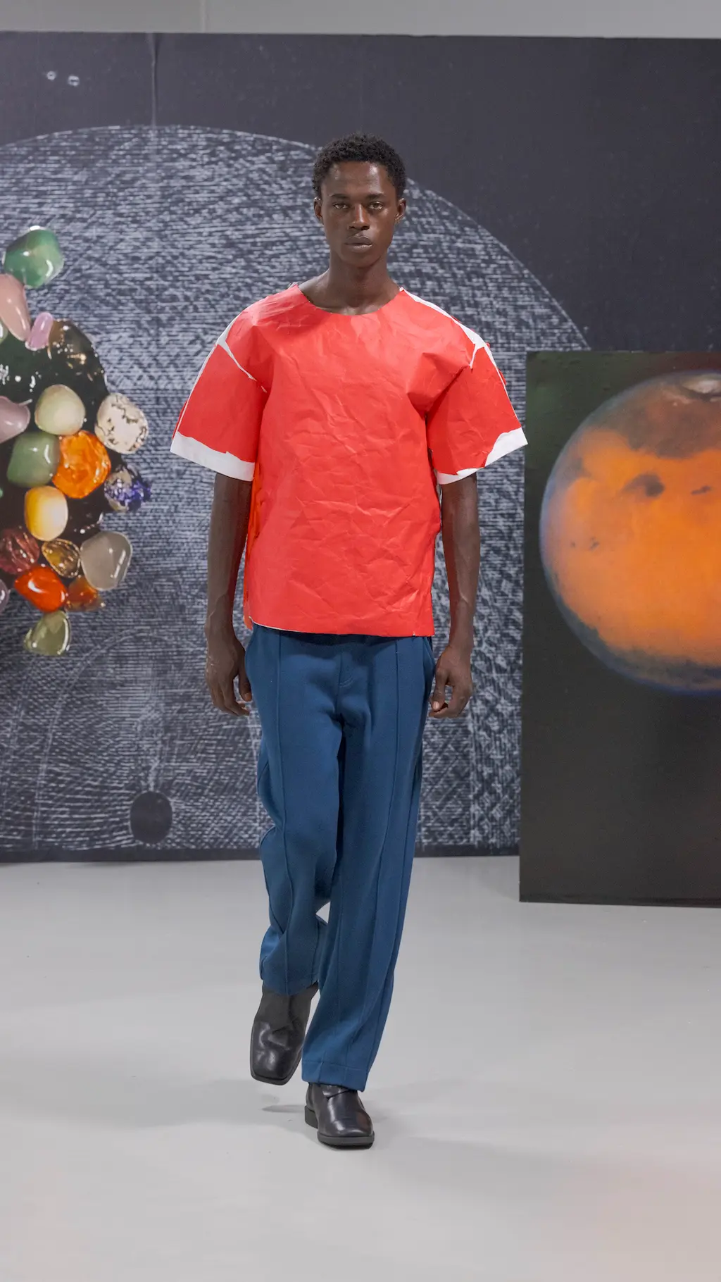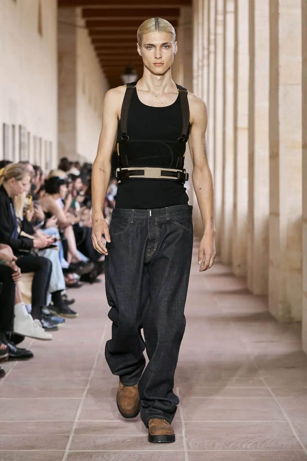 Your usual Saunders signatures came in droves, with T‑shirts pleated from the shoulders or gathered on the flank. As always, it goes back to one of her earliest goals, which is to present a softer side to Black masculinity, as well as manhood more broadly speaking. Here, haphazard scoop necks plunging towards the pec line and shirts pulled taut across the chest with tape did the heavy lifting. Subtler tweaks, such as lightly meandering hemlines on jeans, emphasised the form with sensual caress.