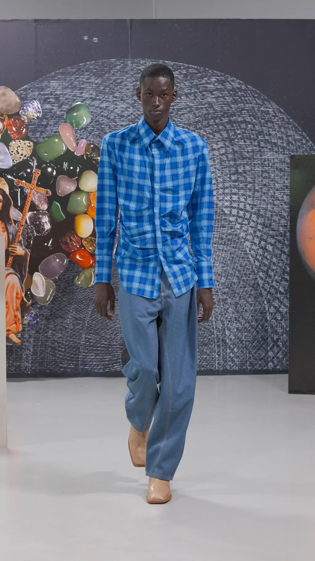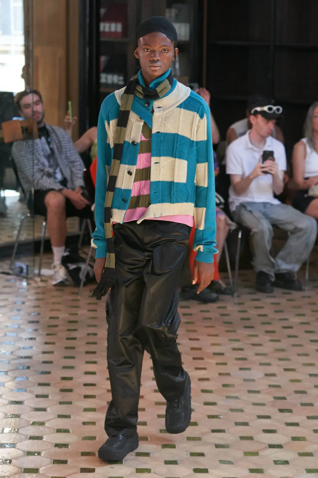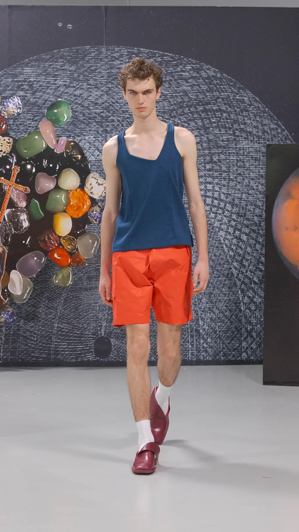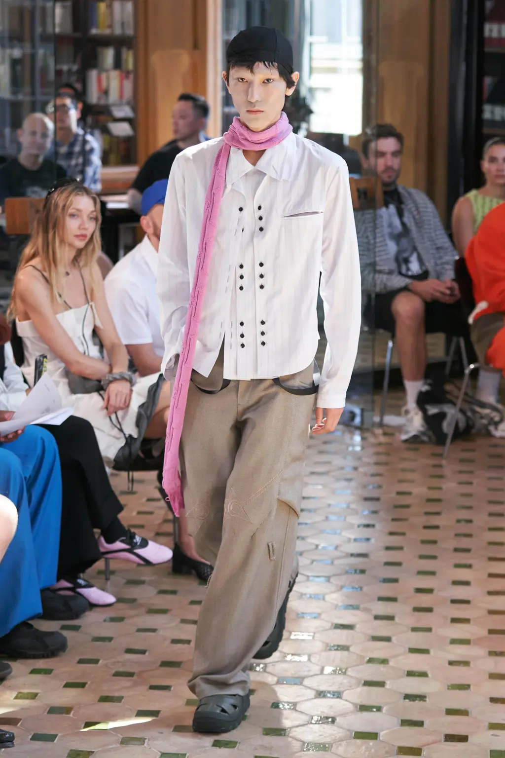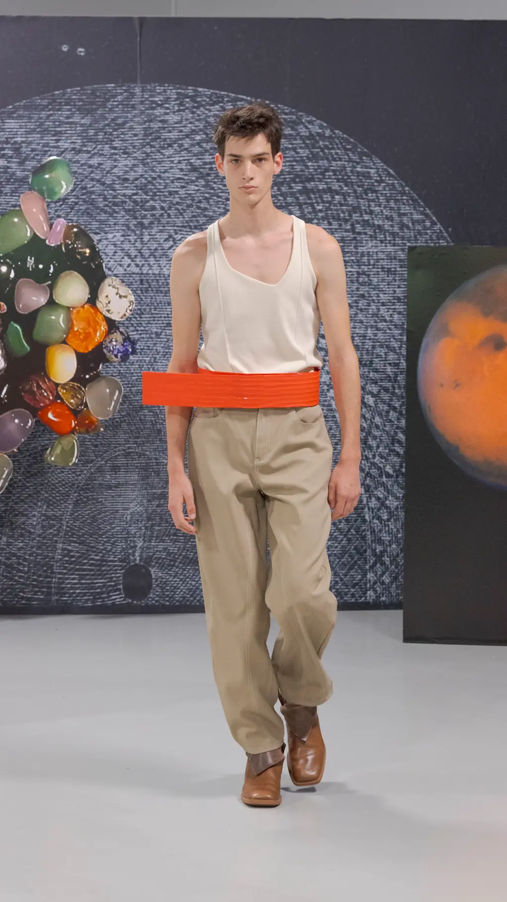 Like fashion’s equivalent of psychogeography, his SS24 picked and assembled disparate items, each telling stories of the city. Two-tone velvet acrobat suits in pink and blue recalled riverside drinks at sunset. Elsewhere, the floor-grazing skirt printed with pale hairy chests spoke of steamier evenings. Meanwhile, the alluringly tacky belt buckles, powder-blue cowboy boots and burnt-brown corsets smacked of the willing experimentation that comes when we’re on our holibobs. After all, who doesn’t need a woven friendship bracelet and some overdyed laced flip-flops to spice up their journey?