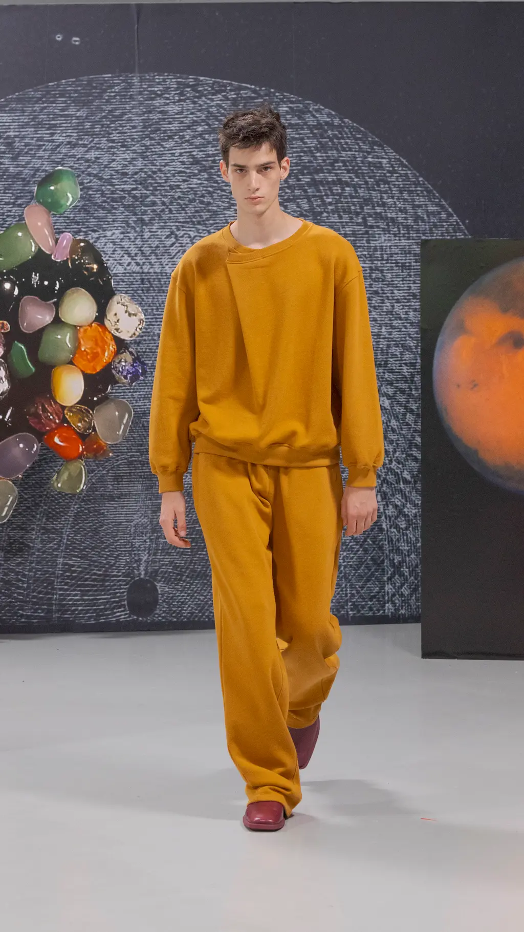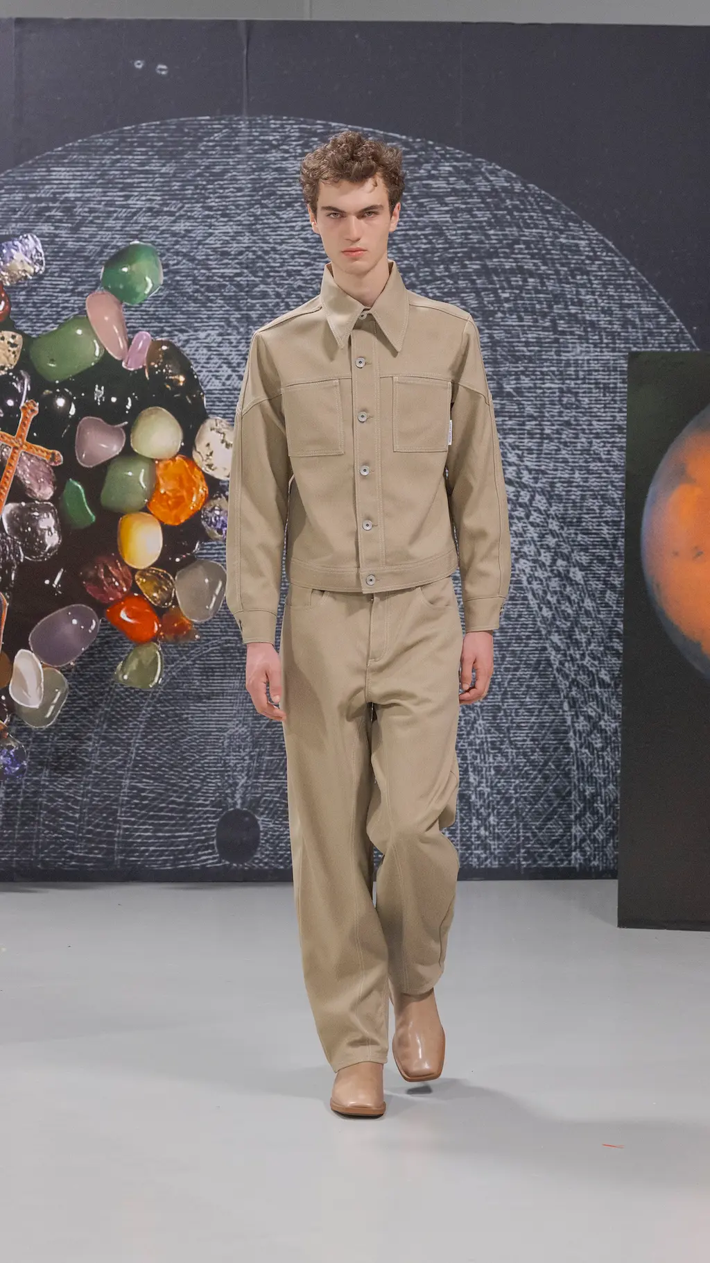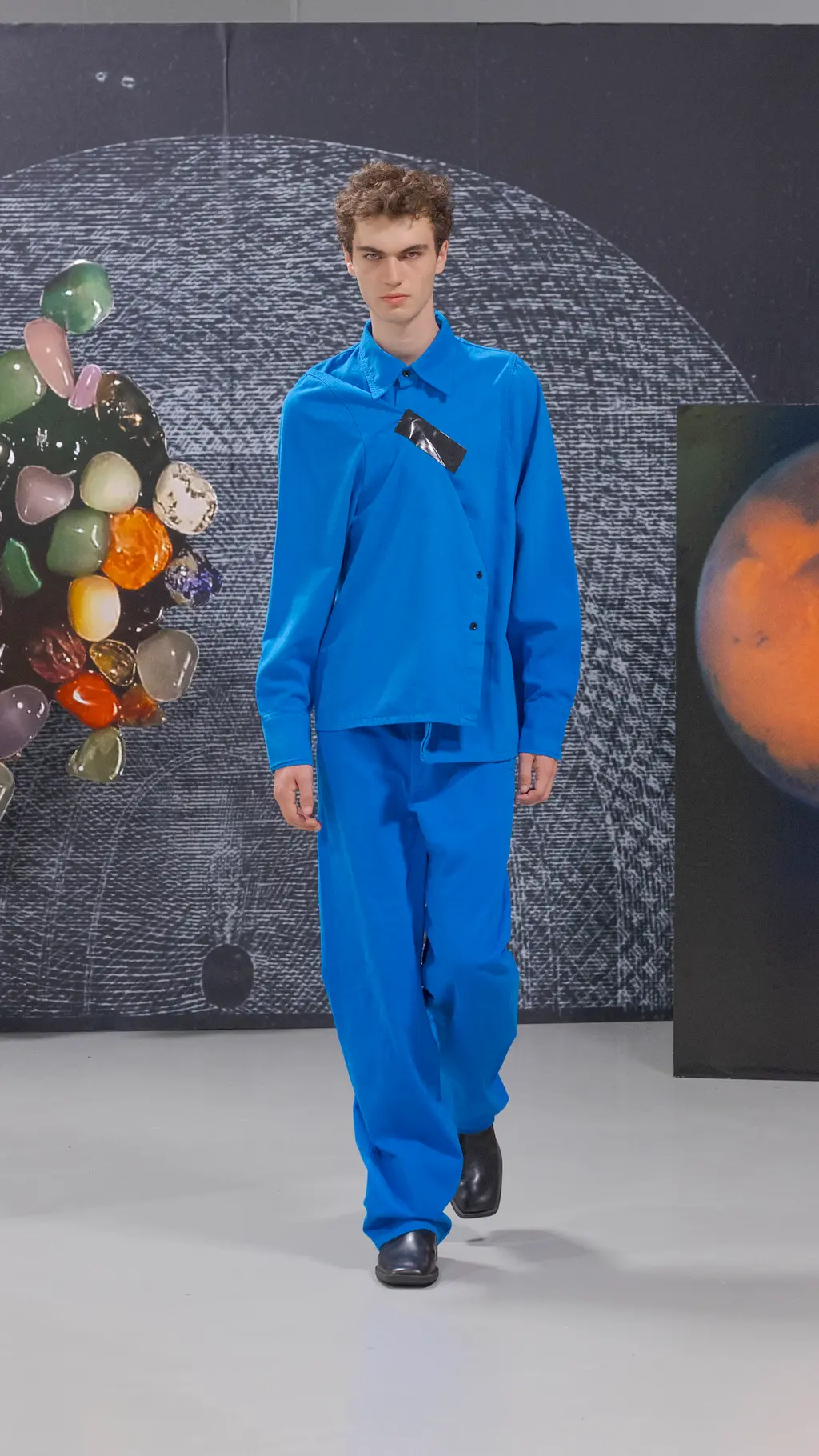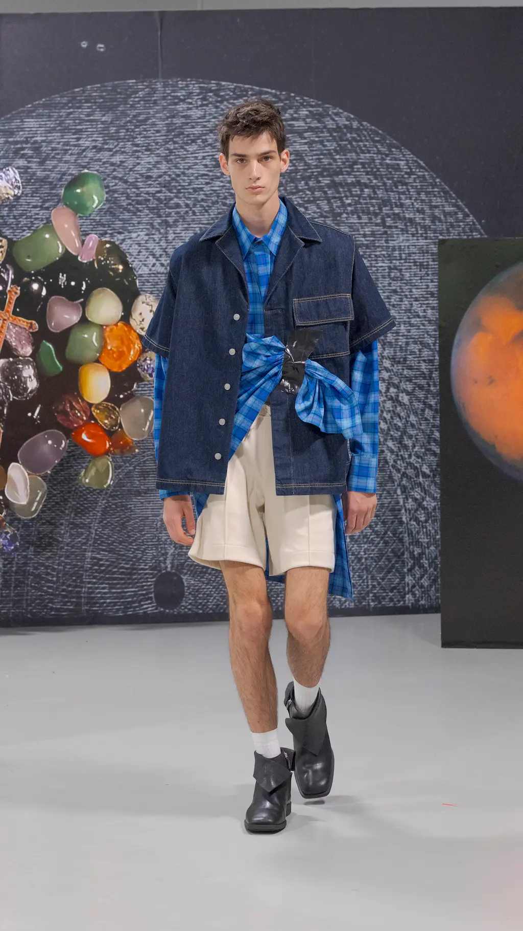 Humour was everywhere, but never at the expense of craft. In fact, the two co-determined one another. Leather trousers morphed into suede, while denim jackets were taut across the top to create collarbone pleats as if they were too small. Of course, they fit like a glove. That was just it: these were clothes we know and expect, but Anderson had completely shaken their formal foundations, spawning fashion for a parallel universe. On this planet, the knotted clusters of sparkle and trousers that swallowed and became one with shoes are everyday garb. Life on Mars? More like life on Loewe.