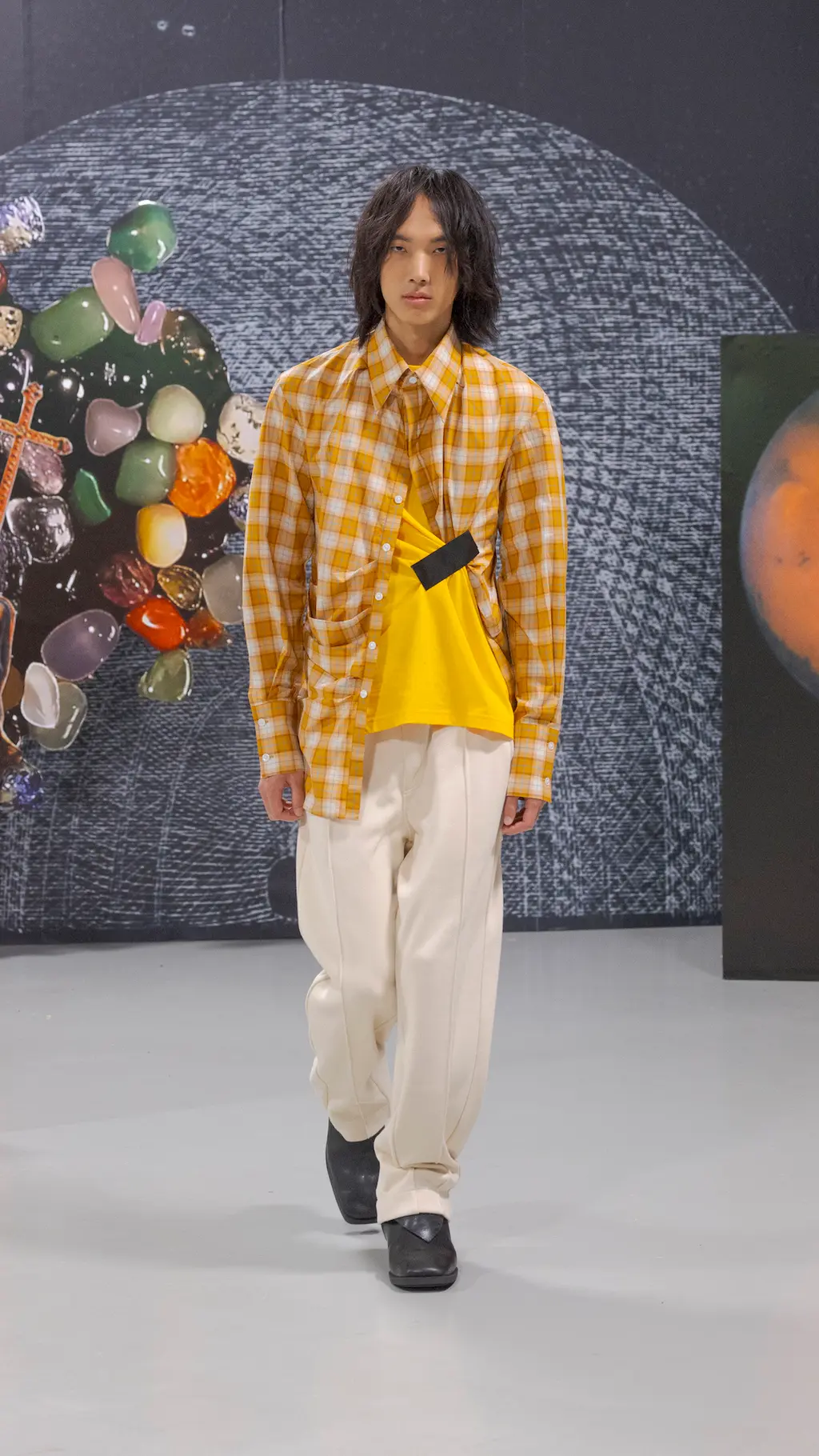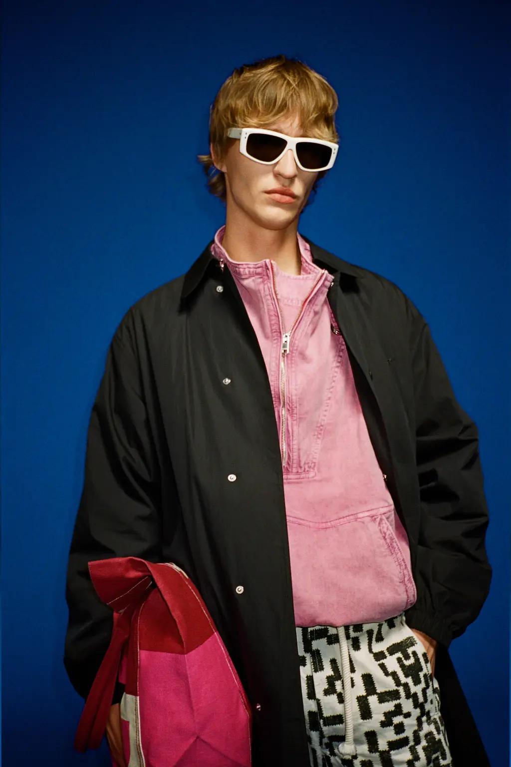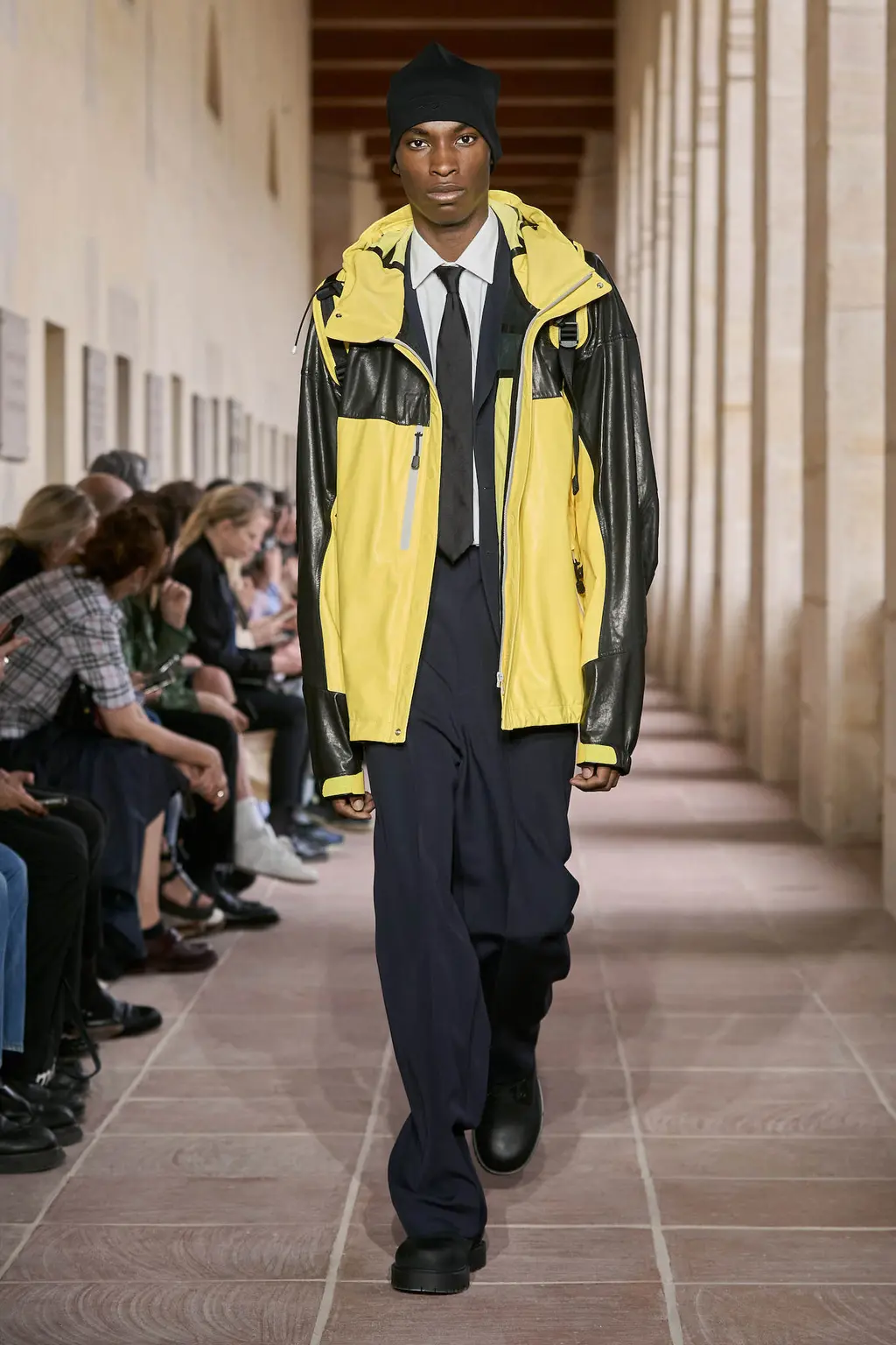 Indeed, as the collection progressed, this school kid kicking out against the bondage of bourgeois education appeared in other sartorial rebellions. The oversized tape-seam coats in lurid yellow and black colourways that covered a tie and shirt below were a prime example. Elsewhere, the undersized 3M jacket felt like the ultimate uniform loophole. Technically it’s grey, but it’s flashy effect would bring any schoolmaster out in hives.