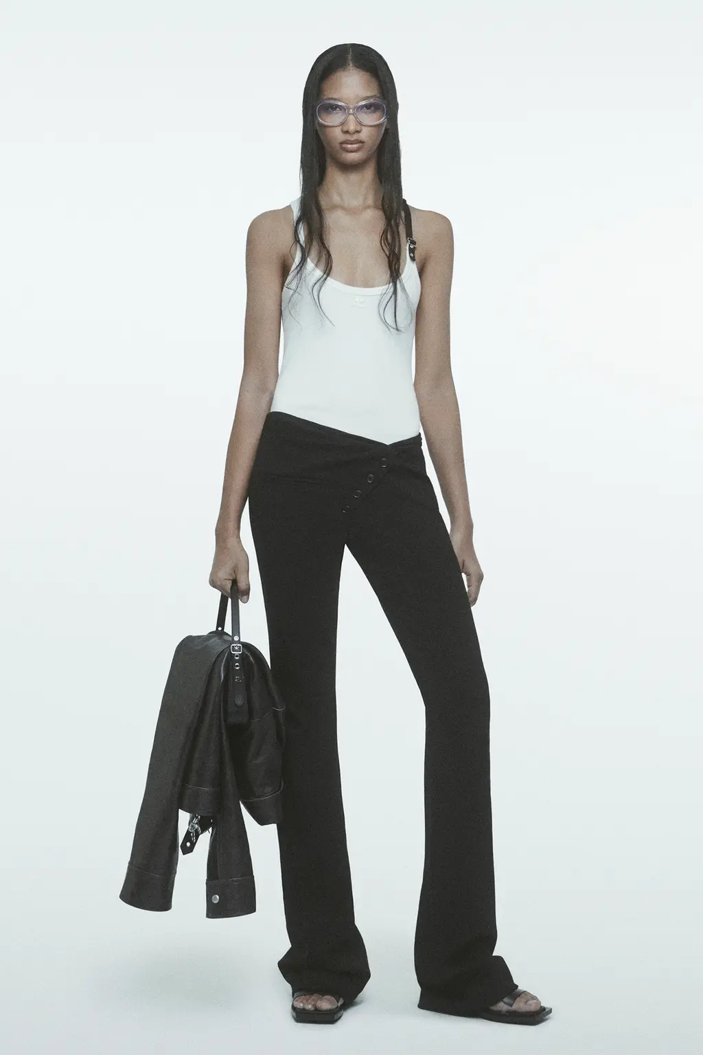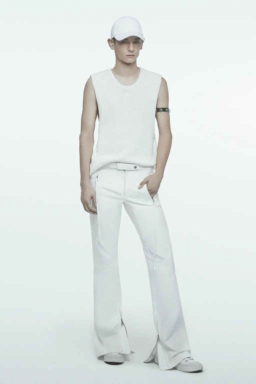 Sure, the belted leather trews with tassel zips and flies without plackets – ideal for darkroom efficiency – were ravewear embodied, but the heavenly hooded overcoats and exposed button jeans in white felt too loose for the night. Wholesome summer evening with a rosé in hand? That’s more like it. And your lazy Sunday the day after the night before came courtesy of a mid-’00s denim skirt and flared jean combo, and thick woollen knitwear, sliced from the underarm to the hip.