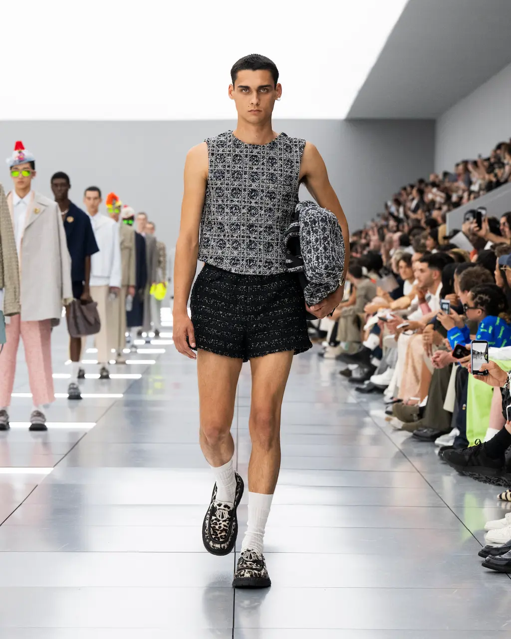 Fashion shows often make us dream, think or fantasise, but only sometimes – just sometimes – do they completely upend our basic understanding of clothing. Succeeding in the latter and all of the above, Jonathan Anderson’s latest Loewe collection was this season’s visual mindfuck, serving up disco bankers and the sartorial equivalent of walking Tetris blocks.