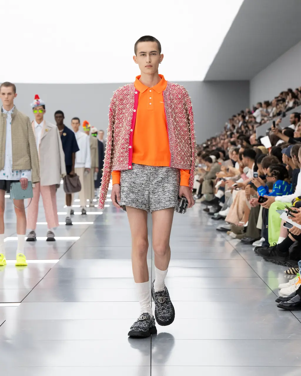 As for the tailoring (tick!), this moved away from the swaddling confections Kim’s Dior has become synonymous with, swapping a svelte cut for something a little more prep-school. Downstairs, the trousers were cropped at the ankle and generously fitted, swishing in the same motion as the Oxford bags Northern Soulers wore in the ’70s. There’s your subculture.