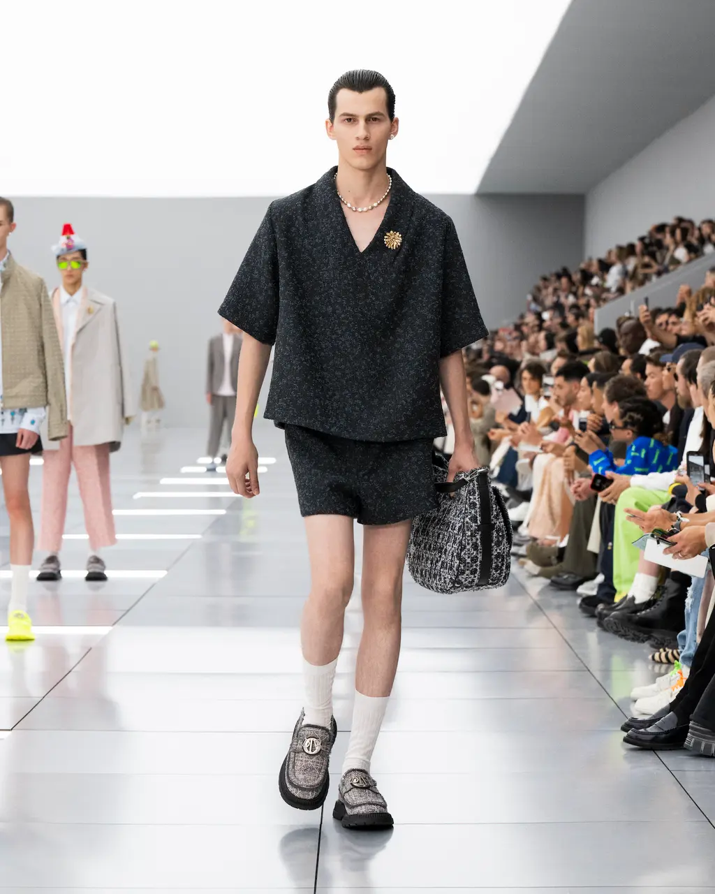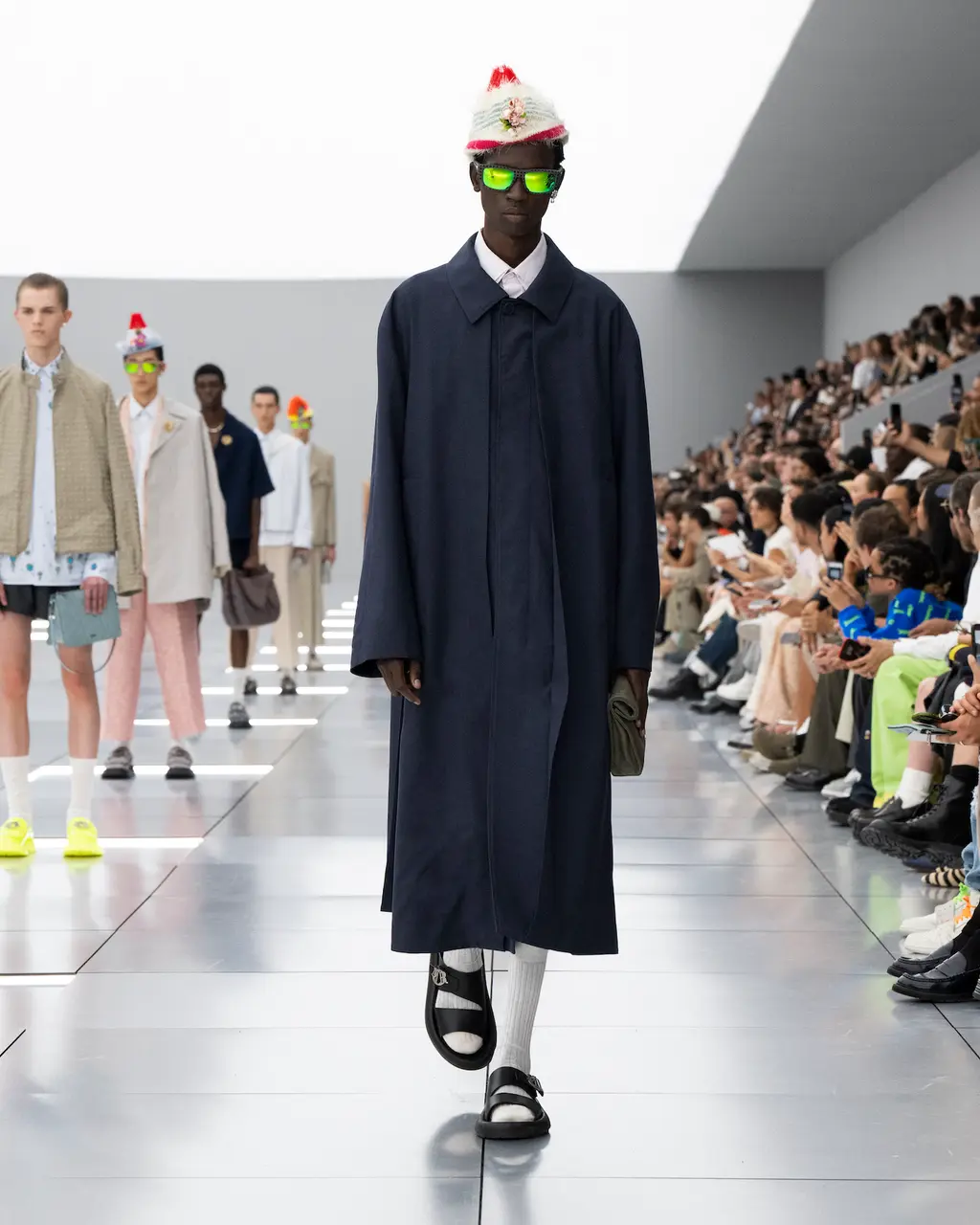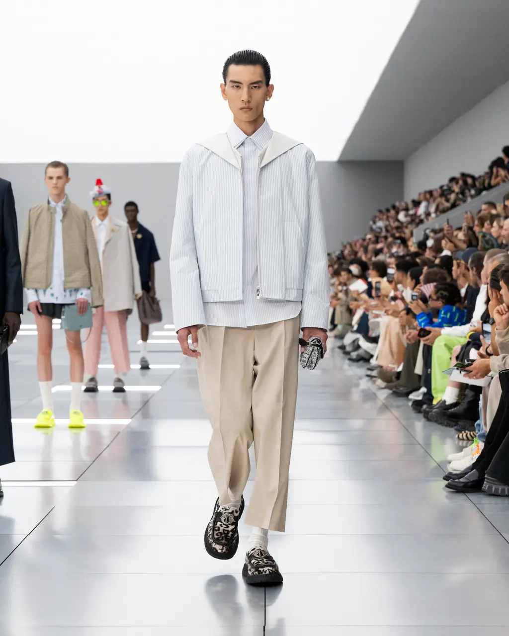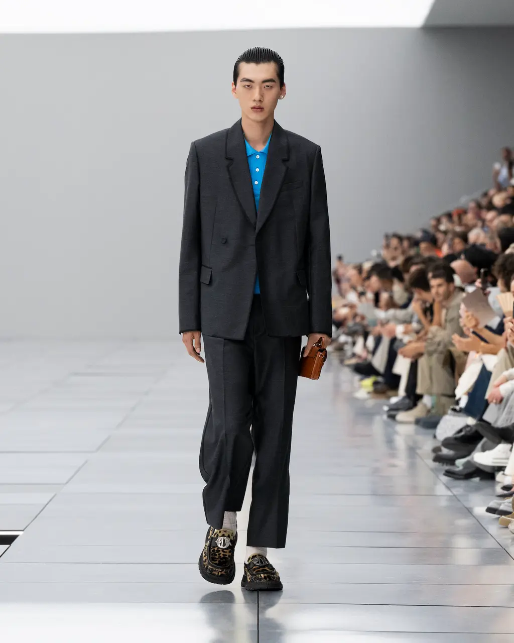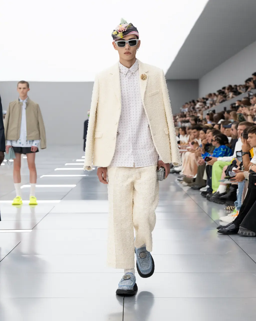 With that said, the prim and sissy cardis felt boldly effeminate, akin to the pieces you’d expect from an early salon show. Clearly, this was intended. “Dior is an haute couture house. At the heart is silhouette, shape, technique, and fabrication of the very highest order,” Kim explains in the show notes. “It’s a culture we have inherited from womenswear past and applied to menswear present.” Aha! That explains the Lady Dior letters transposed onto loafers, as well. Now, bring on the next five years.