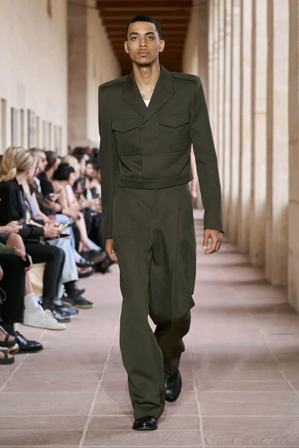 Showmanship was ticked off first. Here, models literally rose from the ground, emerging like prototypes of Kim’s sartorial vision. Stood on sterile tiling, the Dior boys filed down the runway one by one, each returning underground after showing their look.
