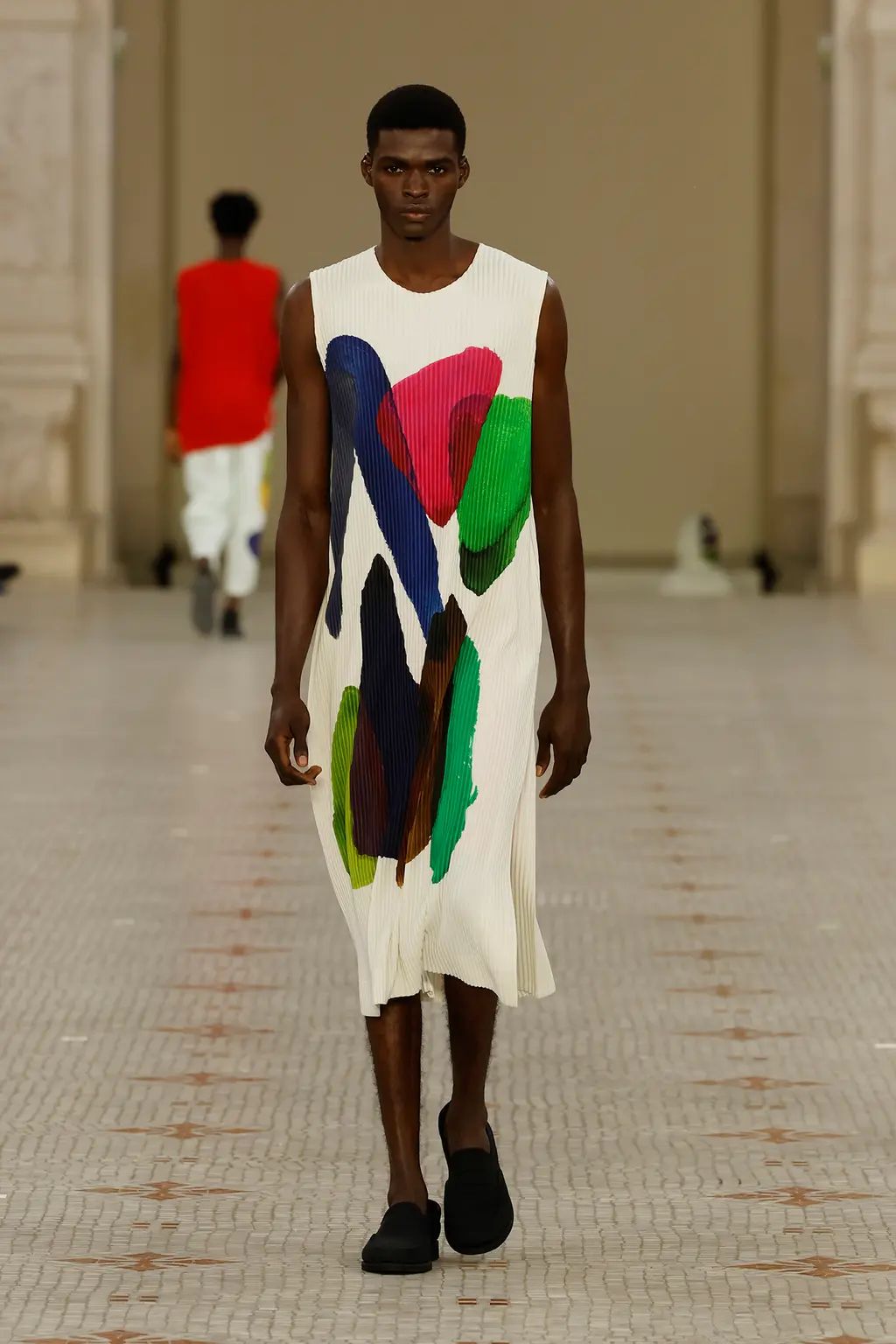 Sleeveless dresses which, when flat, appeared rectangular, morphing into fluid, undulating cloth and gathering lightly between the thighs and cosying up to the waist. Culottes with notably larger pleats bounced and shimmied around the leg in a motion distinct to the tighter-pleated trousers in sunshine yellow, which instead swished and straddled the models’ fine pins. It soon became clear the fashion press and influencers in attendance were not just passively consuming pretty clothes as they flashed by, but instead, engaging with how they work.