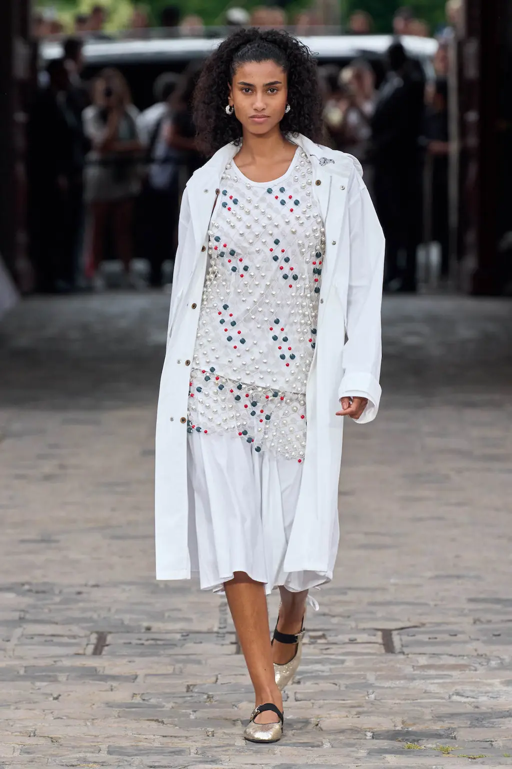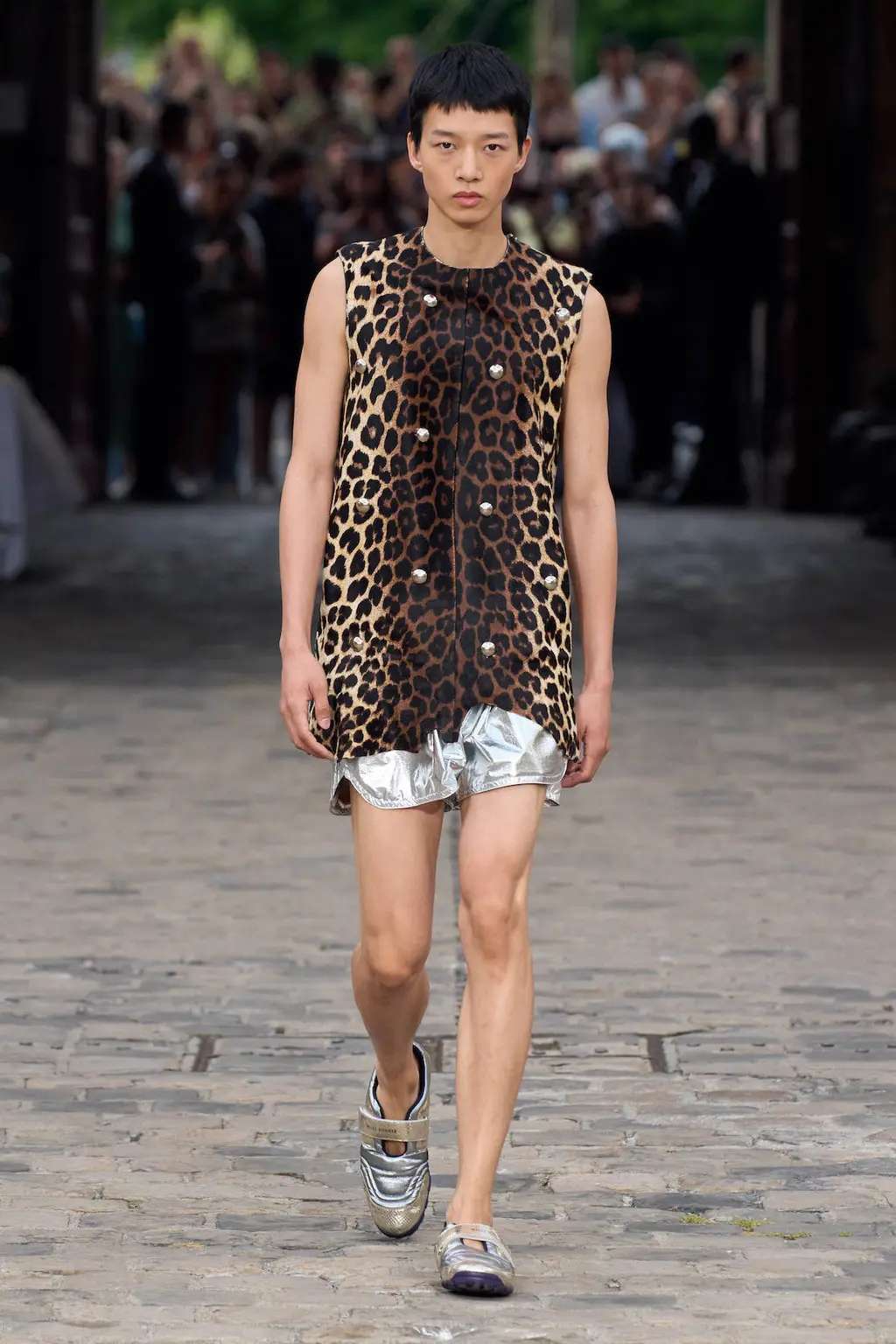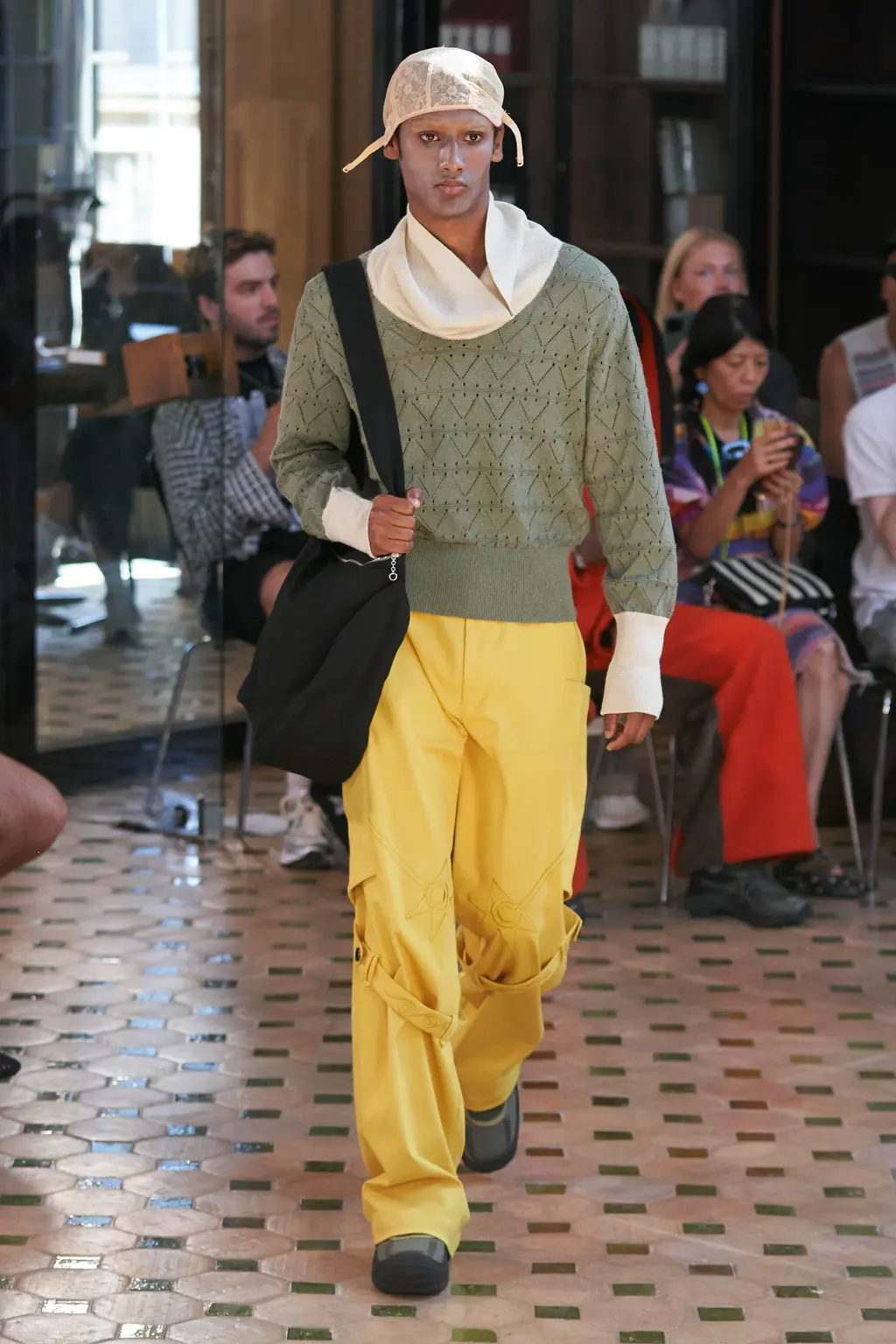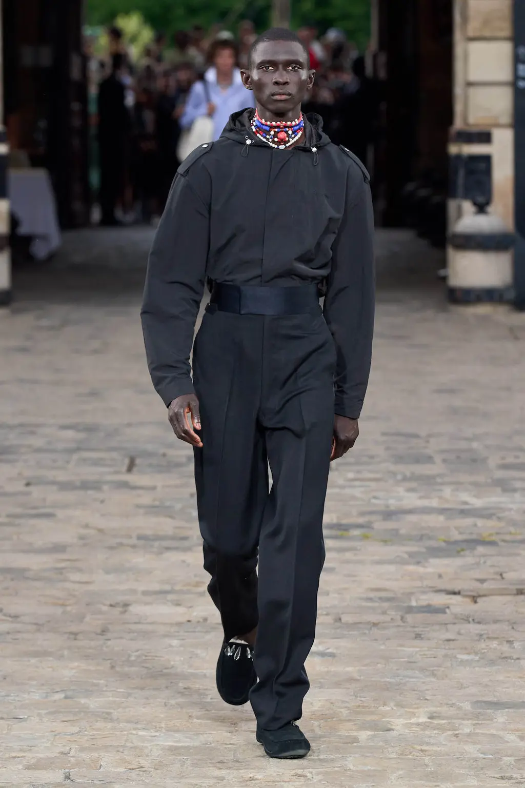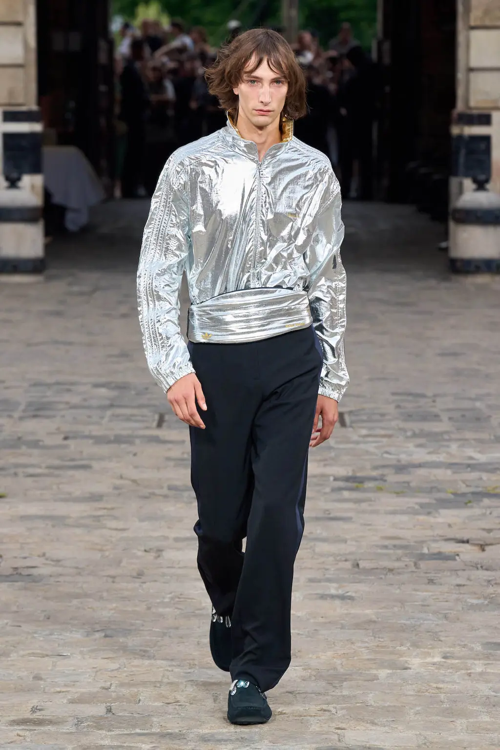 Craft, unsurprisingly, remained a fil rouge, appearing in the floral macrame T‑shirt and runner shorts as delicate beading, while fishing net dresses were dotted with artisanal Ghanaian gems. Silver lame shorts, Velcro sneakers and an adidas Originals zip-up with cummerbund, silk-satin tux trousers and bejewelled UGG slippers arrived later, skewing any dress code for the better.